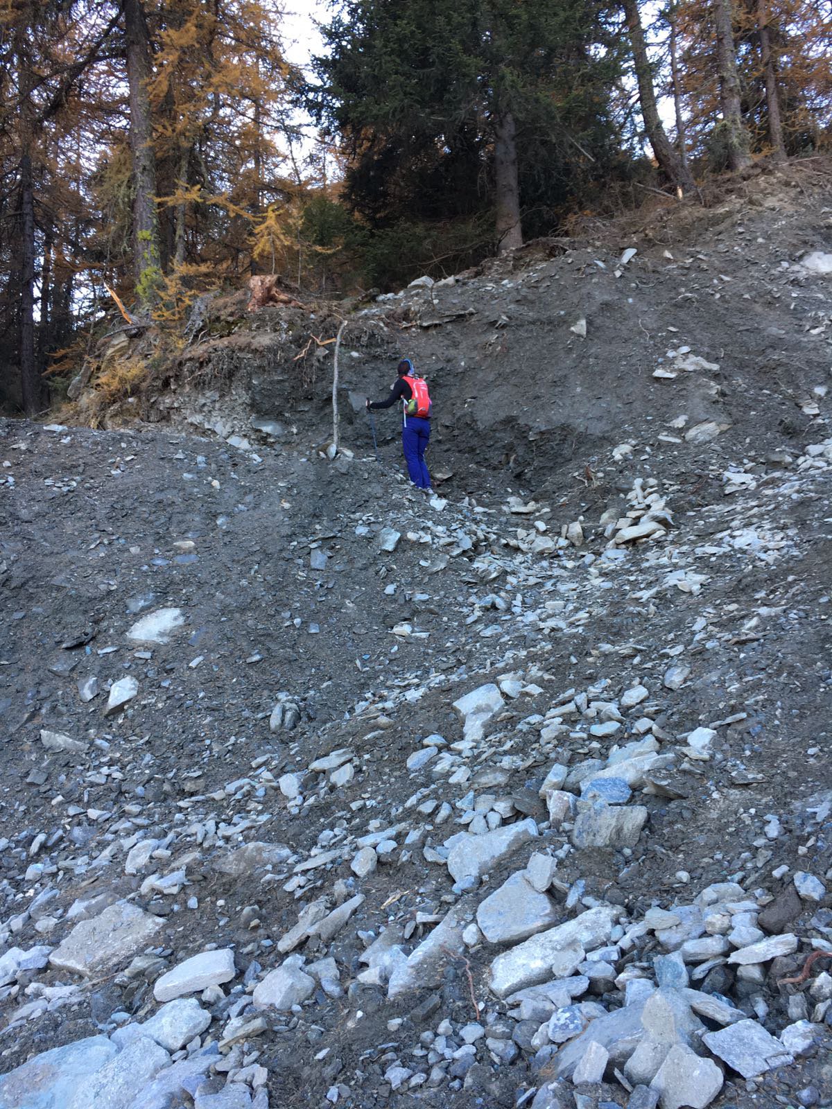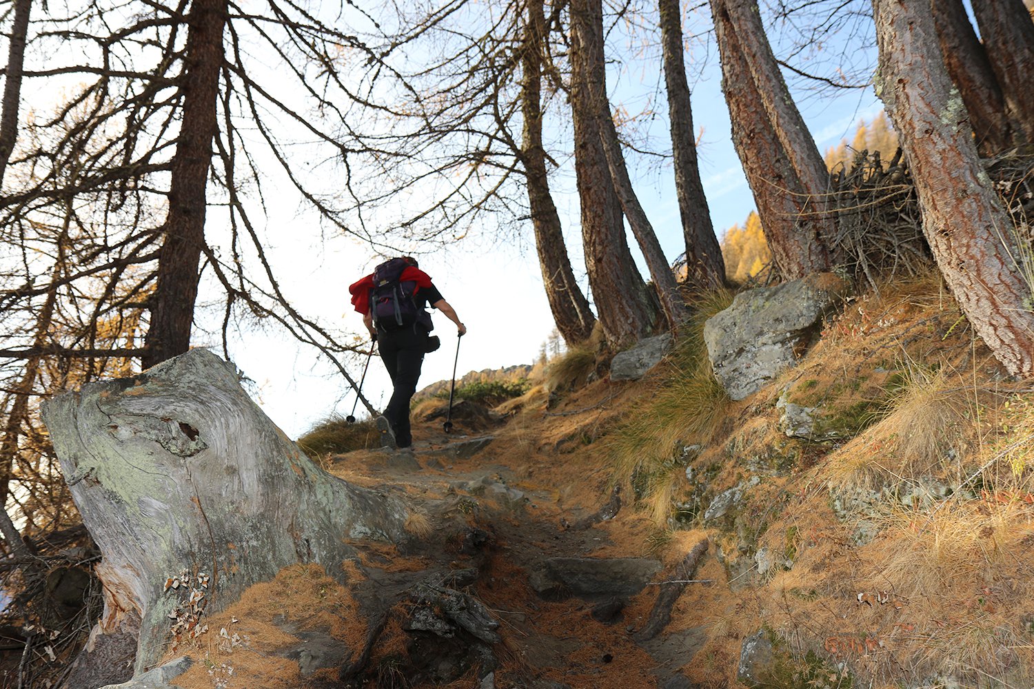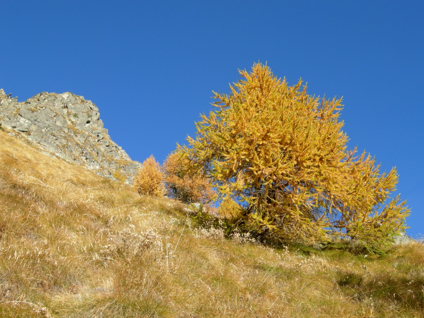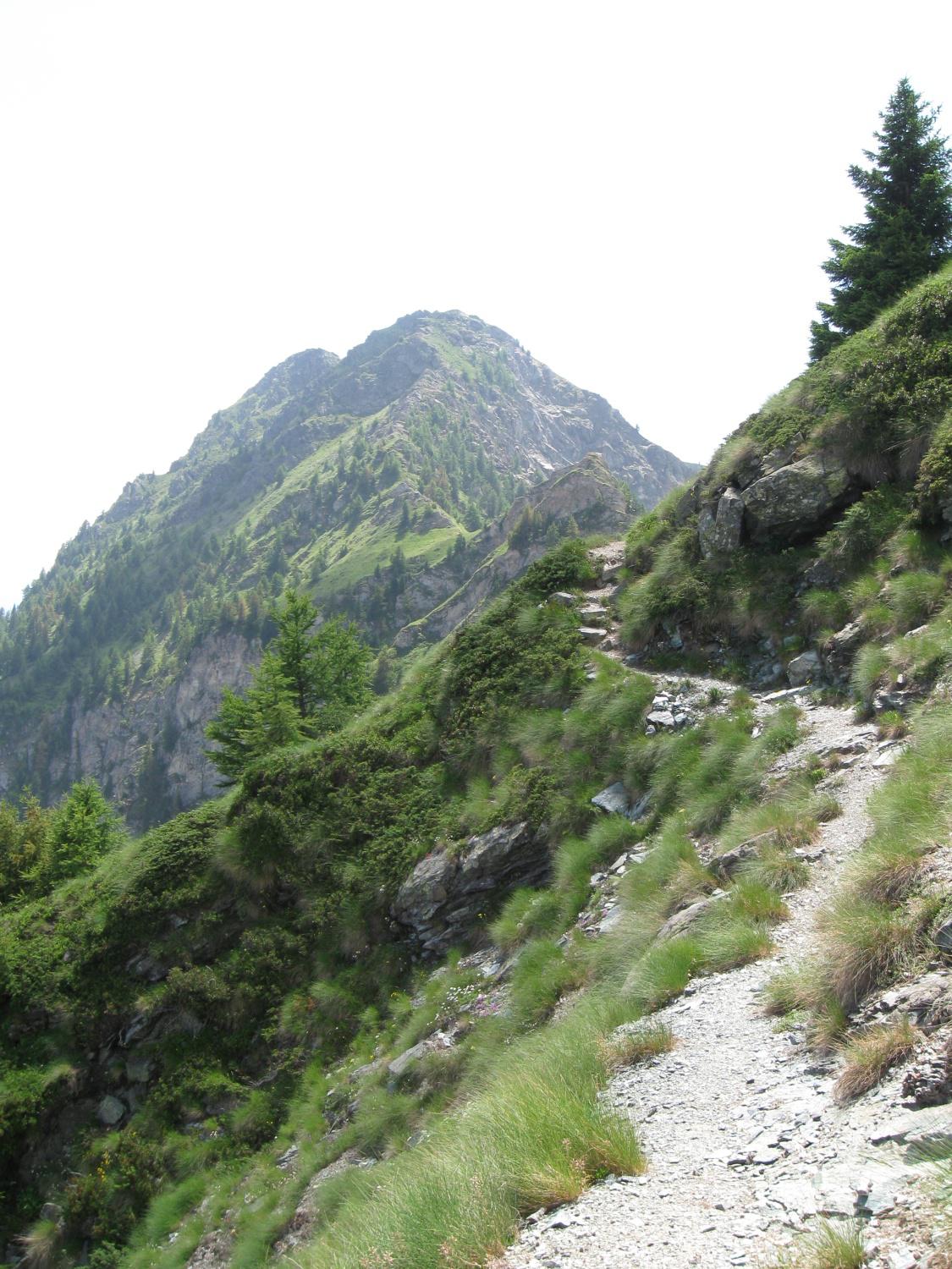 Raggiunta una carrareccia la si imbocca a sx e si riprende a salire con percorso mai monotono ; il sentiero traversa un pendio erboso , rientra nell’ultimo tratto di bosco e poi entra in un canalone erboso chiuso da salti rocciosi,lo si risale a tornanti e poi si obliqua a sx e si raggiunge il Col d’Aver (2330 m) dove si apre il panorama sulla valle centrale e sull’Emilius.