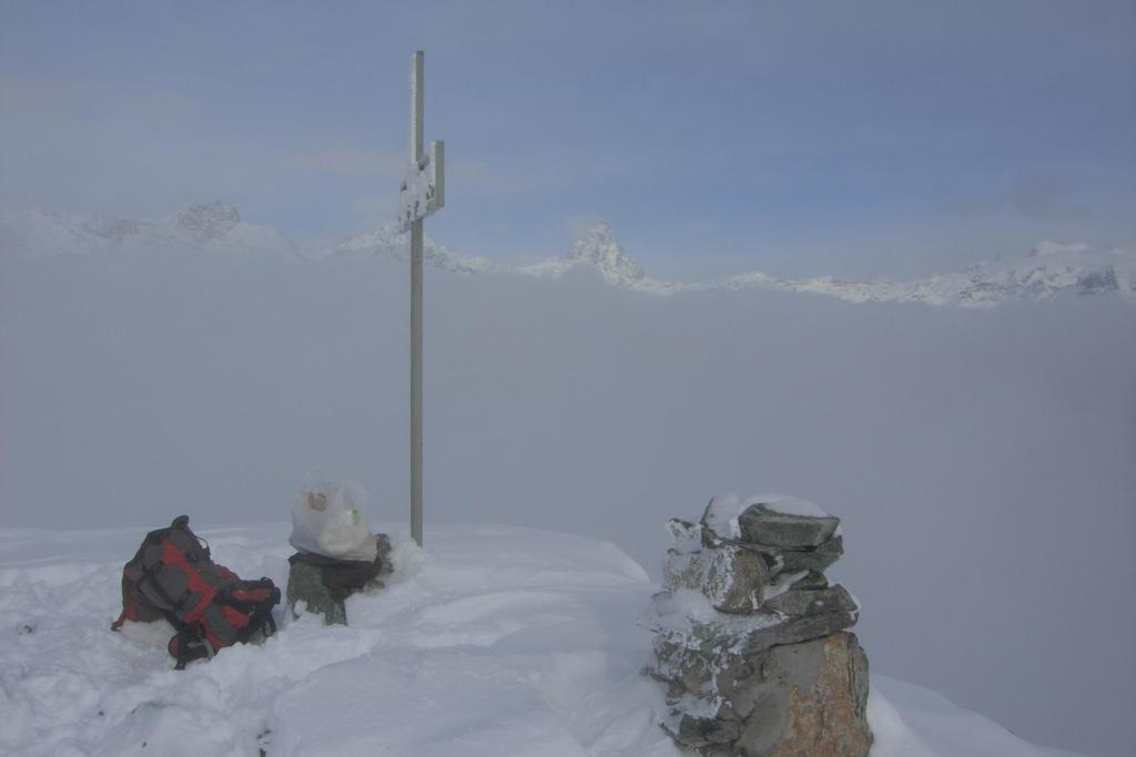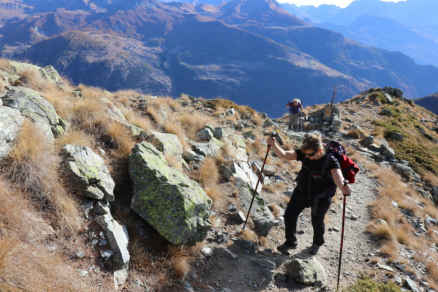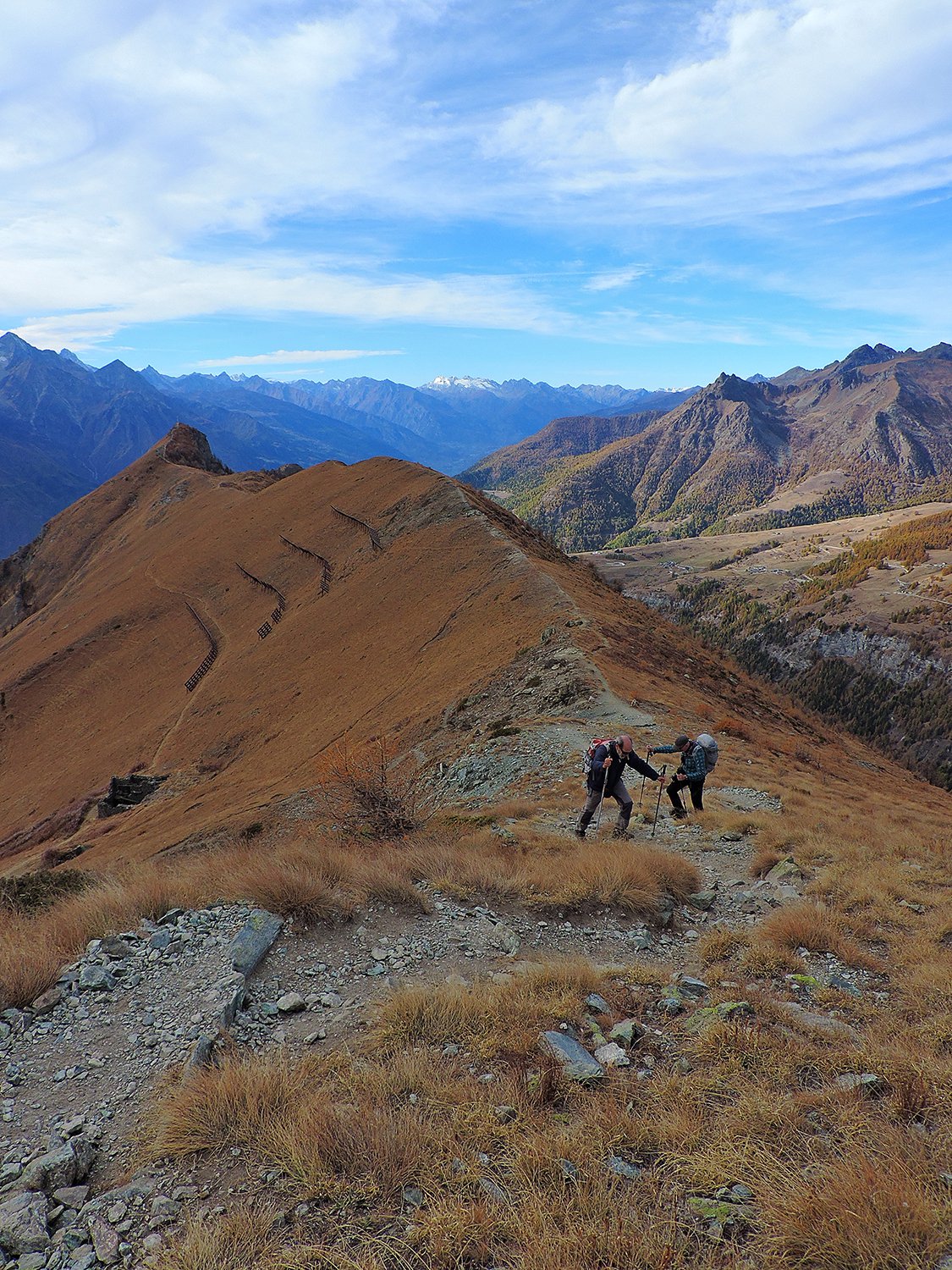 Per il ritorno si scende su un ripido sentiero sulla cresta opposta a quella di salita ( attenzione a qualche passaggio un po’ esposto) indicato dai segnavia n.9 ; il sentiero arriva al col Fenètre antico valico di passaggio tra la valle di St. Barthelemy e la Valtournanche.