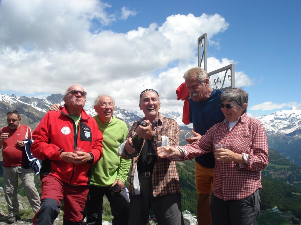 Gita celebrativa con 38 partecipanti del CAI Chivasso che hanno voluto festeggiare l’analoga ascesa alla Becca d’Aver compiuta esattamente 50 anni fa. E cinque di loro, a distanza di mezzo secolo, sono risaliti ancora una volta su questa vetta bella e molto panoramica: Ottavio, Pina, Claudio, Rinaldo e Bruno (organizzatore della gita che ha celebrato anche i suoi 50 di montagna con il CAI Chivasso, coincidenti proprio con la gita alla Becca d’Aver del 23 giugno 1963)sono saliti in vetta anche per ricordare gli amici di allora, quelli che non ci sono più e quelli che per vari motivi non hanno potuto essere presenti. Un brindisi con spumante Berlucchi e tanti dolci hanno allietato questa eccezionale ricorrenza. Il folto gruppo del CAI Chivasso ha poi raggiunto la vicina punta Longhede percorrendo il bel sentiero in cresta, per poi scendere a Torgnon dove con una degna merenda sinoira da Chez Maxim si è conclusa una giornata davvero memorabile.