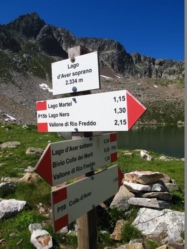 Io ho fatto il giro nel senso inverso a quello proposto, in quanto è più facilmente intuibile e visibile il percorso. In questo momento tra il lago d’Aver Soprano e il lago Martel, vi sono segnavia gialli e bianco/rossi sbiaditi che si alternano. Nel primo tratto dal lago soprano d’Aver al colletto quotato 2450 e da li il primo tratto di discesa è privo di traccia, anche se almeno il tratto fino al colletto è facilmente intuibile. Rari ometti e qualche segno qua e la comunque aiutano a non perdersi. Assolutamente sconsigliato in caso di scarsa visibilità. Poi si trova un sentiero che va tutto verso sinistra e che si perde nella fitta vegetazione in un passaggio obbligato da un grosso masso che si passa a sinistra. Si trova quindi una pietraia da attraversare e scendere fino ad arrivare al bel lago Martel, negli ultimi metri prima del lago ci si perde nella fitta vegetazione, ma si arriva bene. Da qui al Lago Nero inizialmente si ha una bella traccia che poi si perde, a naso si va alla ricerca del passaggio fino ad arrivare alla pietraia che lo circonda, la si attraversa per giungere sulle rive del lago. Dal lago un traccia con segnavia bianco/rosso riporta sul sentiero che scende dal Lago Martel e da li per sentiero al fondo del Vallone di Riofreddo. Secondo me la valutazione E tra il lago D’aver Soprano e il lago Martel e Nero è da modificare in EE, quindi proporrei una valutazione generale per il giro dei laghi di EE in modo che magari persone inesperte o poco pratiche si trovino nei guai invogliati dall’abbondante cartellonistica che indica il giro. Katia la gestrice del Rifugio del Malinvern dovrebbe andare a sistemare i segnavia e gli ometti entro la fine della stagione.