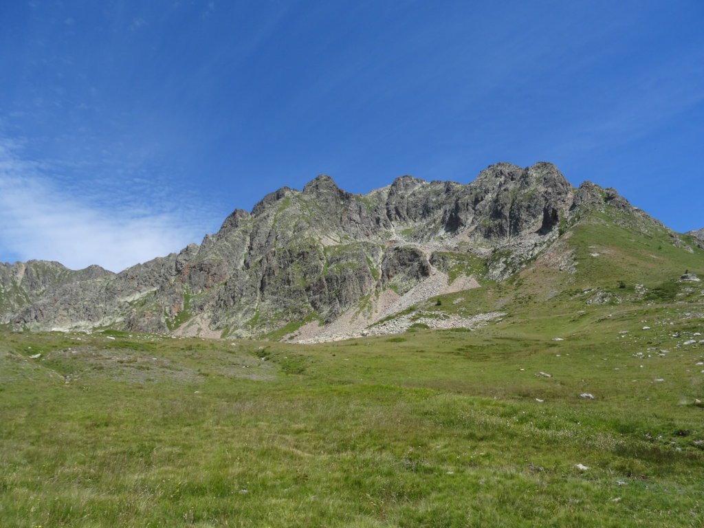 Per passaggi decisamente aerei ma non difficili si giunge sulla Cima Occidentale (2729m, ometto). Da lì si traversa alla Cima Centrale (2743, ometto) senza incontrare difficoltà quindi, ci si porta per prati verso la Cima Orientale (2745m).