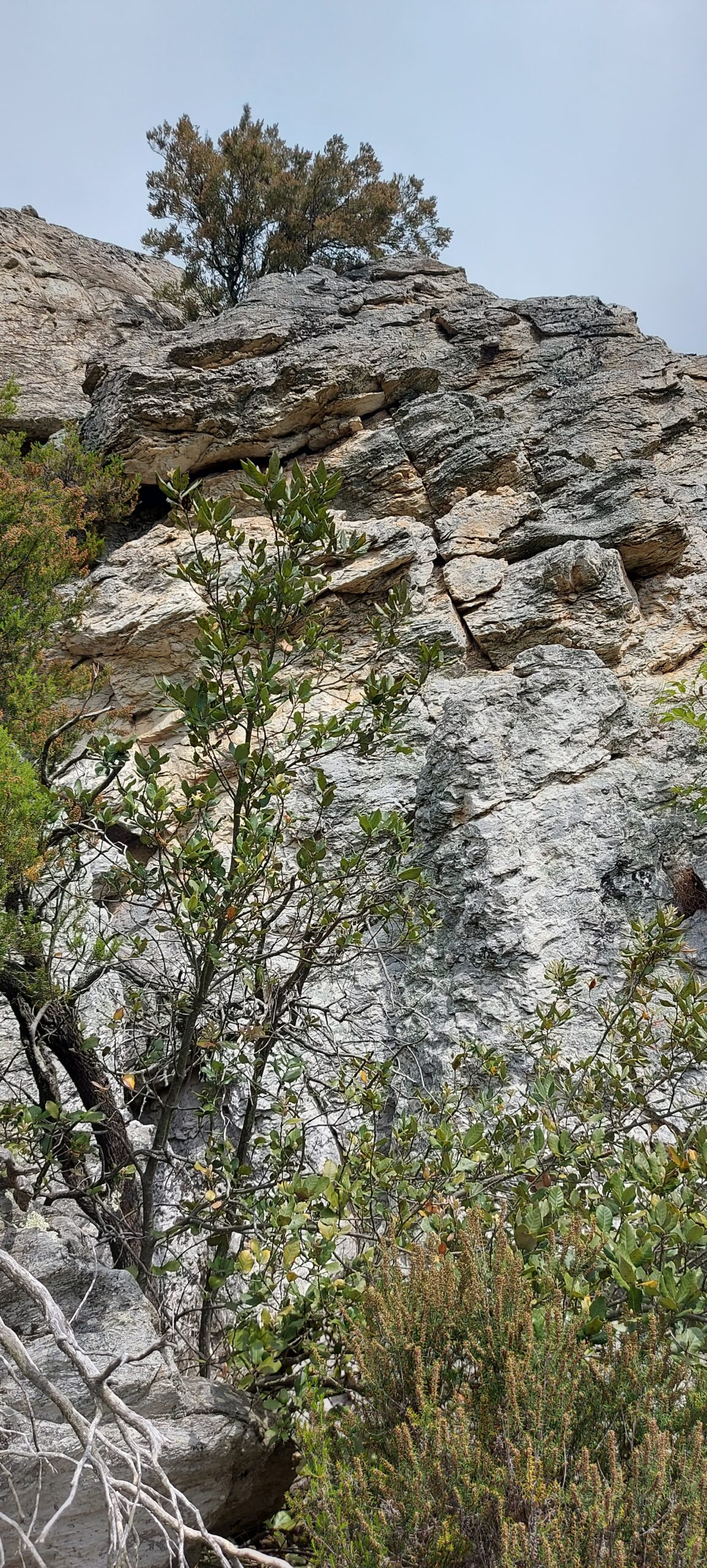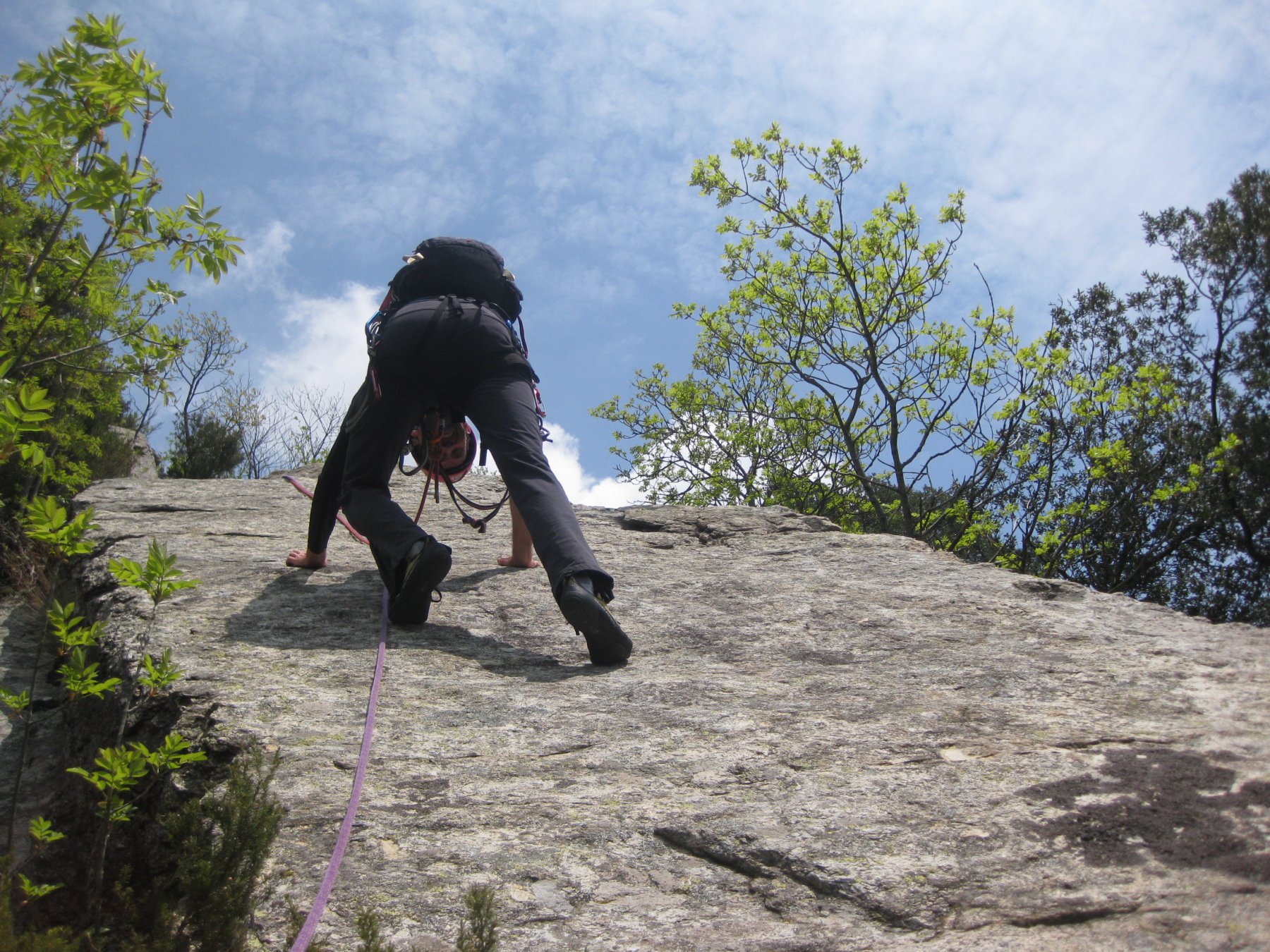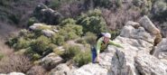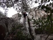 - 3 – Attraversata la breve selletta, si taglia leggermente a destra per bosco e ci si porta alla base di una scarpata rocciosa. Si sale lungo le rocce, con percorso un po’ disturbato dalla vegetazione, per placchette e brevi saltini (qualche passo di III°, nessuna protezione) fino al cocuzzolo roccioso che costituisce la sommità del Contrafforte Sud (spuntoni, 25 m).