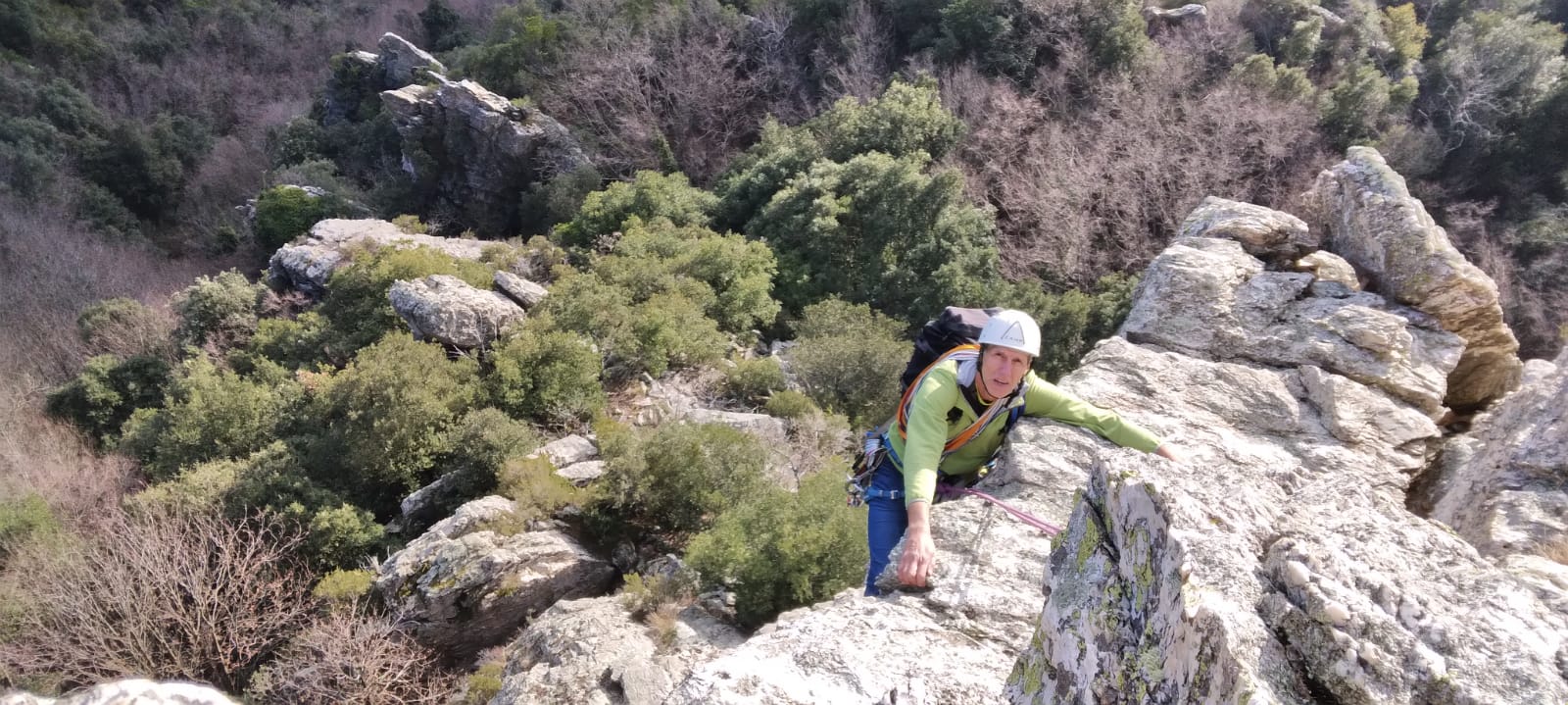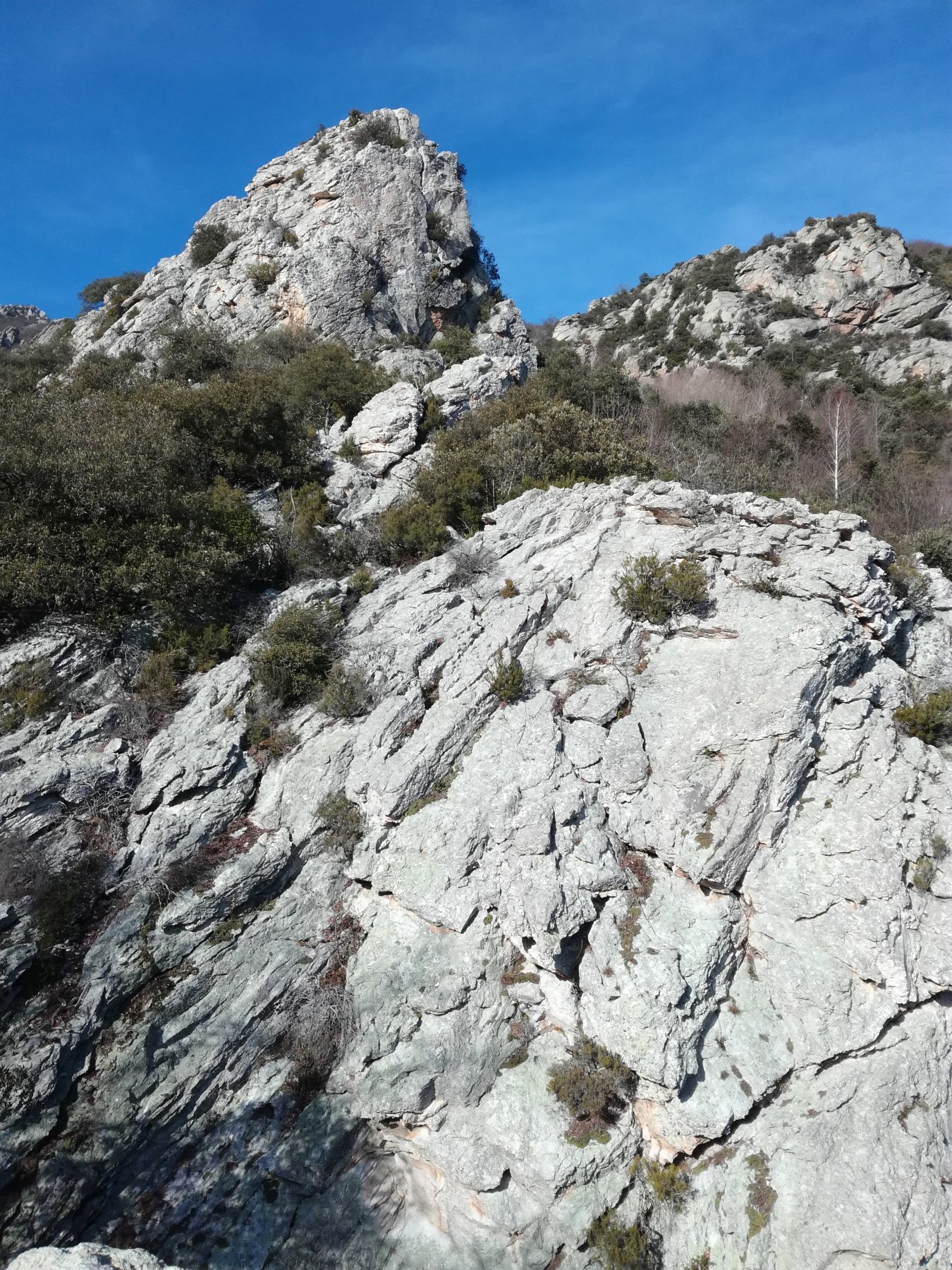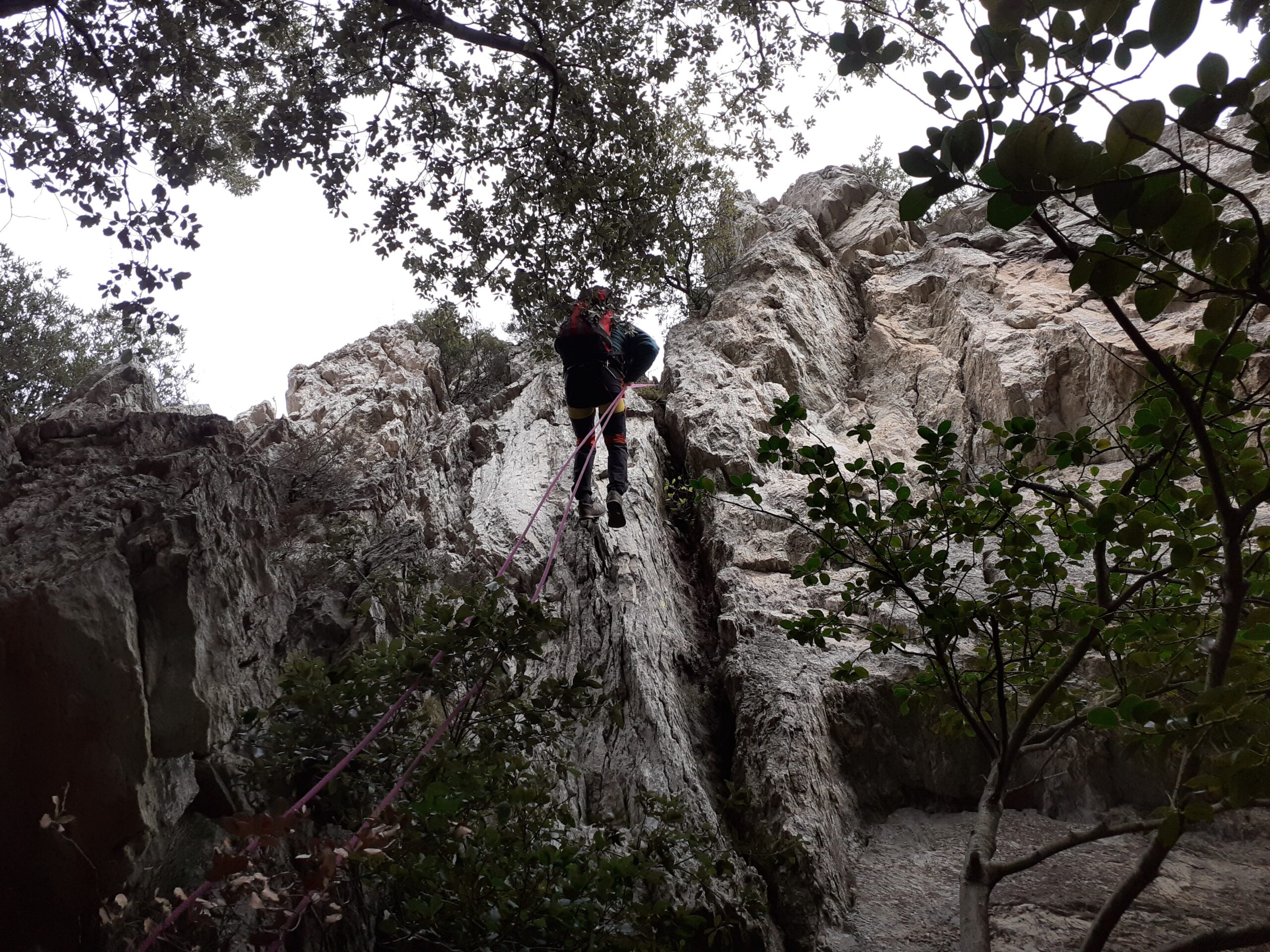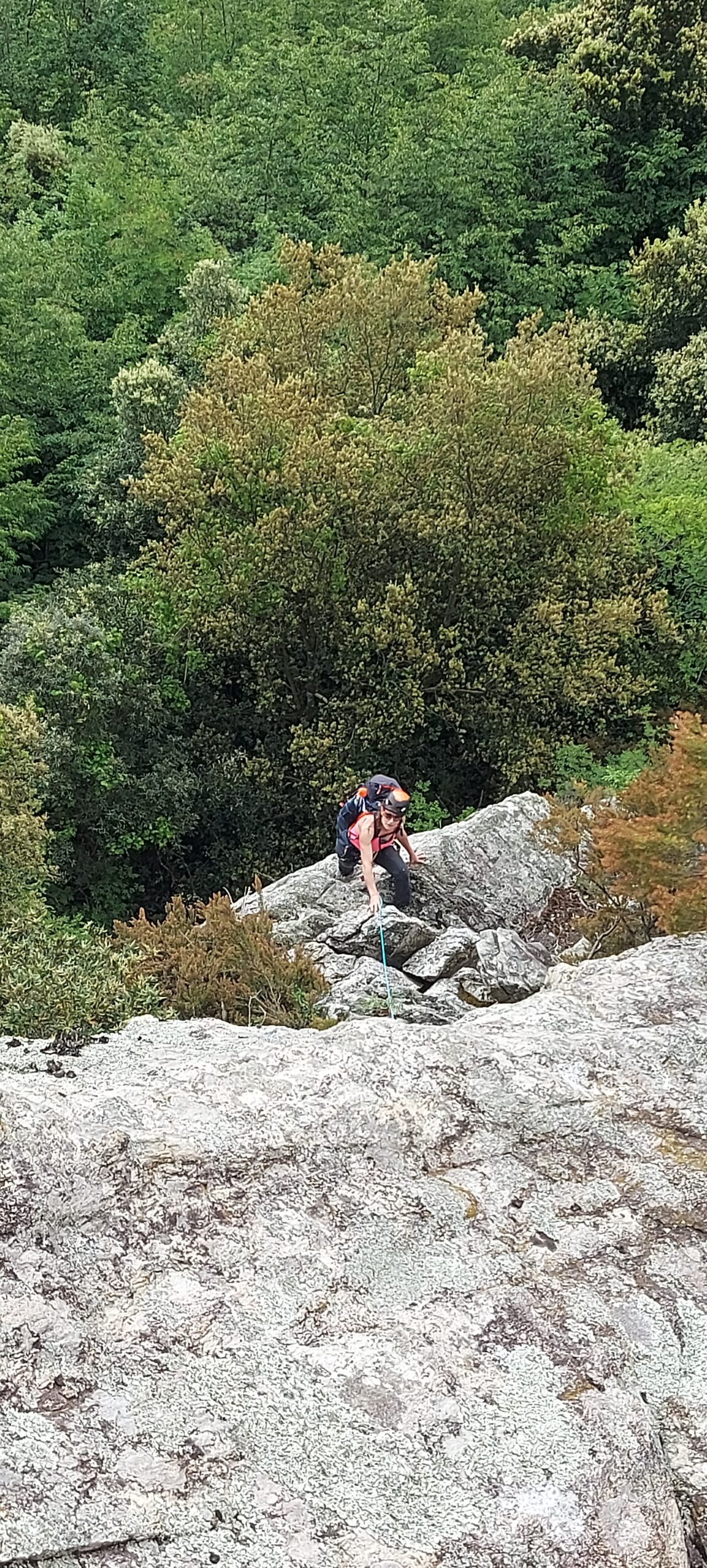 Per tornare al parcheggio conviene, dopo aver fatto una doppia da 20m nel versante Nord, portarsi al colletto Nord e da lì salire brevemente su traccia di sentiero, che si perde nel fitto bosco. Si traversa verso destra nella boscaglia e nel giro di 2-3 minuti ci si ricongiunge al sentiero diretto a Rocca dell’Aia, che si segue in discesa per incontrare il bivio dell’andata. Da lì a ritroso al parcheggio.