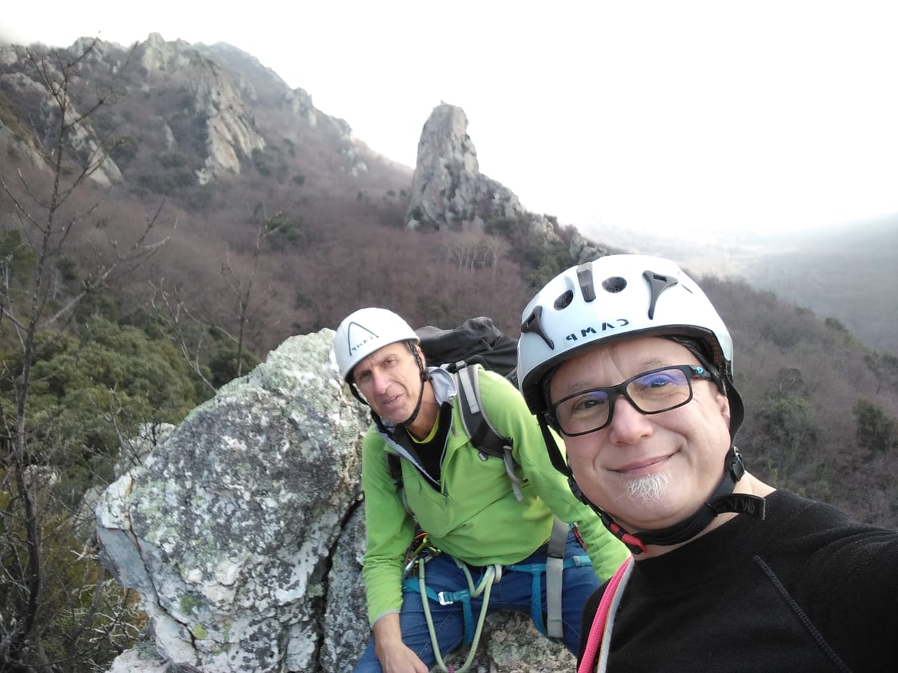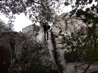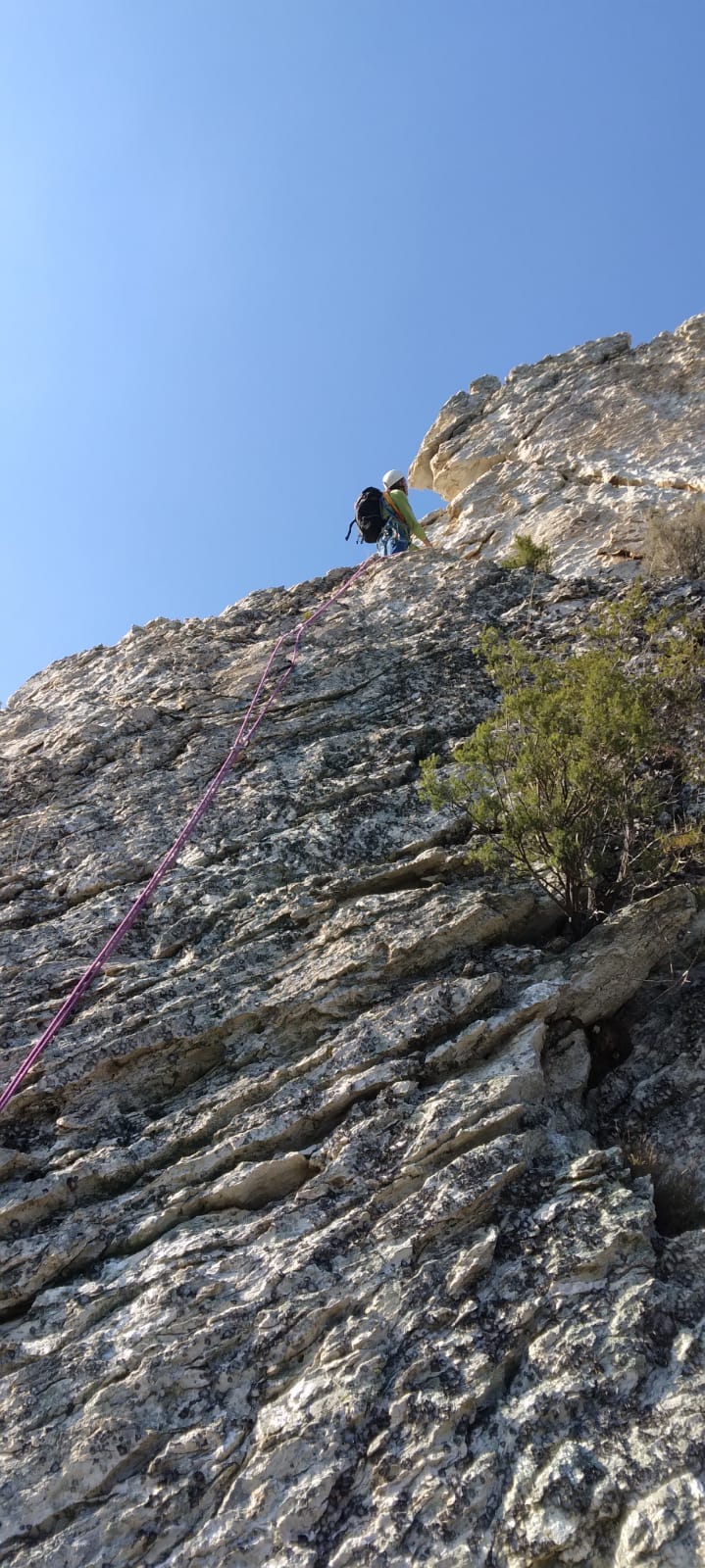 Abbiamo evitato i primi 3 tiri per la troppa vegetazione che ci ha scoraggiato nell’avvicinamento. Siamo quindi partiti dal 4° tiro, ma ci siamo cmq divertiti, specialmente sul 6° tiro, (probabilmente il + bello), che abbiamo diviso in 2 tiri (avevamo due mezze da 30). Simone e Massimo