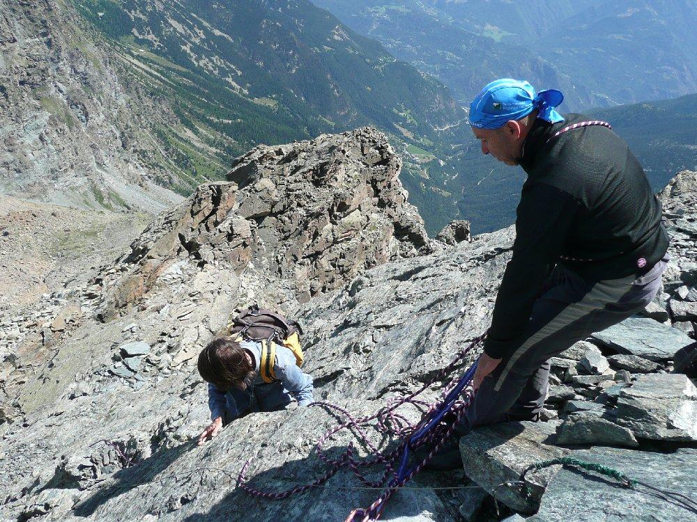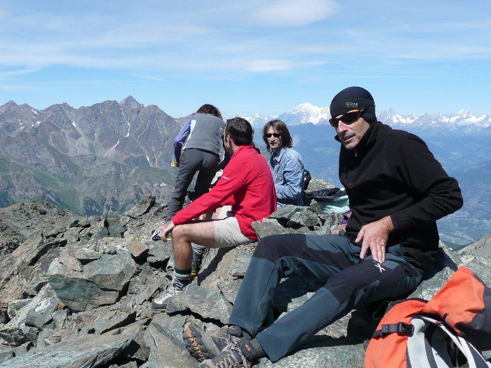 Ottima gita in compagnia di 5 mitici del gruppo Around Ayas. Grazie ad Henry che conosce bene la zona ed ha una solida esperienza alpinistica siamo saliti senza intoppi attraverso tracce e pietraie arrivando alla base della cima. Da li prestando la dovuta attenzione ad un paio di passaggi delicati siamo giunti alla crestina e poi in cima godendo di un ottimo panorama in ogni direzione. Il passaggio chiave in discesa è stato attrezzato con una corda attaccata ad uno spit presente in loco che ha fornito più che altro un aiuto psicologico per quei pochi metri di ripido con detriti. Adesso che l’ho fatta la rifarei anche da solo in queste condizioni ma se fossi stato da solo probabilmente mi sarei soffermato molto più a lungo a provare il passaggio chiave un pezzettino alla volta o forse avrei rinunciato anche se ormai in molti sopravvalutandomi, mi ritengono il “drago delle ferrate”, ma quella è un’altra storia. La compattezza del gruppo e la presenza di un paio di persone preparate sono state determinanti. Durante la discesa abbiamo allargato il giro passando alla base delle parete est in mezzo a due laghetti di fusione non segnati sulle carte e poi per pietraie, prati, rododendri, alcuni saliscendi, detriti infami ed arbusti ci siamo riagganciati al sentiero di salita, lo stesso che avevamo tralasciato per salire attraverso la lunga pietraia. Oltre il 50% della gita è stato fatto fuori sentiero. Con la gita in valle Po di ieri ho fatto 3000 metri di dislivello in 2 giorni, non mi pare vero. Dopo aver fatto molte gite con scarponi semi rigidi anche dove non necessari, oggi per andare via leggero, ho usato le scarpe basse riempiendomi spesso di ghiaia e stentando un pochino nell’arrampicata : non succederà più. Nessuno aveva il casco ma sarebbe meglio averlo, vengono smosse parecchie pietre nel tratto finale e nelle pietraie è facile scivolare. Circa 5 ore in salita, pause comprese, quasi altrettanto in discesa allargando un pochino il giro verso sud.