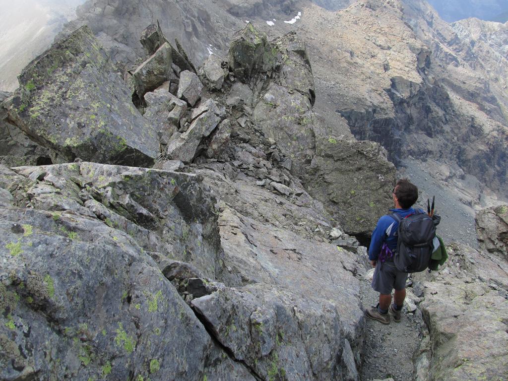 Se si seguono gli ometti il percorso non risulta particolarmente ostico, ci sono molti punti in cui si devono superare passi di I e II ma i passaggi difficili non sono mai esposti, anzi di punti esposti ce ne sono pochi. La roccia è abbastanza solida e ricca di appigli, è sempre bene però controllare la solidità dell’appiglio scelto. Si alternano tratti di arrampicata ad altri di sentiero, su ambo i lati della cresta, con qualche punto un po’ delicato causa detrito su cengie, ma basta fare attenzione. L’ultimo tratto si svolge sul versante di Champdrepraz per passare l’intaglio tra anticima e cima, attenzione al terreno non solido (sono presenti sul lato opposto due anelli per fare sicura).