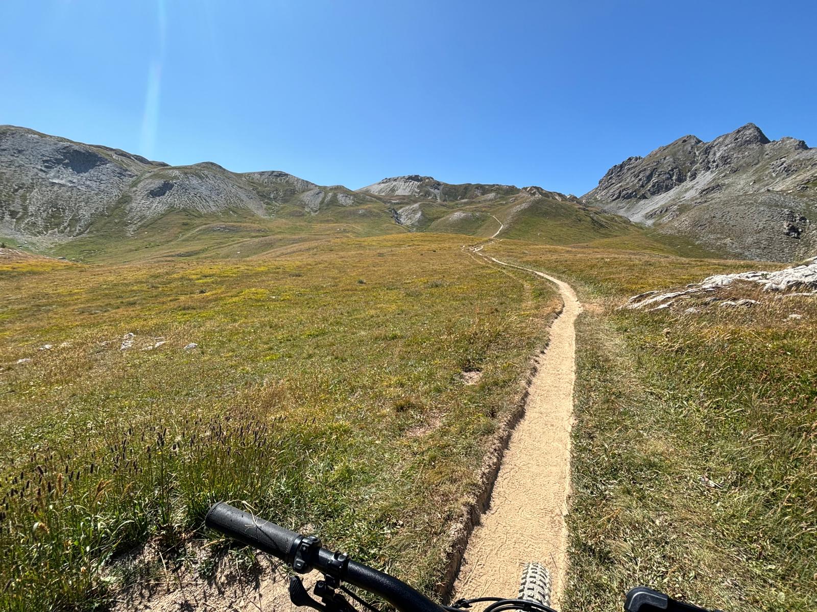 Lasciata l’auto ai parcheggi degli Chalets des Ayes (1730 m, disponibile un bar/rifugio) si segue la strada, inizialmente asfaltata e poi sterrata, fino al bel lago de l’Orceyrette, costeggiandolo fino in fondo e riprendendo a salire, sempre su sterrata, fino ad un bivio presso una malga, dove, tenendo la sinistra, si arriva agli Chalets de l’Alp (2200 m). Da lì comincia il sentiero in single track a mezza costa che si inoltra nel bel bosco di pini cembri, fino agli Chalets de la Taure, dove il sentiero scende in single track tecnico fino quasi a tornare alla strada di salita al lago (1880 m). Al termine della discesa si prende la sterrata a destra e la si segue in salita nel vallone a fianco fino a Vers le Col e da lì su sentiero, in parte su sfasciumi ma pedalabile, fino al Col des Ayes (2477m). Discesa in single track tecnico (da ripercorrere poi in salita al ritorno) fino agli Chalets de l’Echaillon (2140 m) da cui si risale su sterrata fino agli Chalets de Clapeyto e poi, su sentiero ciclabile e con pendenze a tratti anche morbide fra pratoni, si giunge ai laghetti e stagnoni nei pressi del Col de Néal. Un breve tratto a mezza costa porta ai piedi dell’ultima balza verso il Col du Lauzon (2576 m). Tornati al Col de Néal comincia la bella e divertente discesa, su tragitto parallelo a quello di salita, che riporta agli Chalets de l’Echaillon e quindi, con dura ascesa con tratti a spinta, di nuovo al Col des Ayes. Il tour si conclude quindi con il ritorno alla partenza con discesa tecnica nella parte finale in mezzo al bosco.