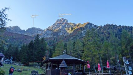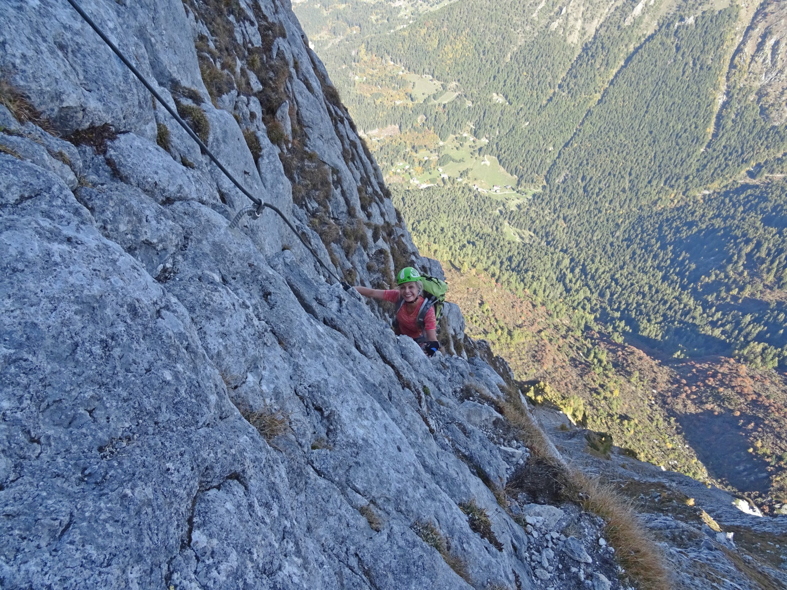 Per la cronaca, siamo partiti dalle Baite Mastellino 1200mt. parcheggiando l’auto vicino alla piazzola elicottero e preso la strada sterrata che traversa nel bosco di abeti in circa 45min. abbiamo raggiunto il Rif.De Marie al Volano 1480mt. Da qua prendiamo le indicazioni salendo il primo tratto un po’ noioso tra piante d’ontanelle arrivando ai primi roccioni con tratti attrezzati un po’ scivolosi. Tratto con catena penzolante che porta al colletto un po’ friabile, da li facile il tratto che guarda sulla Valle Camonica fino al Bivacco della Fàsa dove ci imbraghiamo. Subito dopo ripassiamo ancora sul lato della Conca del Volano dove con un traverso ci portiamo versoi la ferrata vera e propria. Tratto ferrato breve e facile, con l’asciutto di oggi i cavi sono quasi superflui ma ovviamente al ritorno in discesa hanno il loro perché. Crestina finale elementare per il resto grande giornata con super panorama a 360° da urlo di …Tarzan. Il P.zo Badile Camuno gode di una felice posizione avanzata a mo di sentinella, permette una vista senza uguali sulla Val Camonica. Quasi 2100mt. di stacco dal fondo valle