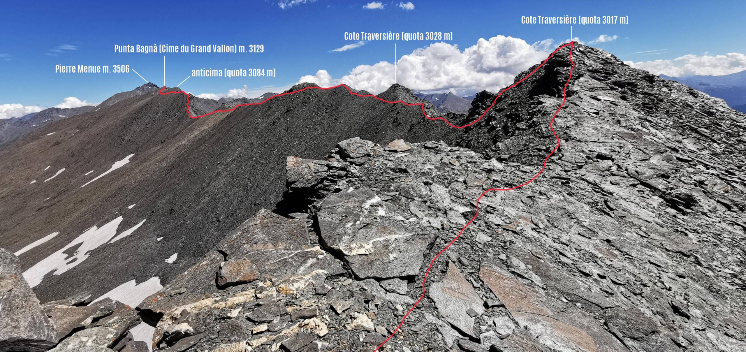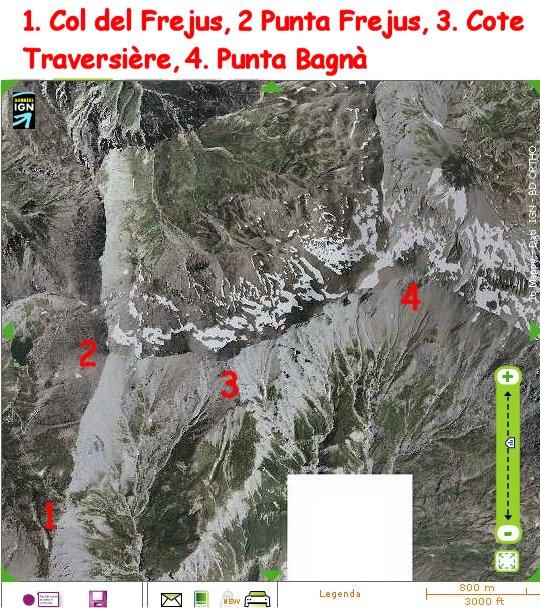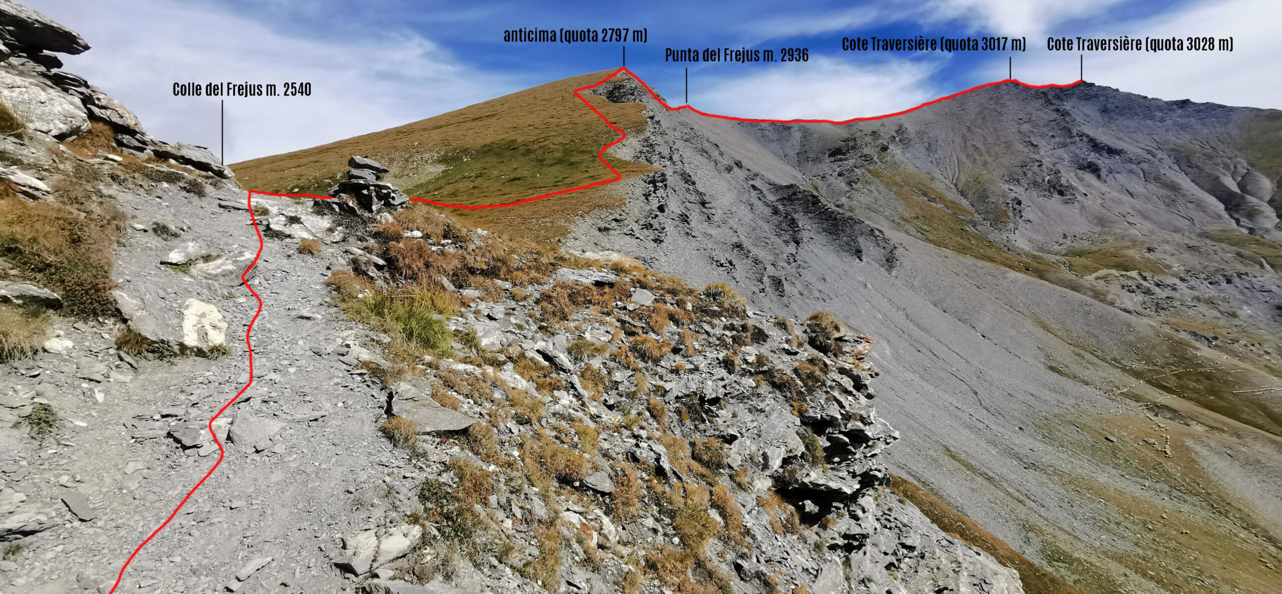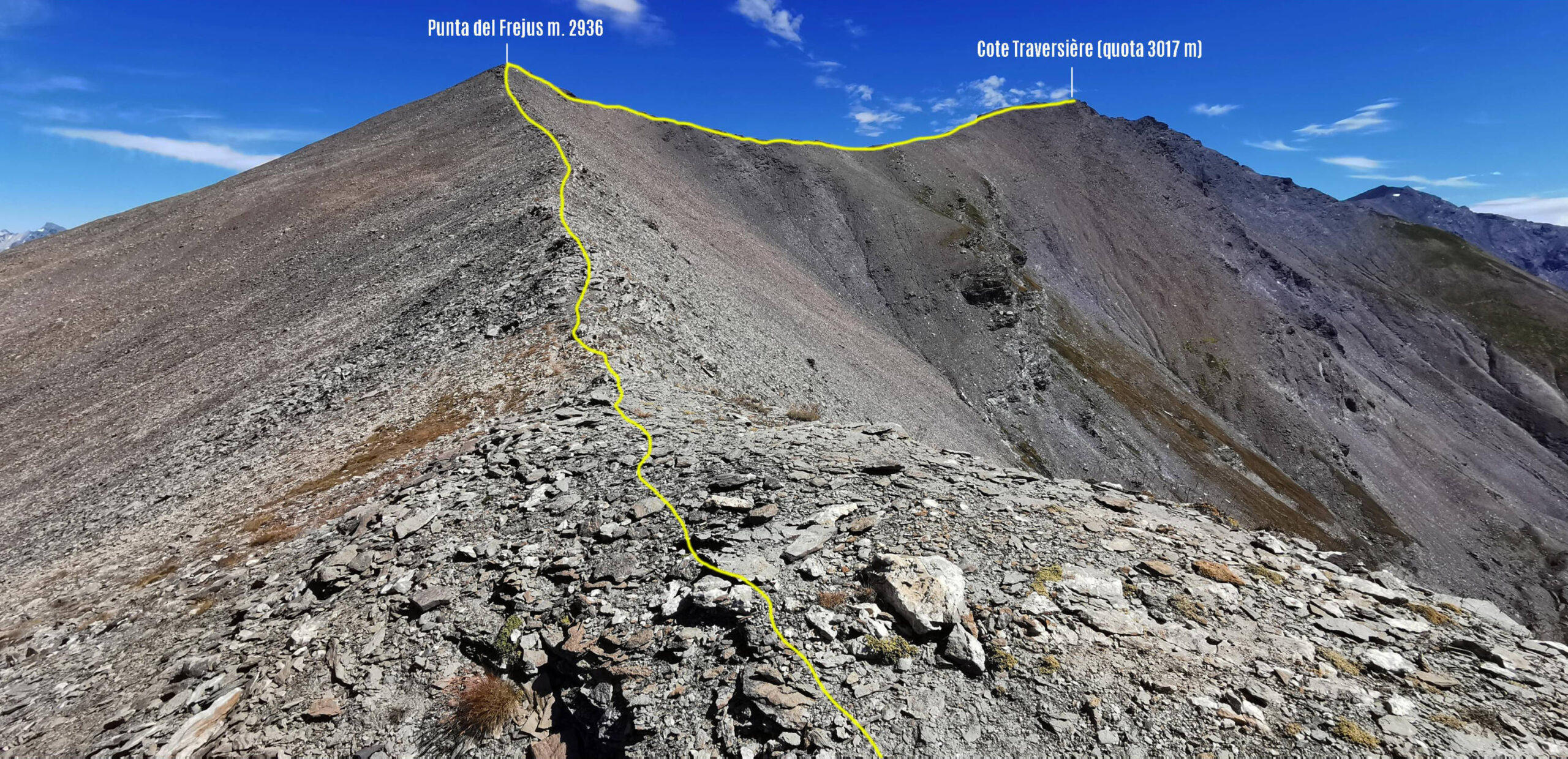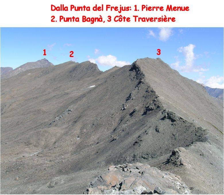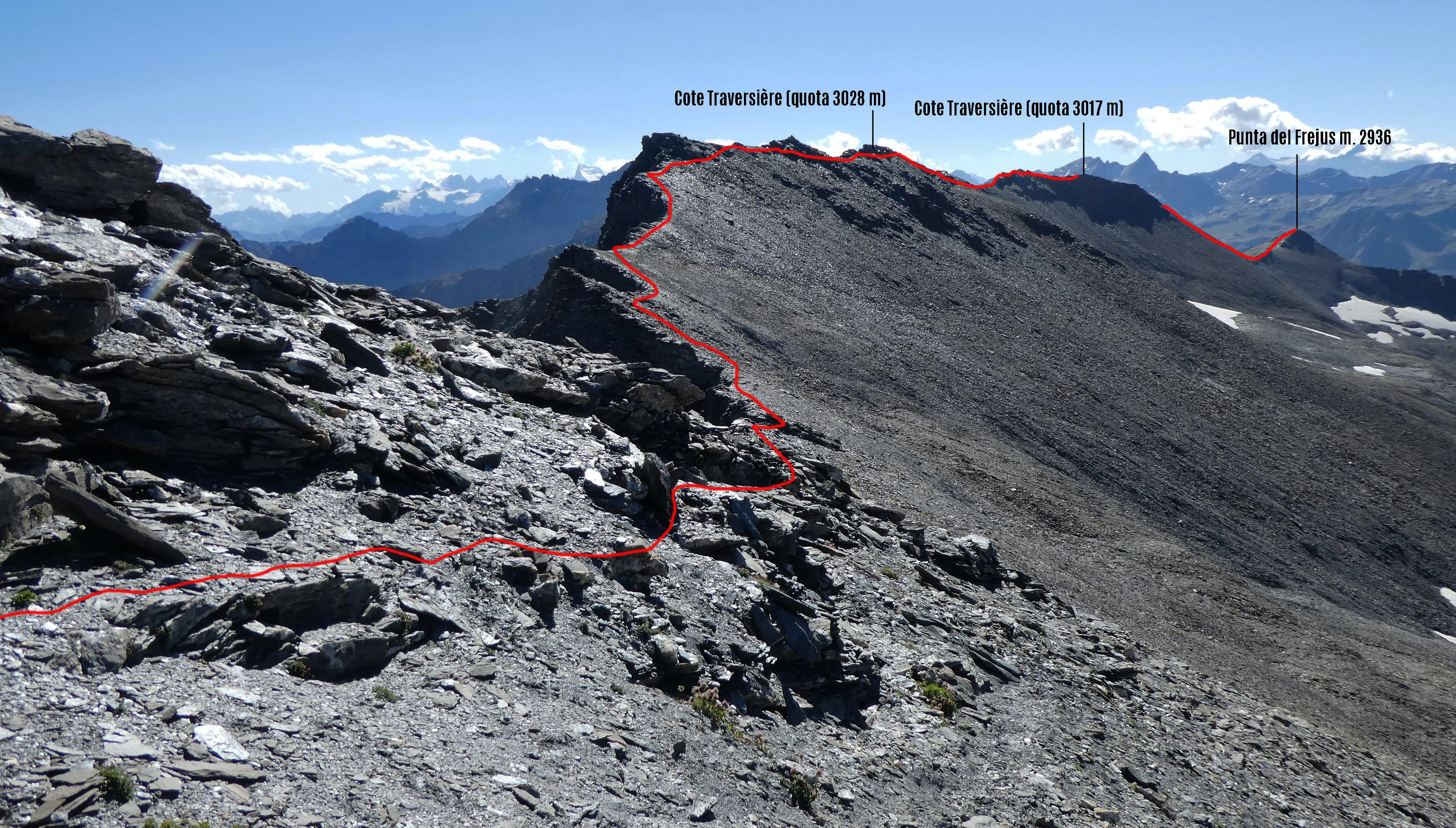 Dalla vetta del Frejus (quota 2936 m) si scende la cresta in direzione E, lungo una traccia che ne segue il filo. Superate alcune asperità si tocca la Côte Traversière (3017 m), che sulla prima foto dell’itinerario sopra citato è riportata erroneamente come Punta Bagna; in realtà la cresta che separa la meta della gita dalla Punta Frejus è piuttosto lunga (2,5 km circa), ed è visibile nella foto aerea allegata alla presente descrizione.