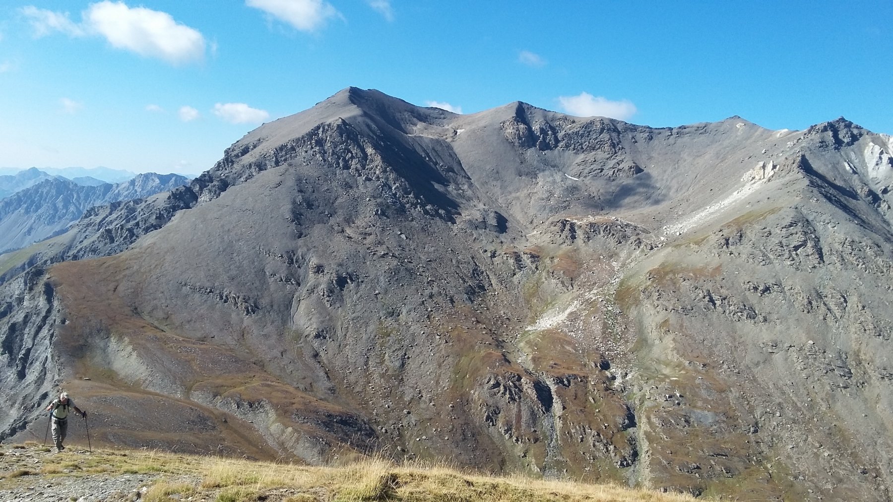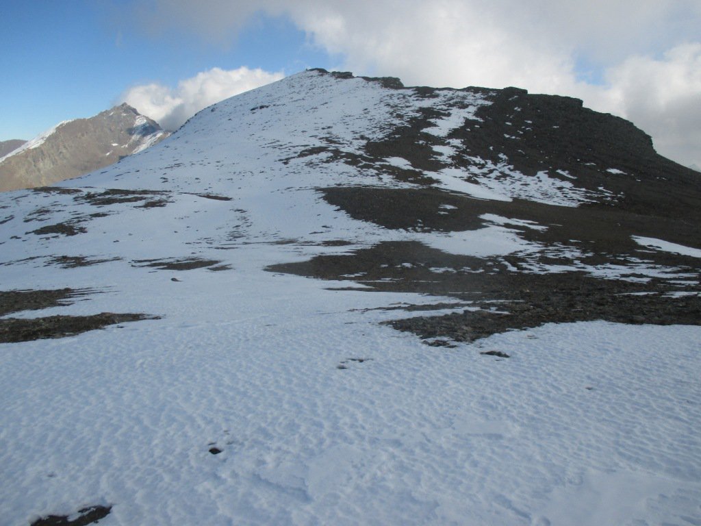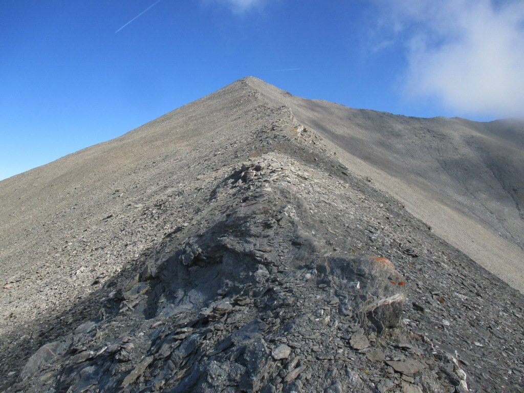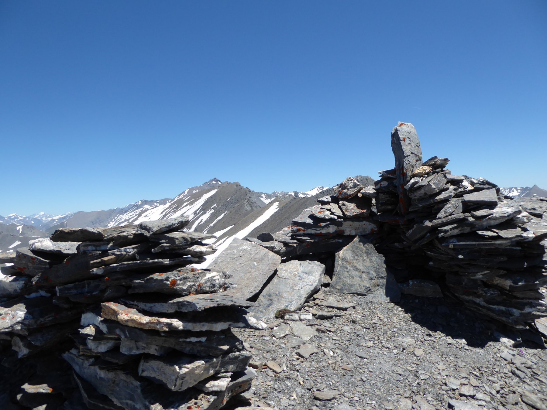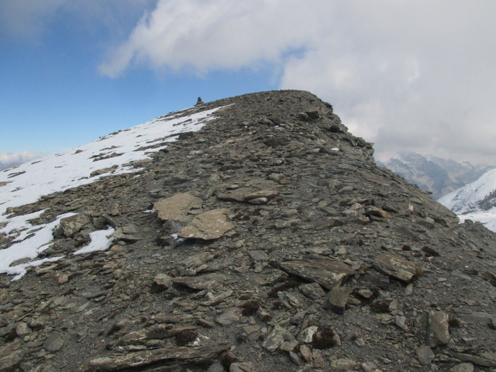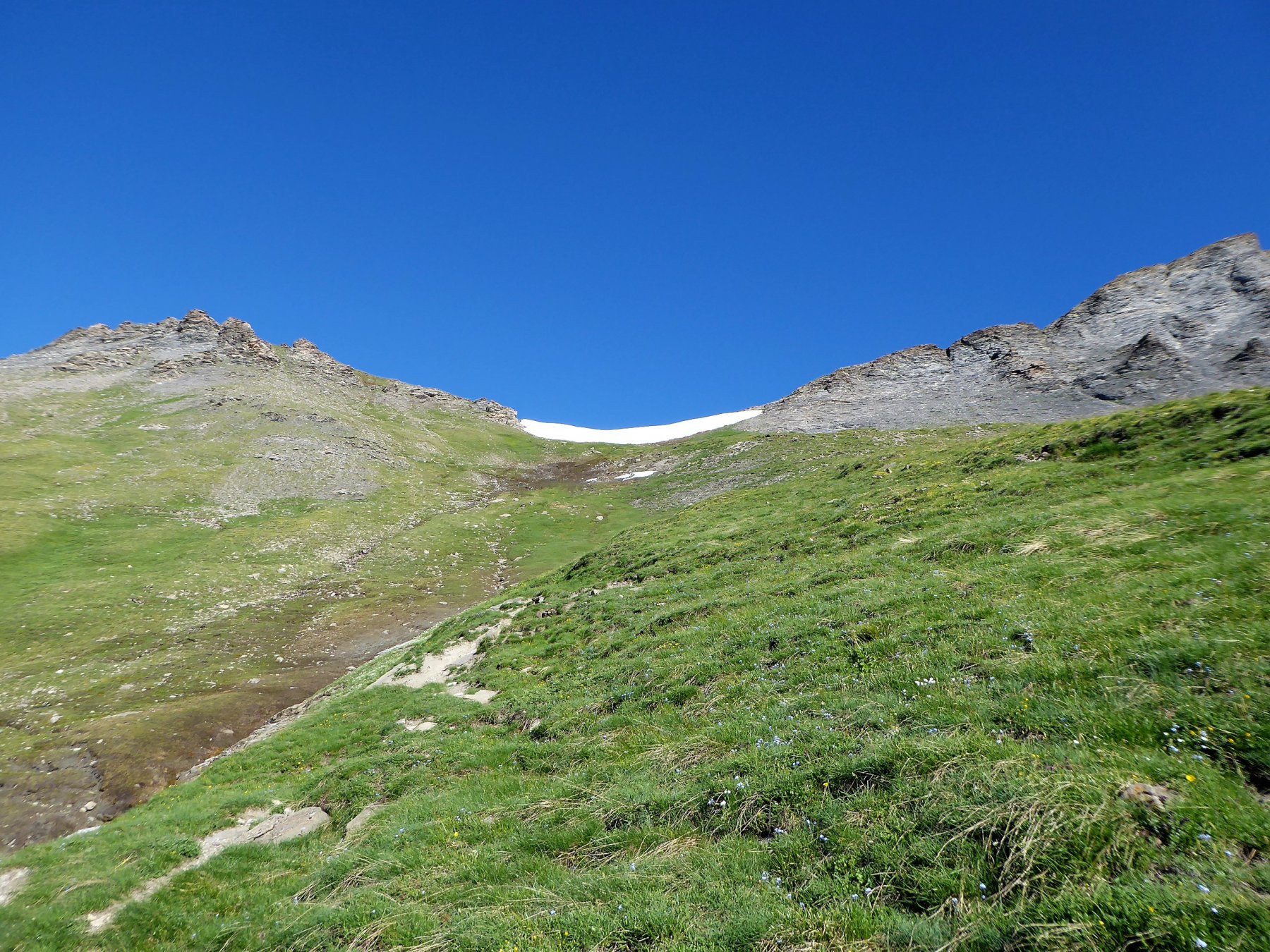 Giunti al colle, si volge a destra tenendosi sul versante francese, e si sale fino alla quota 2787 (evidente, ometto) per prati con alcune tracce di sentiero; da questo punto inizia la parte finale su sfasciumi, ma il sentiero diviene più evidente e sono presenti ometti.