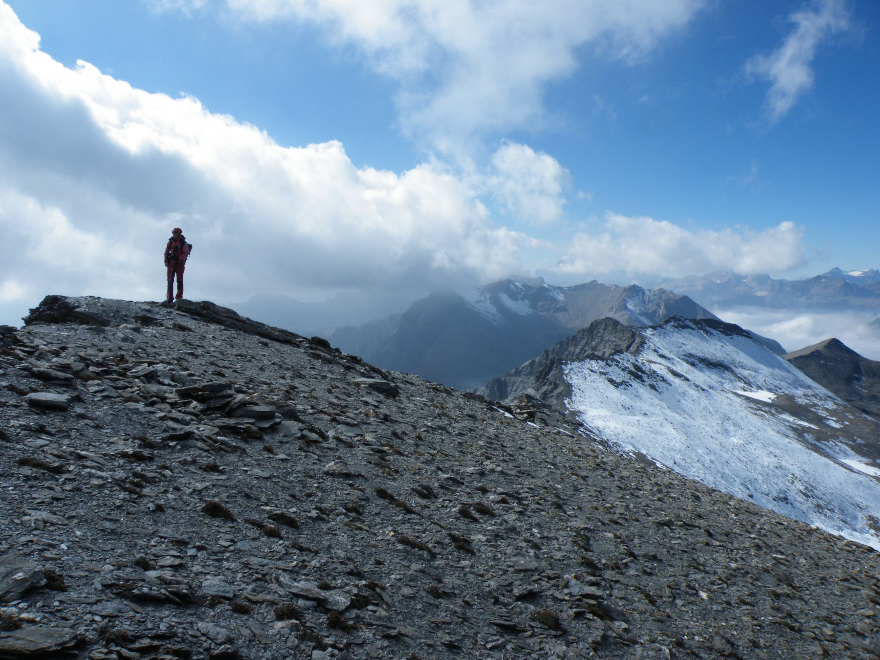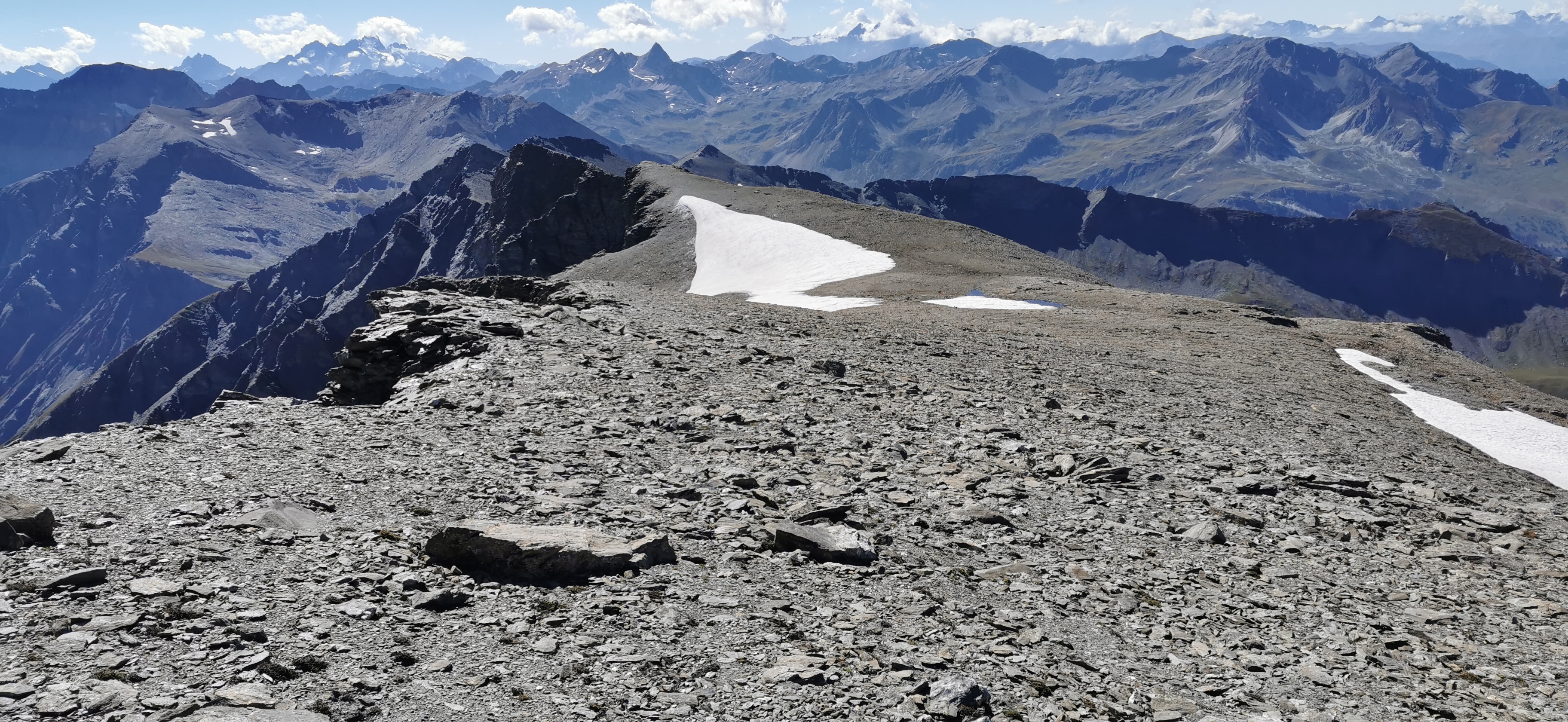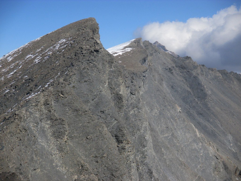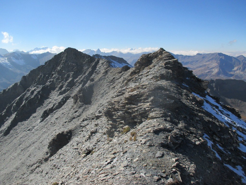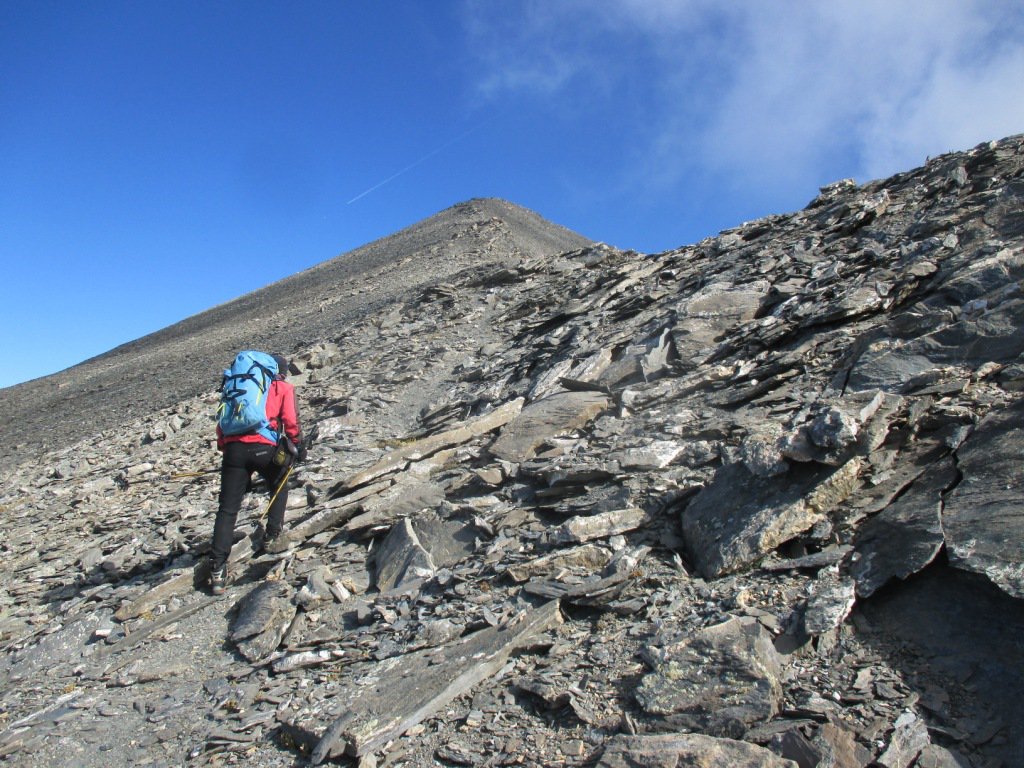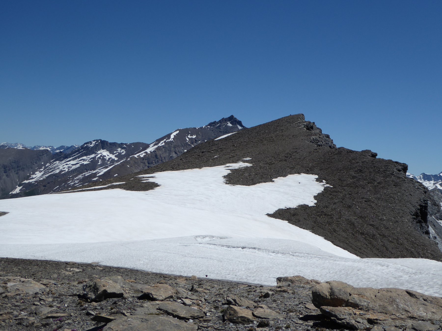 Dopo esser scesi dalla Côte Traversière per 20-30 m di dislivello, talvolta portandosi sul versante francese (N), ci si trova davanti un erto pendio di sfasciumi: affrontarlo quasi direttamente fino a portarsi su una prima anticima; proseguire fino all’anticima vera e propria (3081 m), dalla quale si scende su un pianoro che precede di poco la meta.