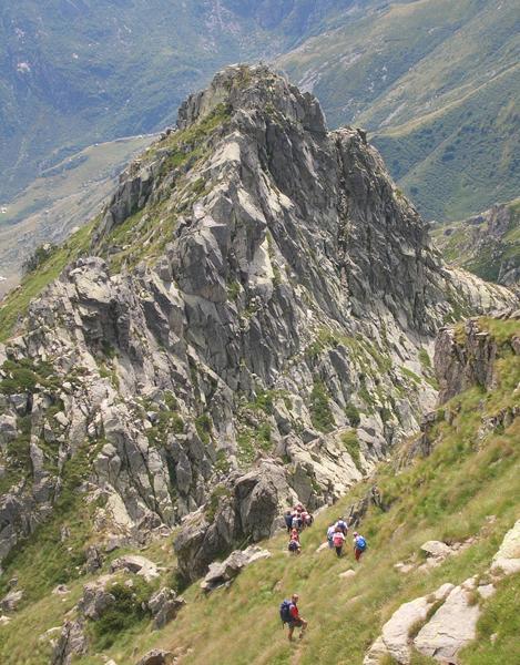 3° Tappa Si va al lago della Vecchia e seguendo il sentiero E 50 si sale al Colle della Vecchia ,pochi metri dopo sul versante Valdostano un sentiero sale a sinistra e con un lungo mezza costa ci porta al colle delle Tote ,la cresta inizia con una breve corda fissa poi prosegue con tratti di sentiero e passaggi di 1° sempre esposta fino alla cima del Cresto da cui si scende per l’ erbosa cresta sud giungendo in breve al colle del Lupo seguire alla meglio la cresta nord della Pietra Bianca, dalla cima scendere la cresta est aggirando alcuni denti su prati molto ripidi e poi sempre in cresta un tratto attrezzato con caratteristico camino e sasso incastrato ci porta ad un colle da cui su terreno facile si risale alla punta della Gragliasca, si scende al colle della Gragliasca e si prosegue sempre per cresta fino ad un tratto esposto attrezzato con corde fisse (si tratta dell’ unico affioramento calcareo delle Alpi Biellesi),lungo il percorso numerose stelle alpine si continua lungo la facile cresta superando le cime del Gran Gabe e Lej Long da cui si scende su terreno esposto con passi di 1 ° per poi risalire alla punta della Barma scendere la cresta e reperire un sentiero a sinistra che in piano porta al colle del Camino risalire la cresta del Camino e dalla cima scendere 50 metri raggiungendo la capanna Renata.