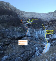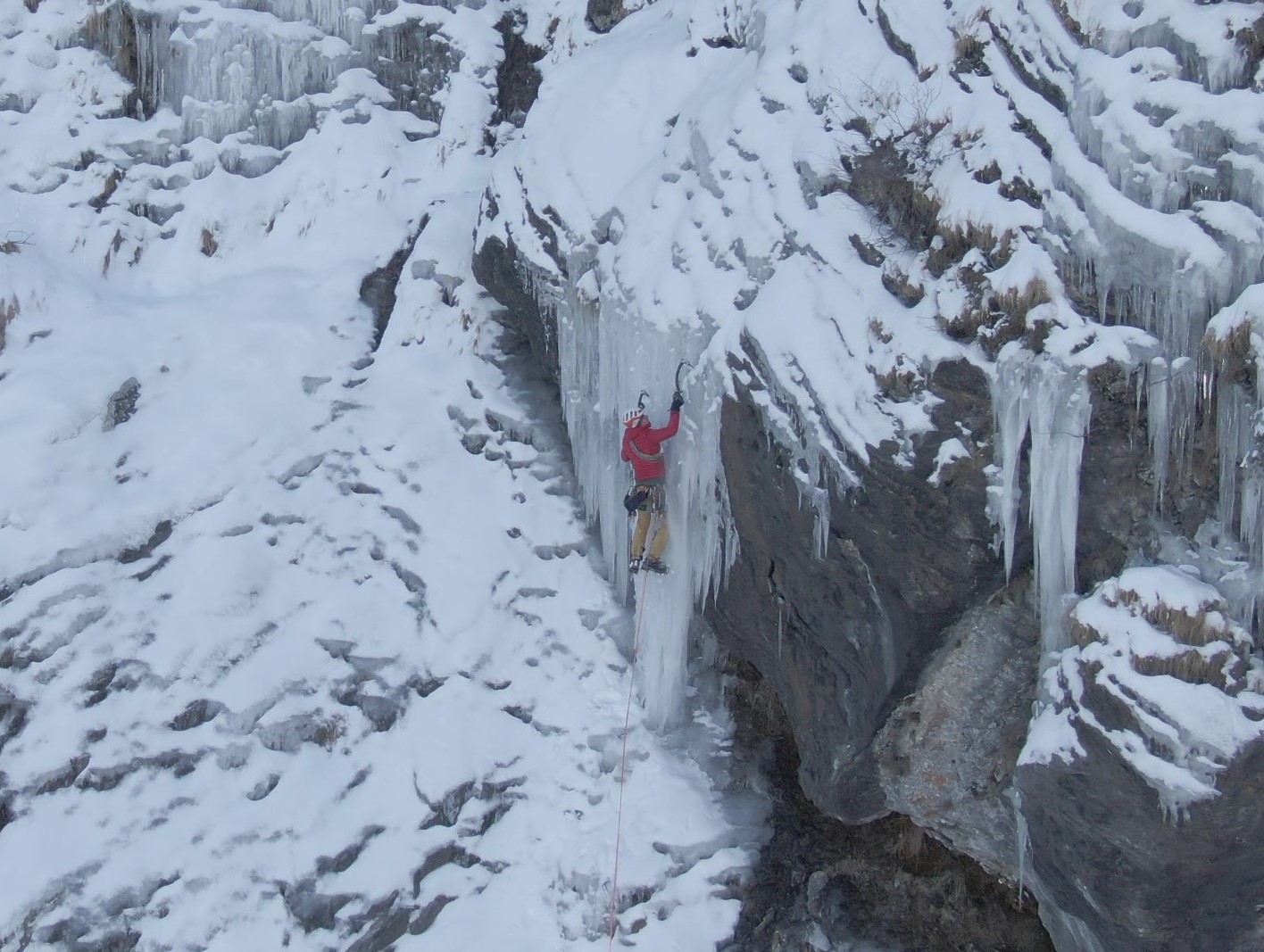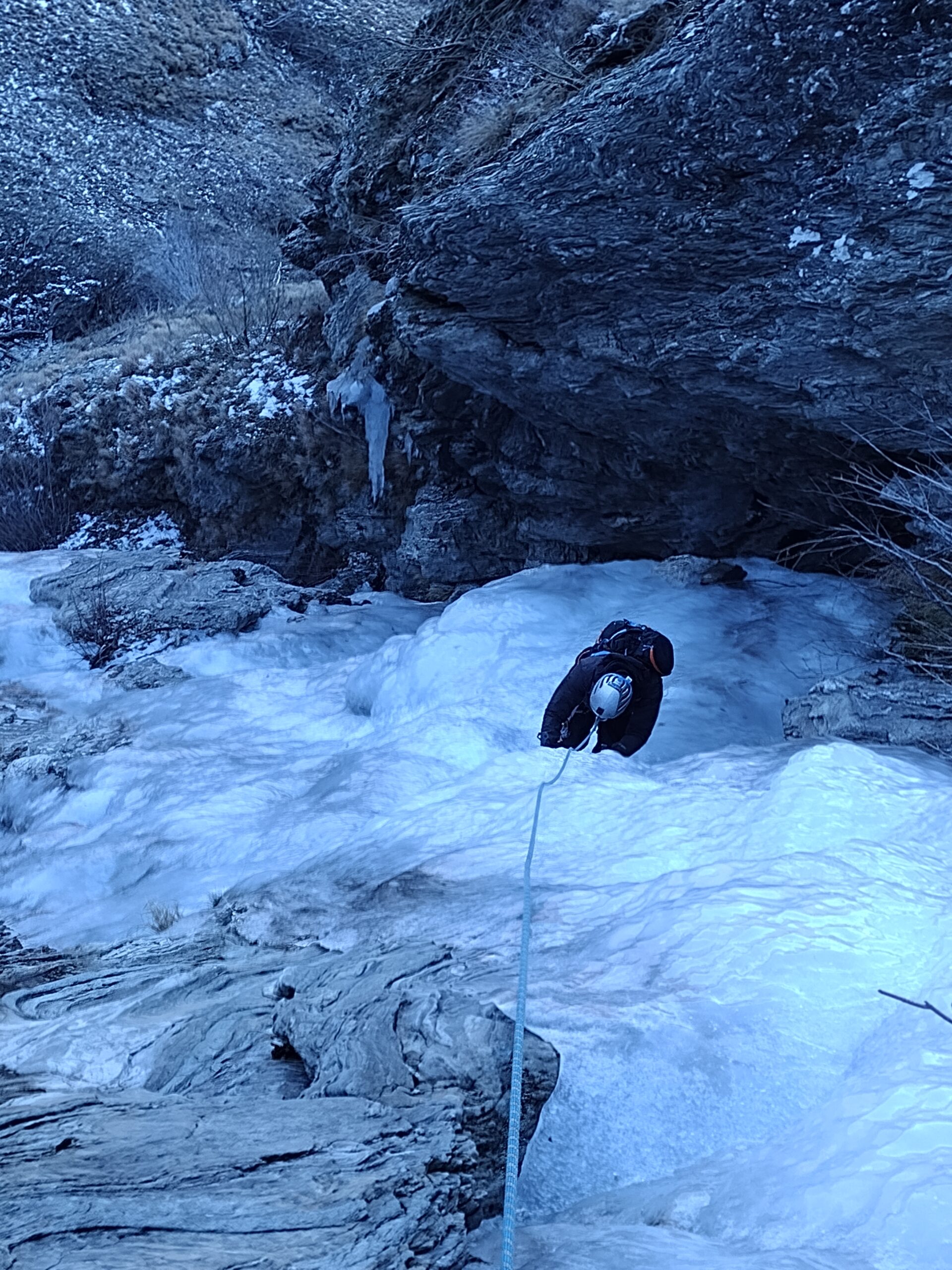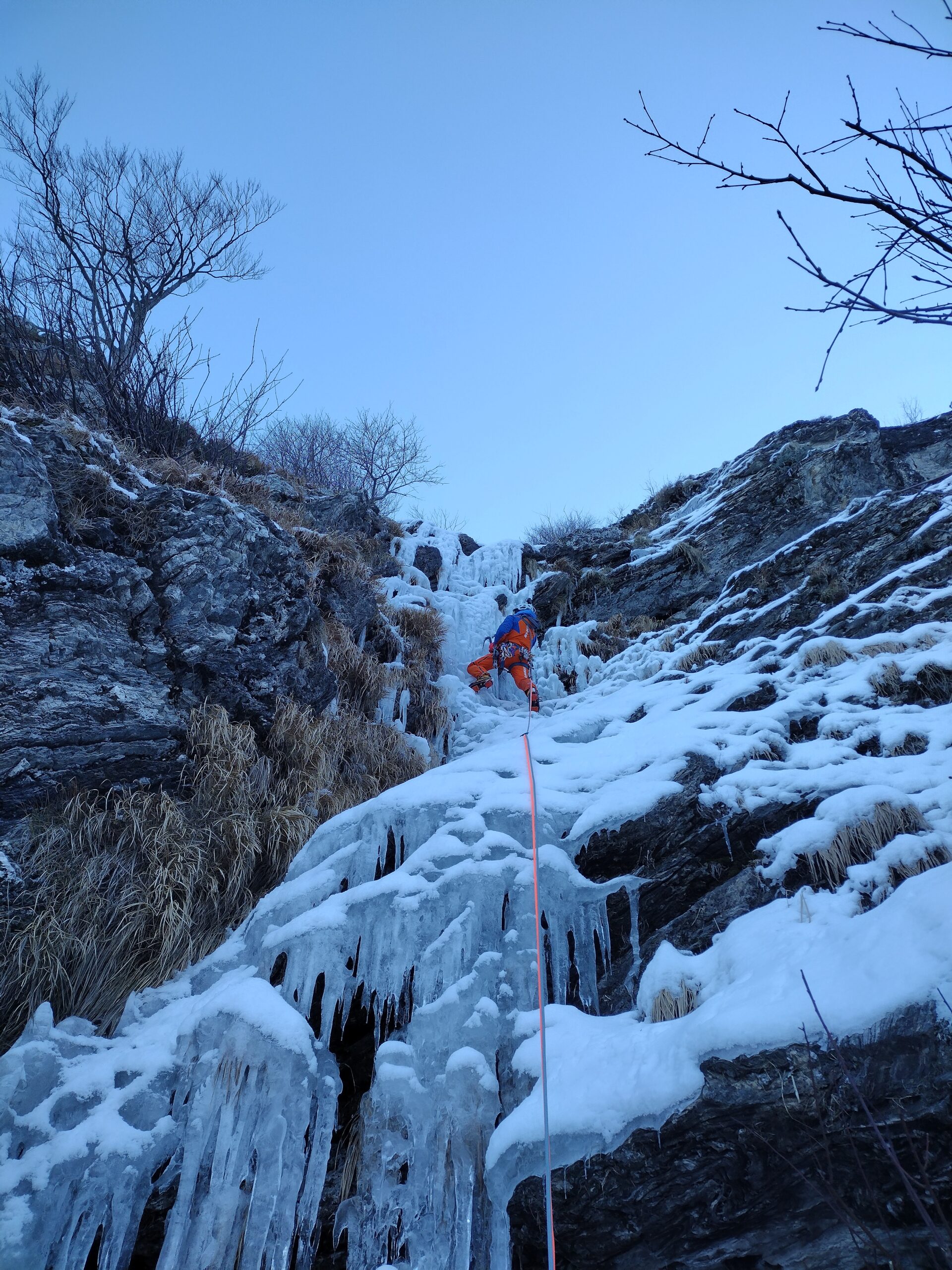 Arrivati nell’invaso si sale la colata di sx, sotto un grottone. Da qui si segue la colata, sempre abbastanza appoggiata al netto di qualche risalto, per un paio di lunghezze. Superato questo primo tratto si prosegue sul greto del torrente mantenendo sempre la sx fino ad un’altra cascatina. Una volta fatta questa la via proseguirebbe ascendente verso destra, incontrando una placca ghiacciata che viene salita sempre in ascendente destra sfruttando le debolezze. Qui si può fare la variante più verticale (in teoria salita da G. Pedrini nel 2022) che attacca la placca ghiacciata nel centro e dopo qualche metro sui 70° prende una bella colata a 90° di circa 5 metri e poi esce sul facile a 50°, riprendendo quella che dovrebbe essere la linea originaria.