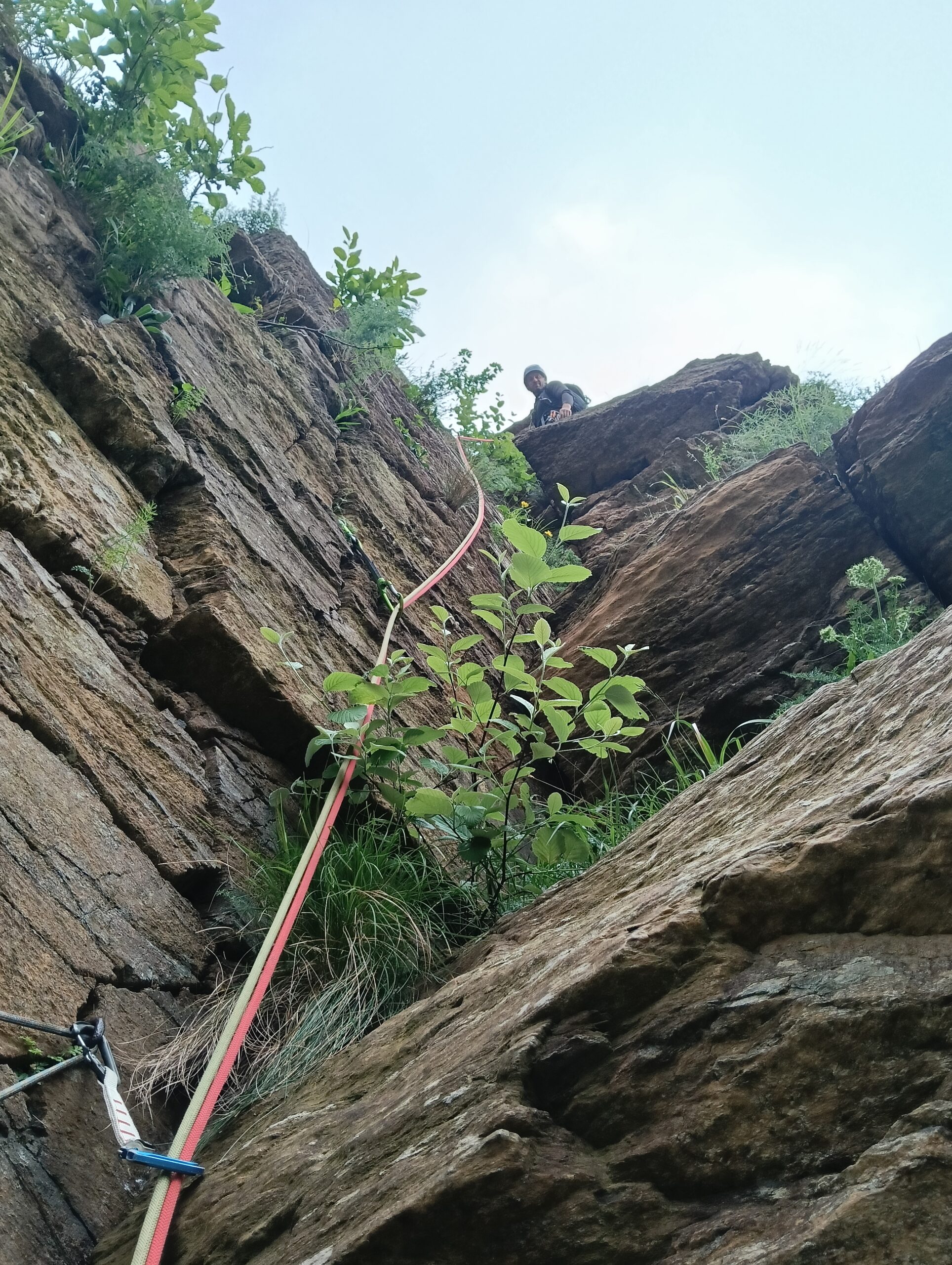 Oggi un po’ umida la roccia, ma si andava bene comunque, solo un po’ più di attenzione. Bello l’inizio della placca Ubaldo, abbiamo fatto il passaggio con i fix un pelo più difficile di quello a destra con i resinati. Spettacolare il diedro del tramviere e la via dei camini, passi mai difficili ma comunque spittati belli lunghi. Qualche nut o friend, ogni tanto, non fa mai male, ed é divertente integrare.