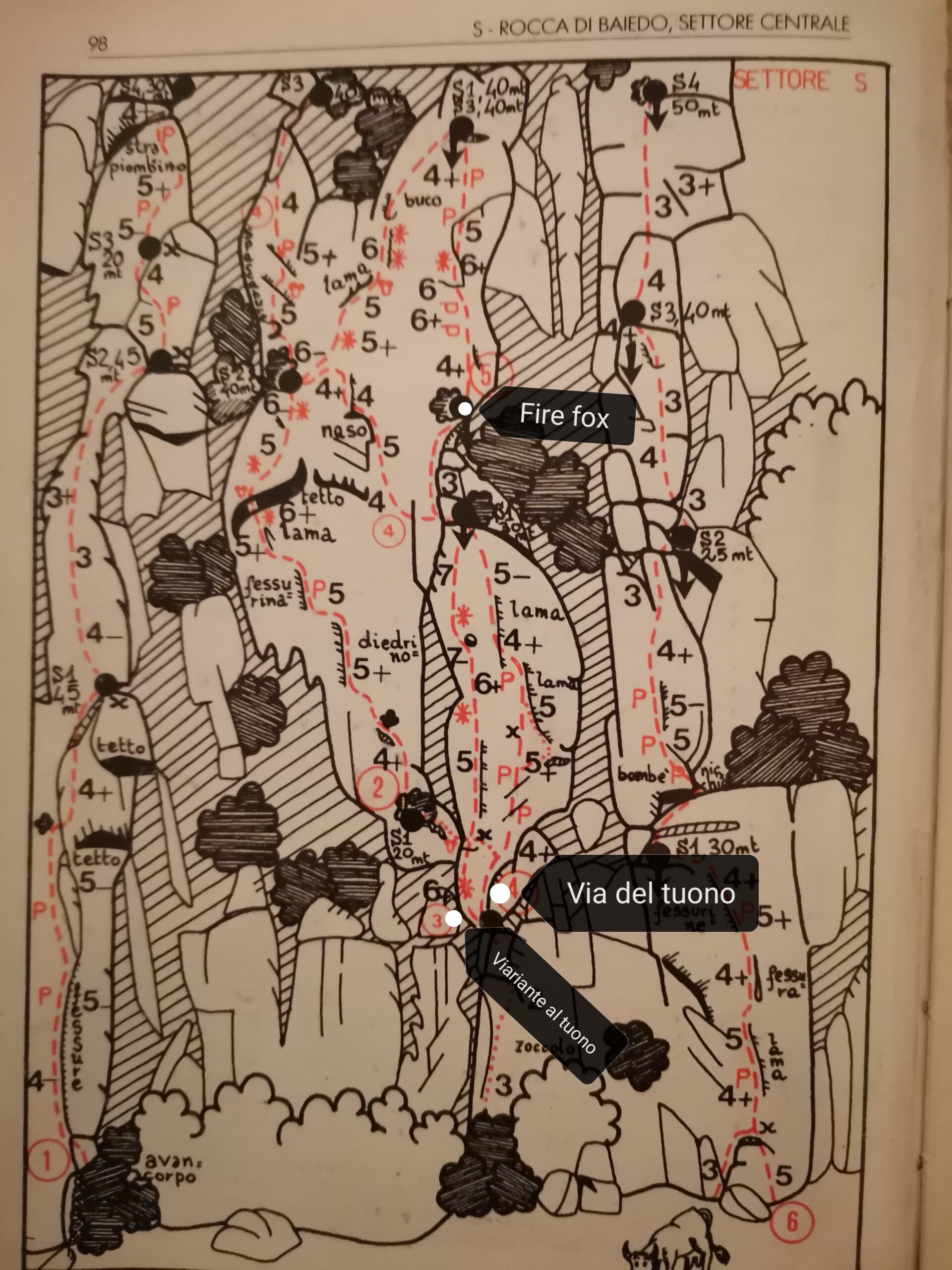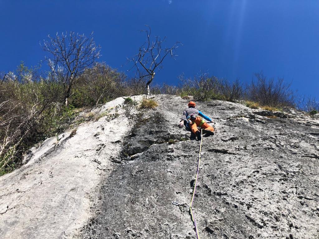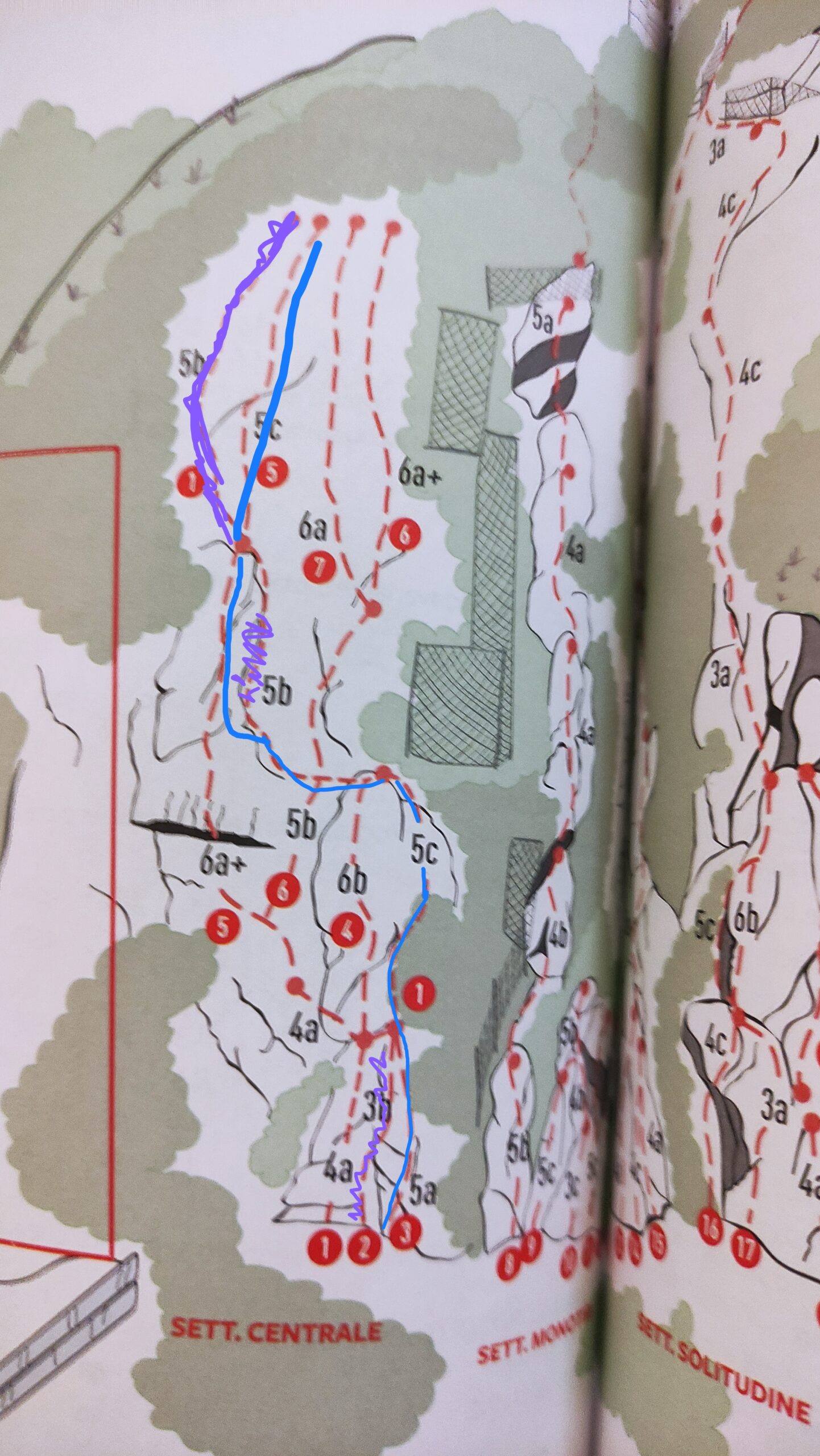 - L2: 5c, placca a buchi, qualche metro più delicato con buone correzioni per le mani ma con poco per i piedi fino ad acciuffare un sistema di fessure che porta ad una placca più appoggiata attraverso cui a sinistra alla sosta