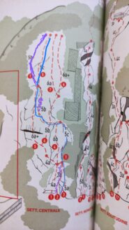 - L3: 5b traversare decisamente a sinistra , seguire un diedro poi traversare per lame e tacche a sinistra a prendere un lamone che si segue fino alla fine- a sinistra a prendere una bella fessura, alla fine della quale si traversa ancora a sinistra su placca granulata alla sosta. a destra di questa lunghezza ci sono diverse possibilità che salgono dritte per placca ripida-varianti più difficili (6a+/6b)