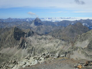 Il gruppo del Balaitous, insieme al parco delle valli Occidentali, nonostante il facile accesso dalla frequentata stazione di Panticosa, rappresenta uno degli angoli più belli dei Pirenei, dove valli pietrose e selvagge cosparse da numerosi e variopinti ibones salgono ripide su picchi slanciati. Il Balaitous è Il 3000 più occidentale, la vista spazia in particolare a ovest dove i rilievi lentamente digradano verso l’ancora lontano oceano. Da la Sarra si segue per il Respomuso per ca. 45 minuti, alcuni saliscendi al ritorno si faranno sentire. Al bivio per i laghi di Arriel si gira a sinistra e prima per scomodo traverso e poi per detriti si raggiunge il primo lago dei 6 che si ammireranno. Presso l’Ibon alto di Arriel una traccia a sinistra non segnalata porta al laghetto turchese a 2400 da cui si rimonta di fronte un pendio di grossi massi fino ad arrivare ad un secondo circo pietroso. Di qui ho sbagliato seguendo vaghe tracce a destra, bisogna invece andare a sinistra per rocce montonate e seguire gli ometti fino alla Cueva Bechaud, dove inizia la Diagonal. Cengia larga e poco esposta che prima della strettoia diventa pendio sospeso, la seconda parte è invece più stretta e con qualche passaggio. Sulla paretina finale ci sono molti ometti, traversandone la base in leggera salita si trova una cengia ascendente verso destra con ometto, si salgono poi vari gradini verso sinistra che portano ad un breve e faticoso canalino che porta a pochi minuti dalla vetta. Mattinata fresca e ventosa, velature alte e nuvolaglie verso le pianure. Ultima salita pirenaica di questo curioso agosto di peregrinazioni, dagli alti Tauri ai Pirineos, e sicuramente la più impegnativa, almeno per continuità di passaggi e tipologia di terreno. Avendo tempo è consigliabile una visita al vallone del rifugio, raggiungibile in saliscendi dal primo ibon, o in traversata dal Bailatous, ma con ben altre difficoltà. Adelante!