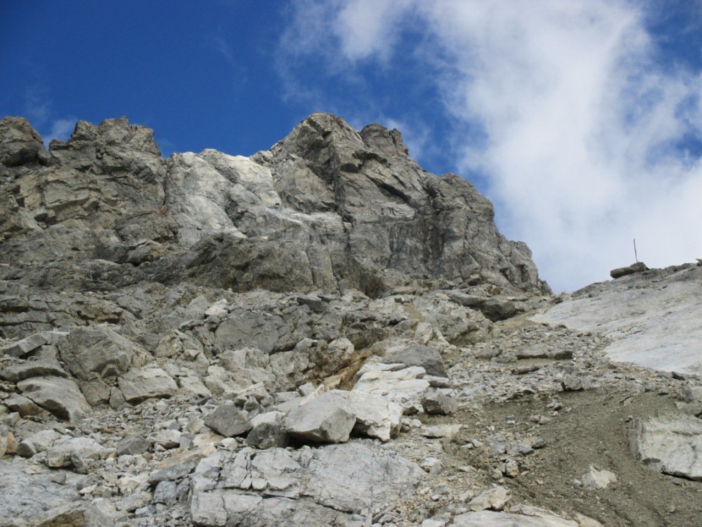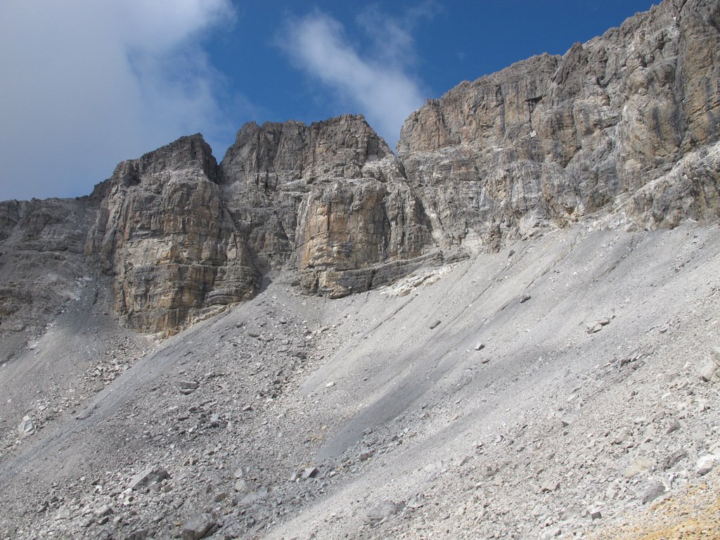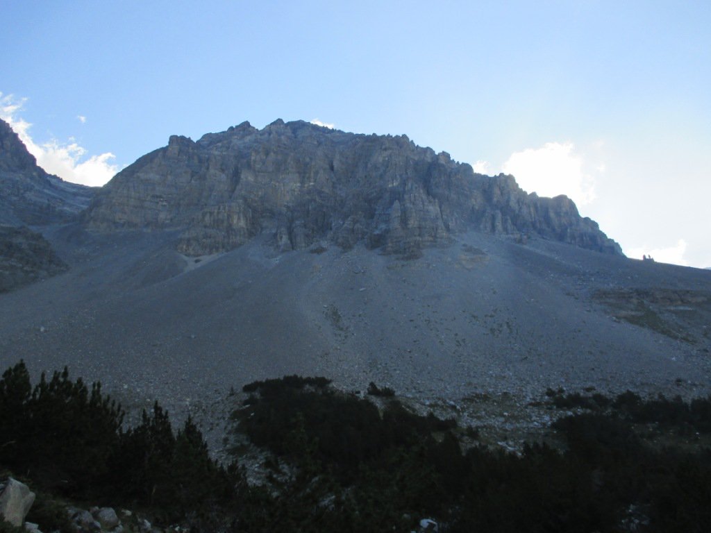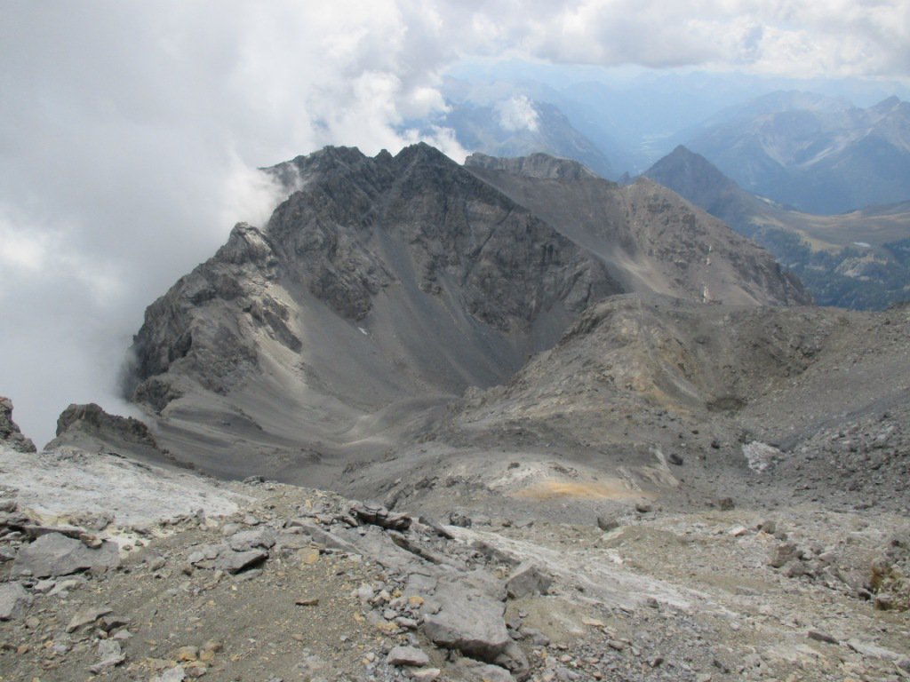 Si svolta ora in direzione SE per un lunghissimo traverso. È consigliabile tenersi sotto alla pietraia a costo di alcuni saliscendi per evitare un’infinito e faticosissimo traverso sulla pietraia stessa. Continuare fino a giungere sull’ultima costola terrosa e detritica dove si scorge un ometto. Da qui in poi seguire gli ometti che salgono il vallone più o meno nel centro attraversando ripidi pendii alternati a dei falsipiani.