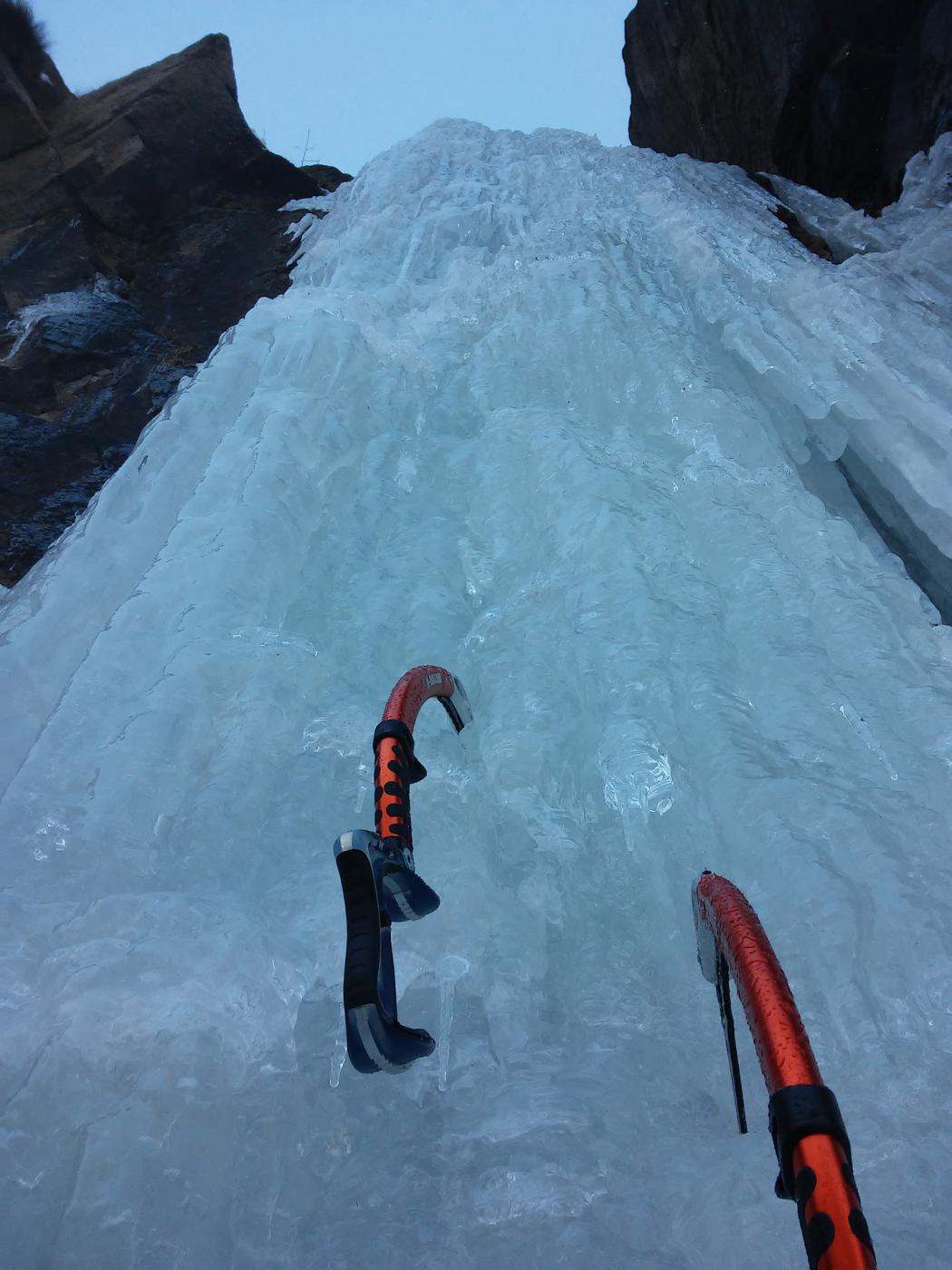 Cascata in buone condizioni, il primo tiro con ghiaccio un po’ sottile ma ben proteggibile, il secondo tiro una candela di 15 m bella verticale con ghiaccio duro senza alcuna traccia di altri passaggi, una cordata di ragazzi di Ivrea è passata sulla destra, il terzo tiro con ghiaccio morbido era già esposto al sole, abbiamo fatto sosta su un alberello visto che la sosta a spit era raggiungibile solo a nuoto, il quarto tiro l’abbiamo evitato visto che si era formato un torrente, ci siamo calati in doppia dall’alberello.