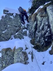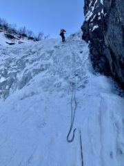Parecchia neve per l’avvicinamento ma ormai la traccia è battuta. Attenzione nel salto tra la centrale e la destra, per fortuna il cordone aiuta. Nell’insieme ben formate. Anche se si sente l’acqua scorrere e se il primo tiro della centrale fa un po’ effetto granita. Parecchia neve nei tratti meno ripidi. Soste in buone condizioni e facilmente accessibili. Meglio tenersi sulle linee dì destra.