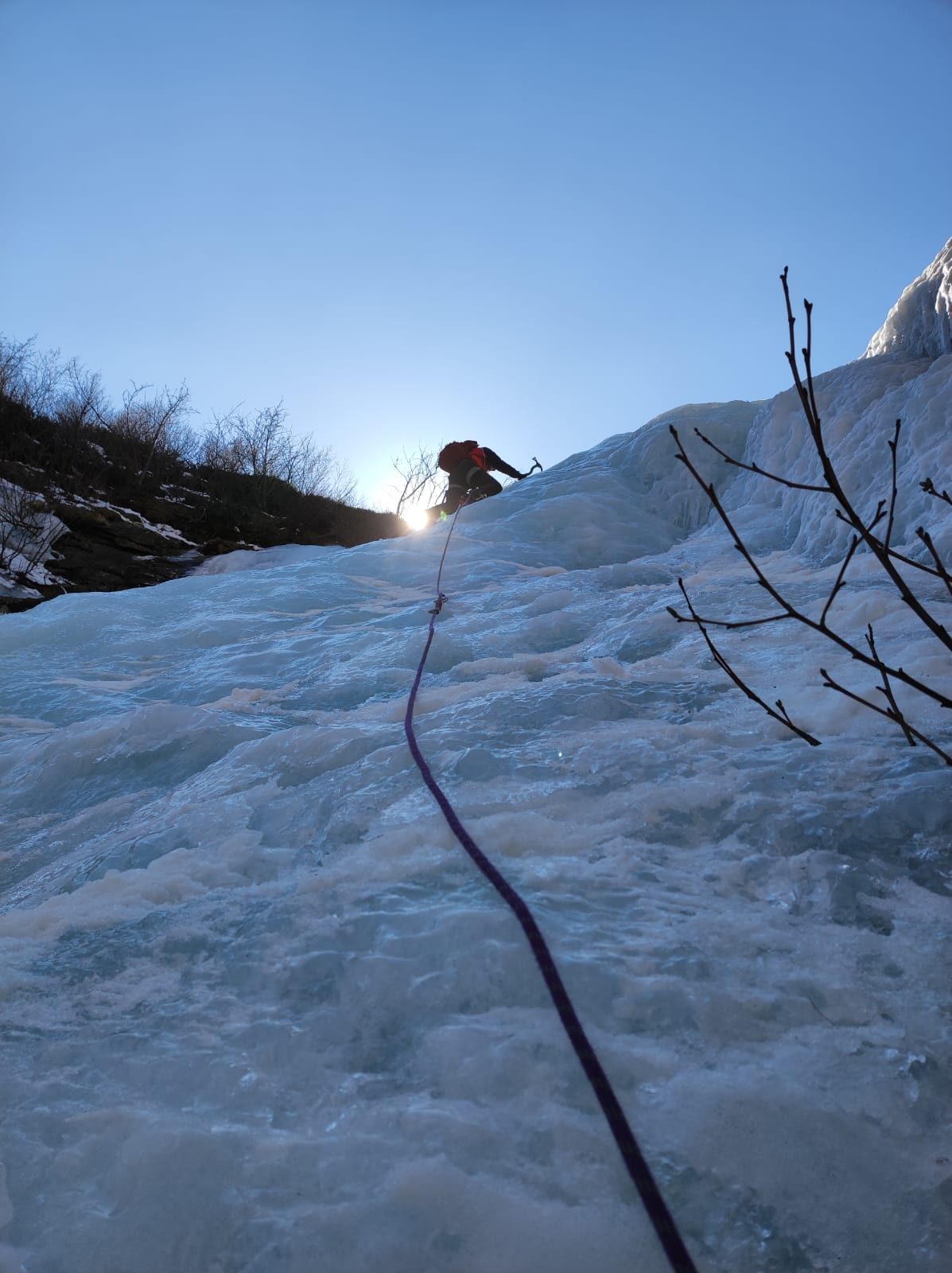 Il relativo impegno che la cascata del Paschiet ha richiesto ci ha indotti a scendere ad andare a vedere le Pontat ubicate di poco sotto, lo stato in cui erano. Solo la centrale si prestava per una salita in sicurezza data la buona qualita’ del ghiaccio per quanto spaccoso fosse sotto i ripetuti colpi delle picche. Non disponendo che di una corda di 30 mt e di un paio di viti, giocata cosi l’unica possibilita’ di una comoda discesa in doppia trasformatasi all’istante in una di quelle incredibili ravanate d’altri tempi giu’ dal lato sinistro delle colate sopra tutta una successione di salti fino a riprendere il GTA destinazione Cornetti