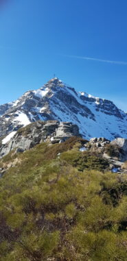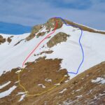 Dopo pochi metri di roccia con difficoltà di M3 abbiamo trovato un vecchio chiodo. Da qui alla cresta c’è un nuovo breve nevaio.