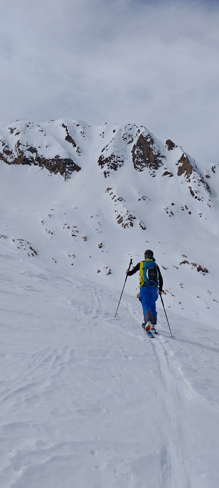 Discesa: se le condizioni lo permettono dalla cima scendere per 20 m ad un colletto verso N da dove parte l’evidente canale N (max 40°) che riporta nella conca del ghiacciaio e da qui per l’itinerario di salita