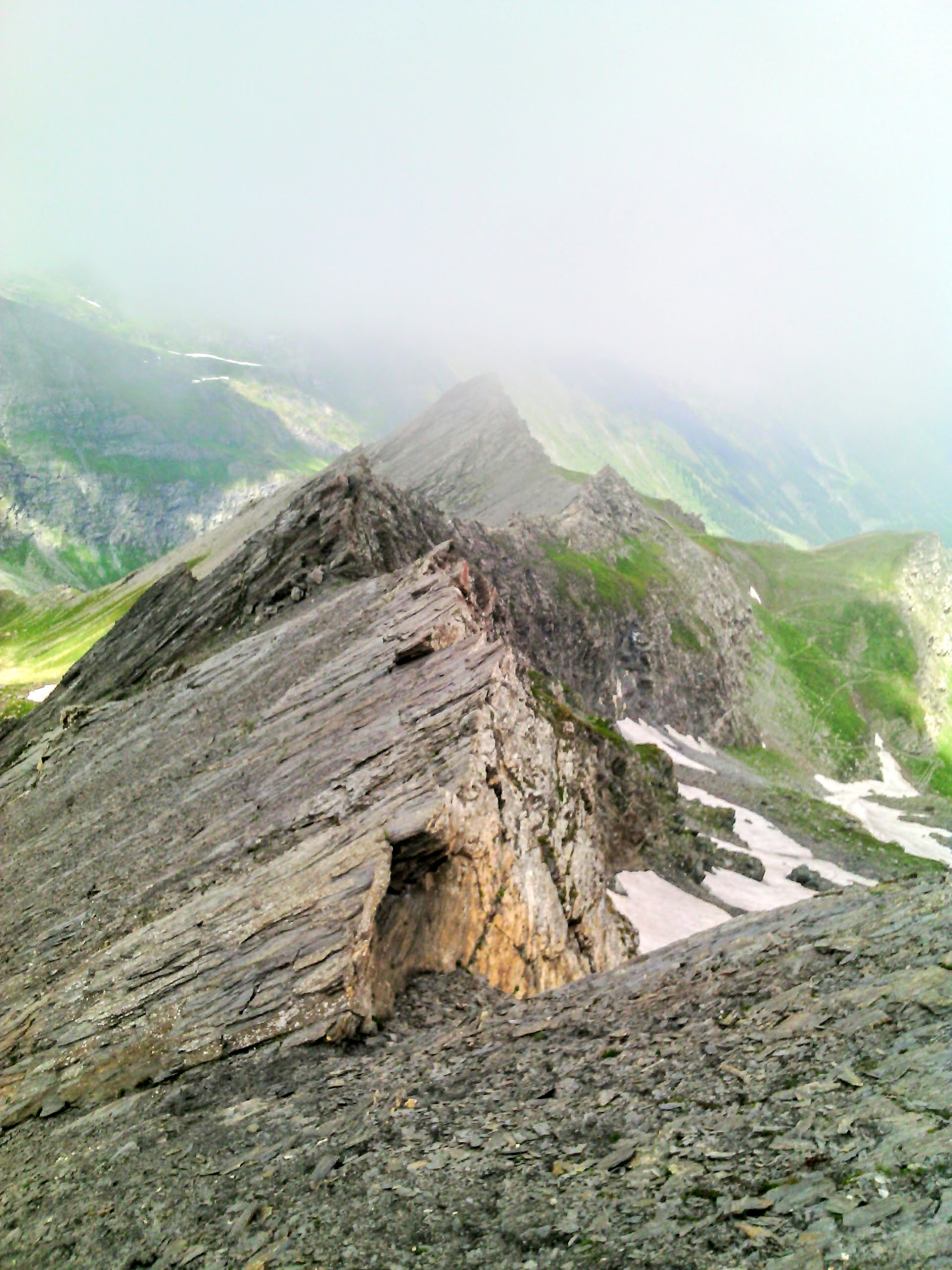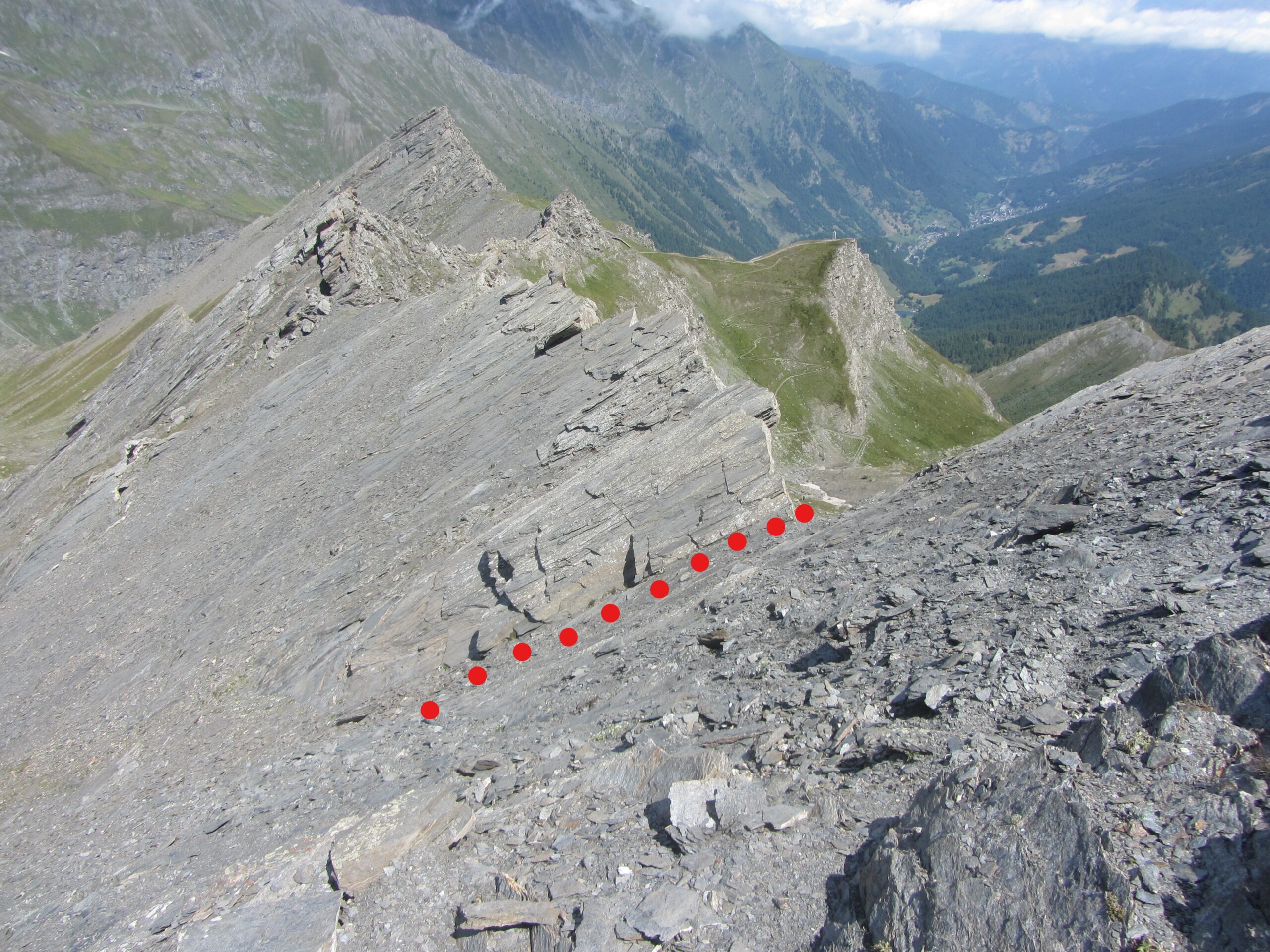 Seguendo l’ itinerario già ampiamente descritto per la salita alla Gran Guglia, giunti all’ omonimo colletto 2790 m deviando a sx ,seguire il filo della cresta fino in vetta, scavalcando i vari spuntoni, o costeggiarlo nel primo tratto sul versante NE per una mulattiera in rovina, in alcuni punti stretta ed esposta, da fare con piede fermo, ad una breccia, spostarsi sul versante Ovest (Lato rifugio lago verde) e per detriti o nevai in direzione della vetta.
