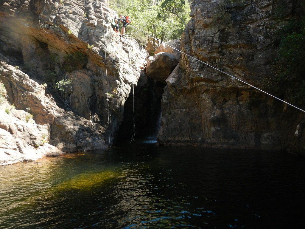 Dal tornante si cammina 2′, subito inforrato con salti taboga e bei passaggi, la parte centrale più discontinua con disarr. e rare calatine, nel finale gran incassamento con una C22,si cammina 1h35 x uscire sul sentiero Mare a Mare Sud Dx