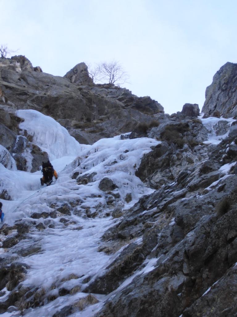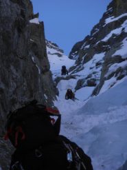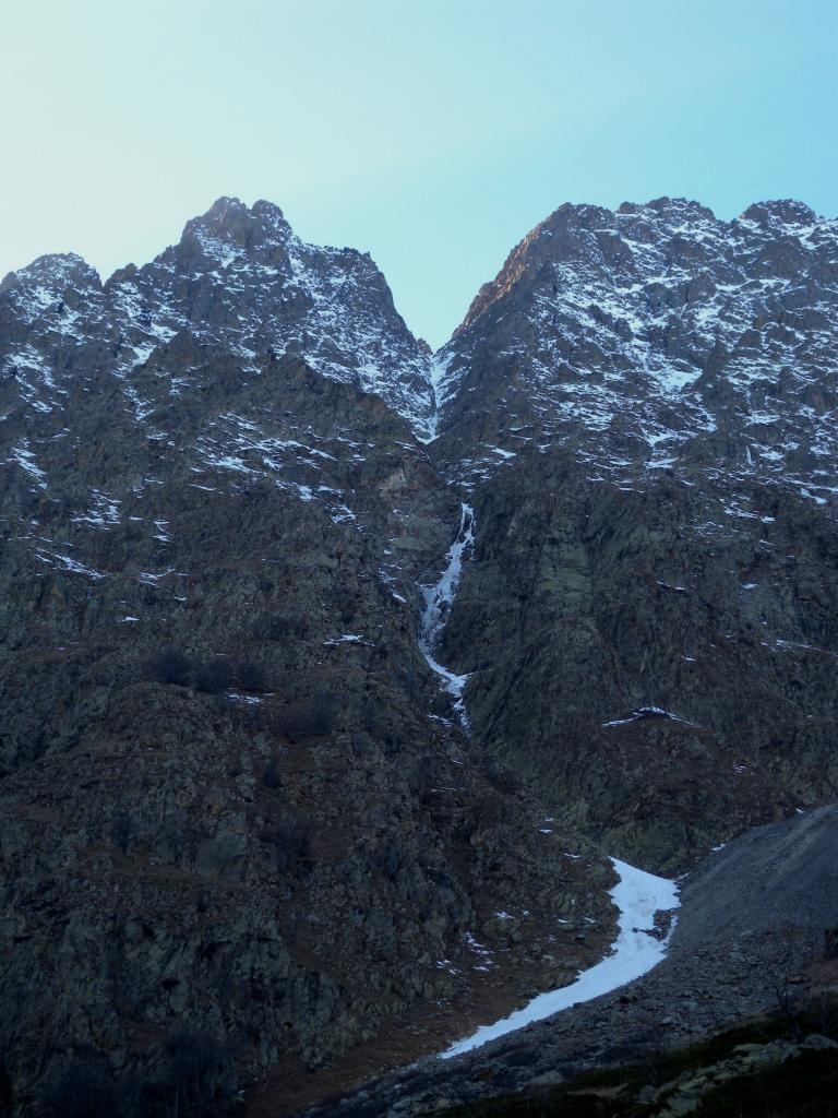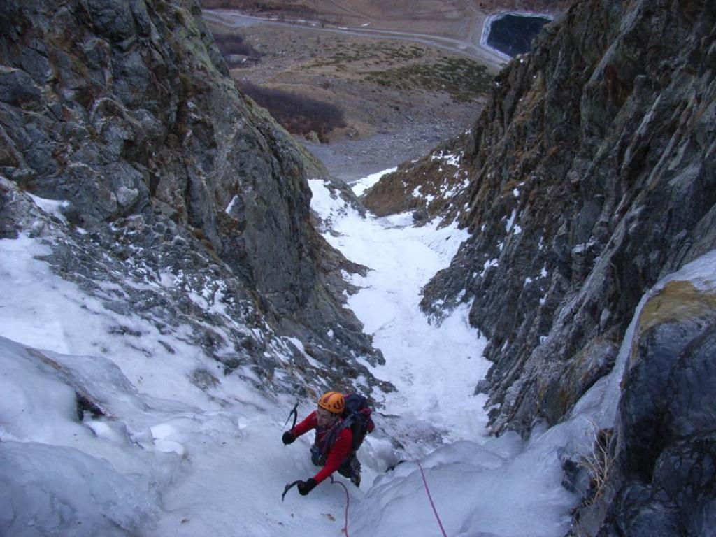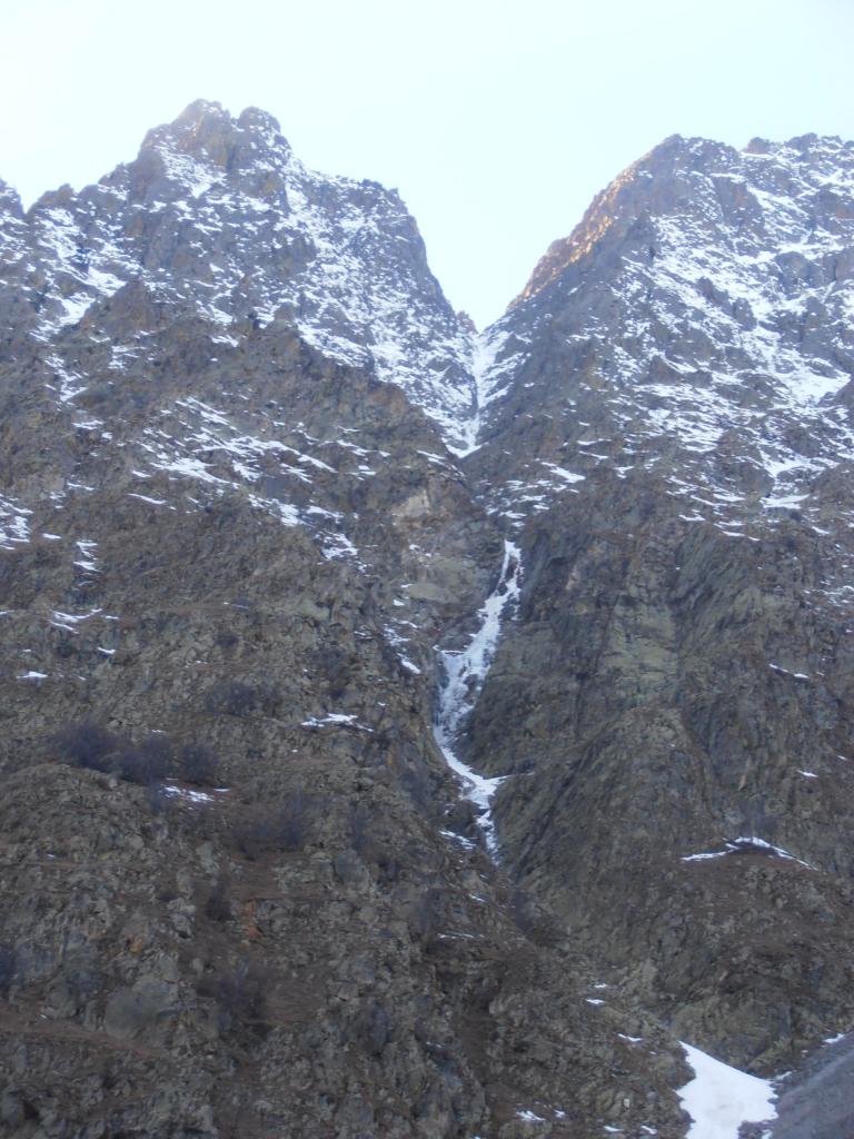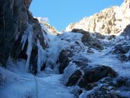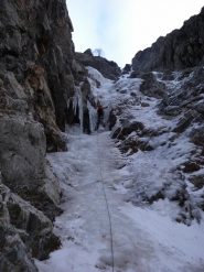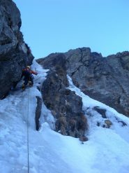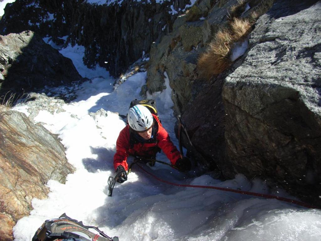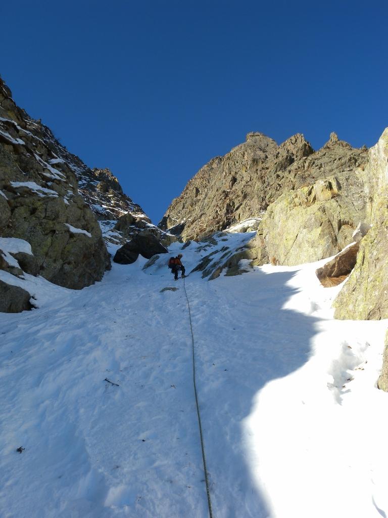 SALITA: il canale è caratterizzato da due colate di ghiaccio successive: la prima con pendenza a 70-80° (60m); la seconda molto più importante, alta 120 m, superabile con tre lunghezze di corda a 75-90° a seconda del percorso scelto. Poi il canale è percorribile su neve e qualche salto di ghiaccio, fino alla forcella a quota 2500.