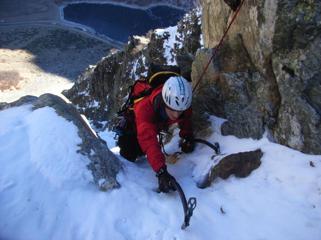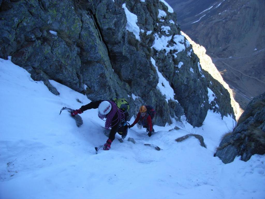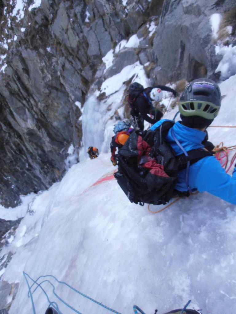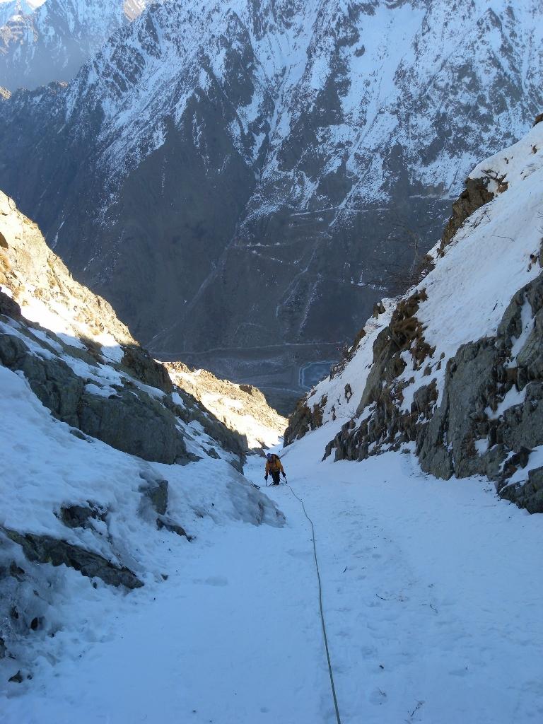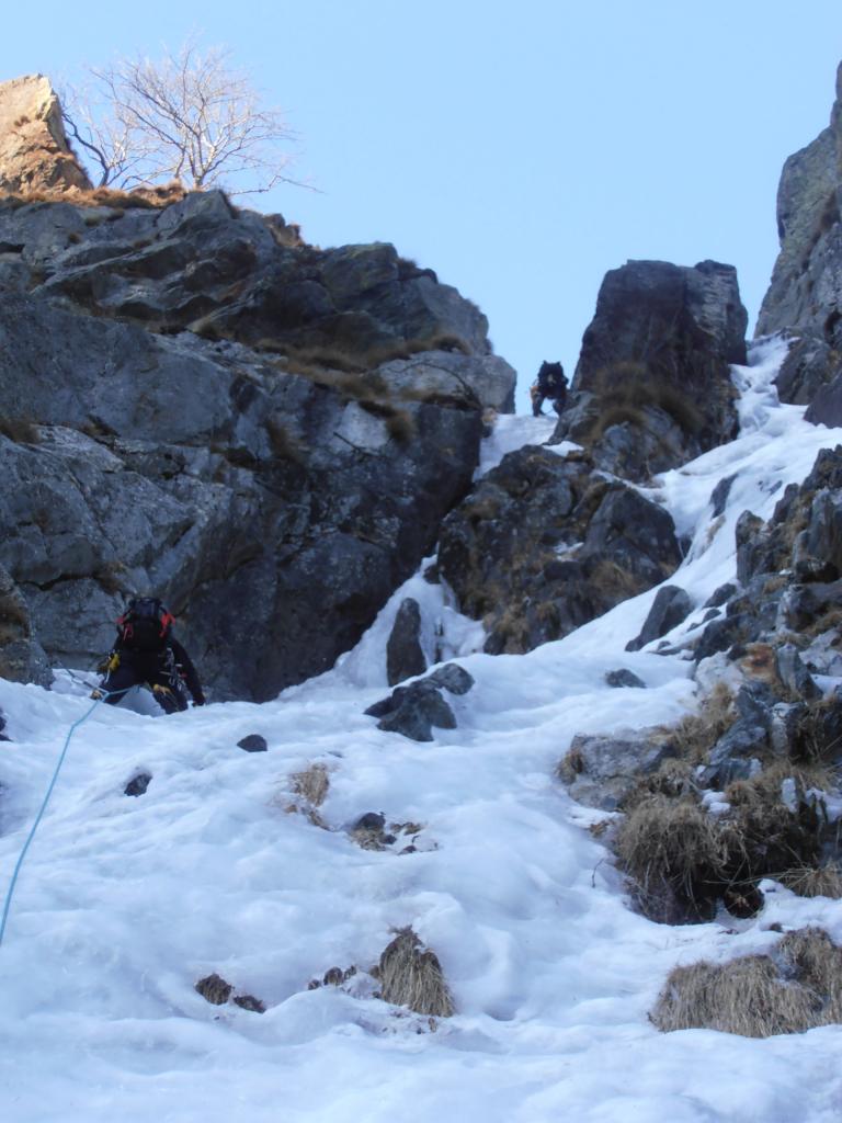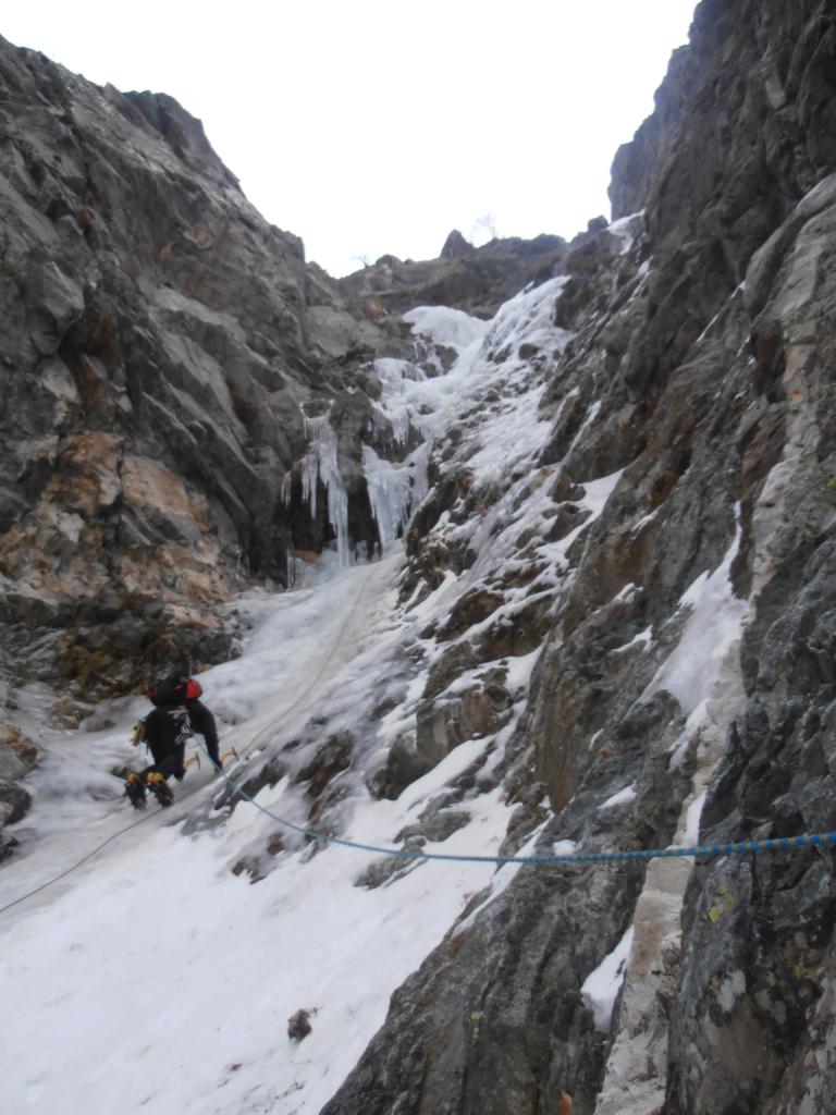 SALITA: il canale è caratterizzato da due colate di ghiaccio successive: la prima con pendenza a 70-80° (60m); la seconda molto più importante, alta 120 m, superabile con tre lunghezze di corda a 75-90° a seconda del percorso scelto. Poi il canale è percorribile su neve e qualche salto di ghiaccio, fino alla forcella a quota 2500.