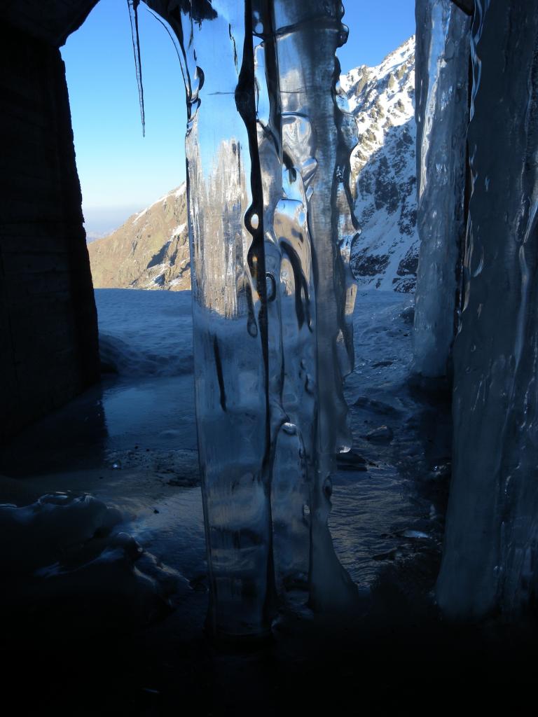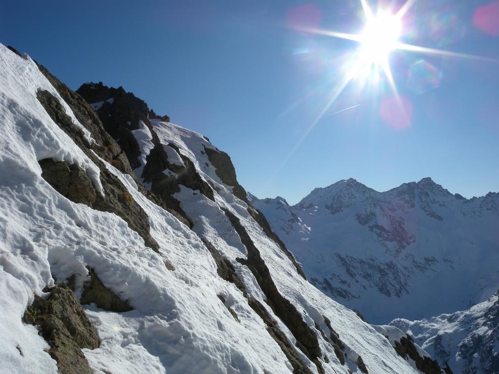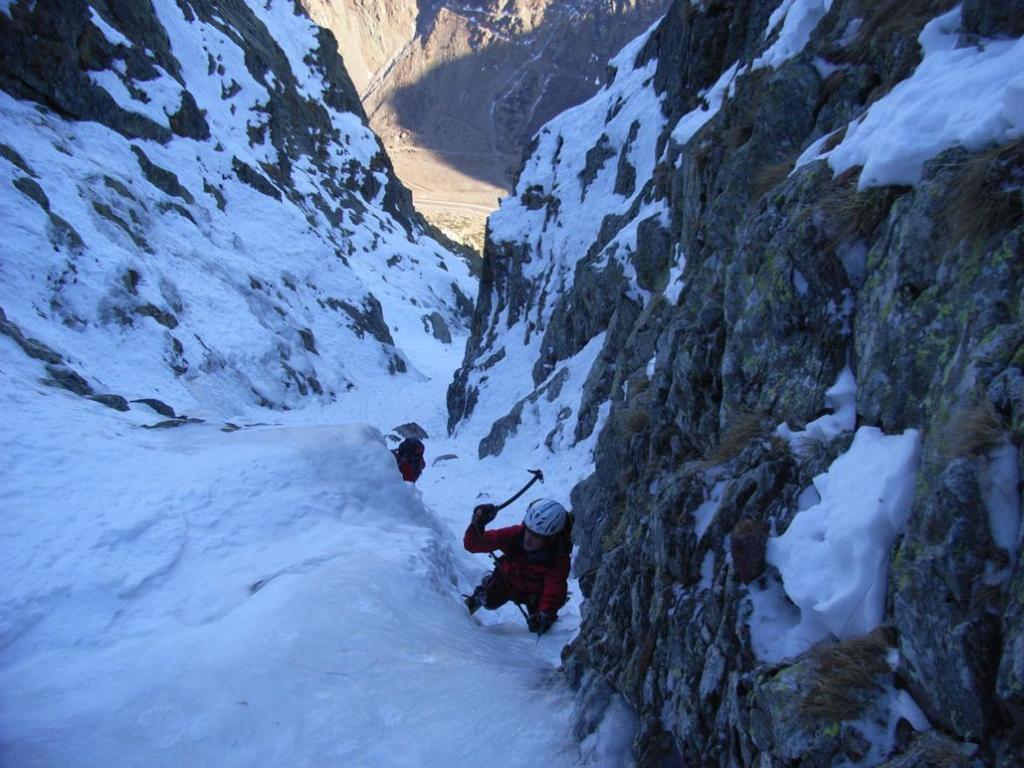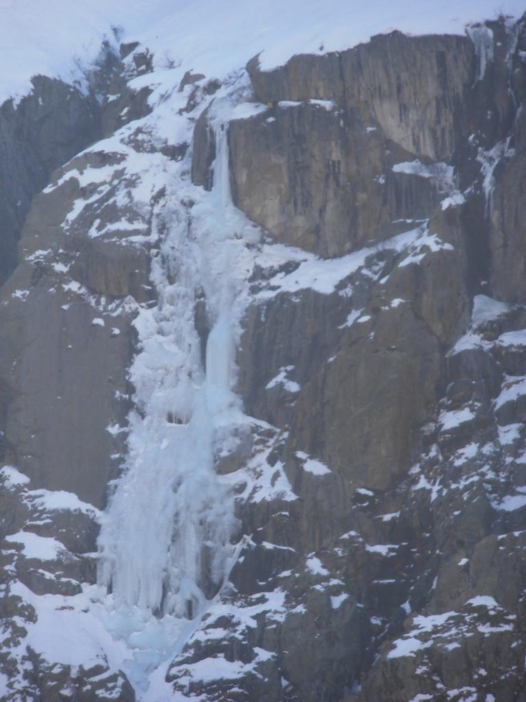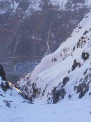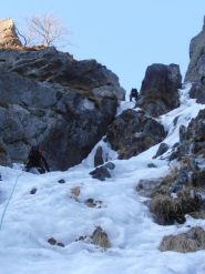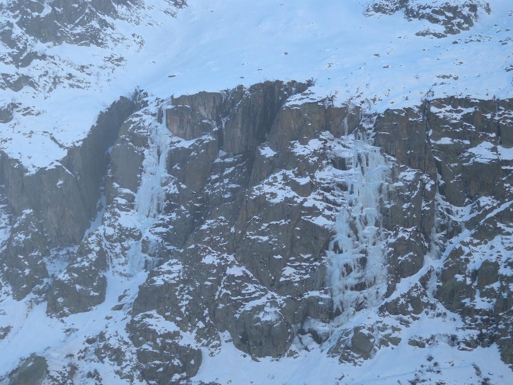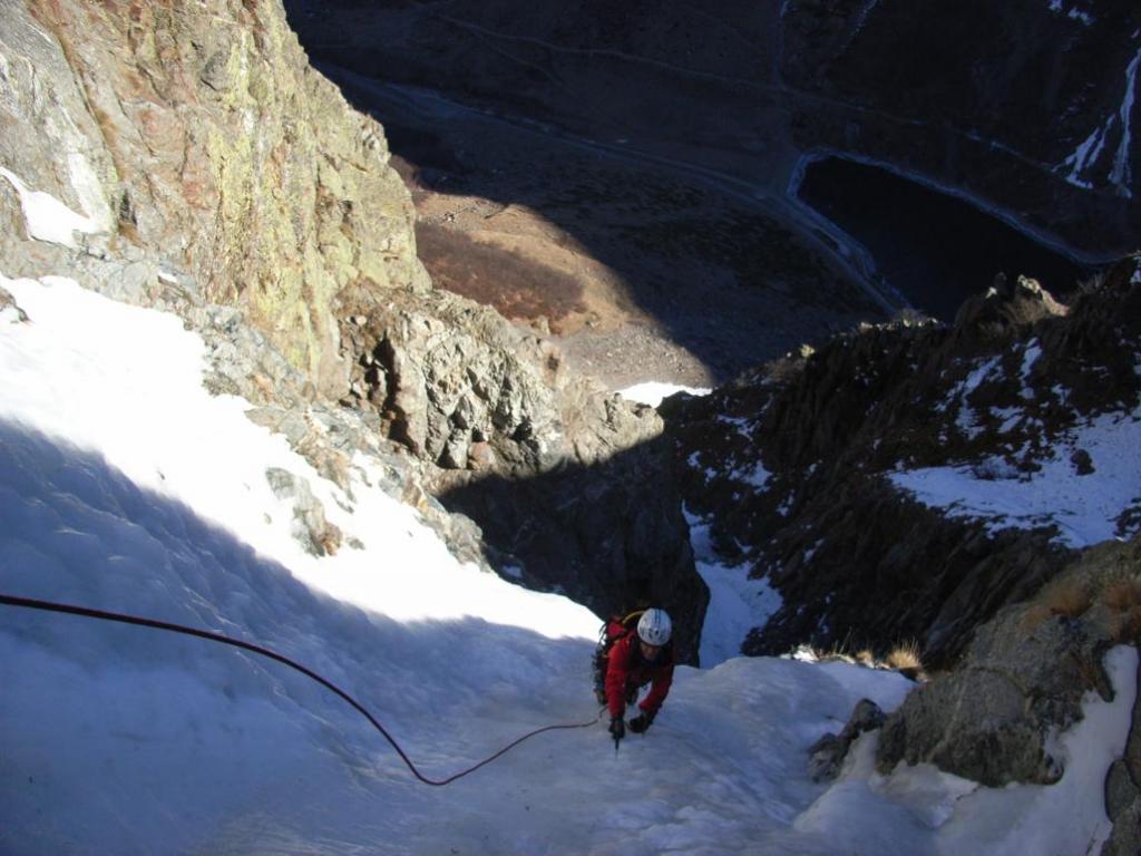 SALITA: il canale è caratterizzato da due colate di ghiaccio successive: la prima con pendenza a 70-80° (60m); la seconda molto più importante, alta 120 m, superabile con tre lunghezze di corda a 75-90° a seconda del percorso scelto. Poi il canale è percorribile su neve e qualche salto di ghiaccio, fino alla forcella a quota 2500.