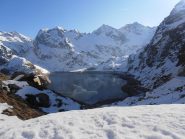 DISCESA: per pendii, fino a reperire il sentiero che sale al colle del Chiapus: seguirlo fino alla diga e poi a valle per il sentiero estivo.