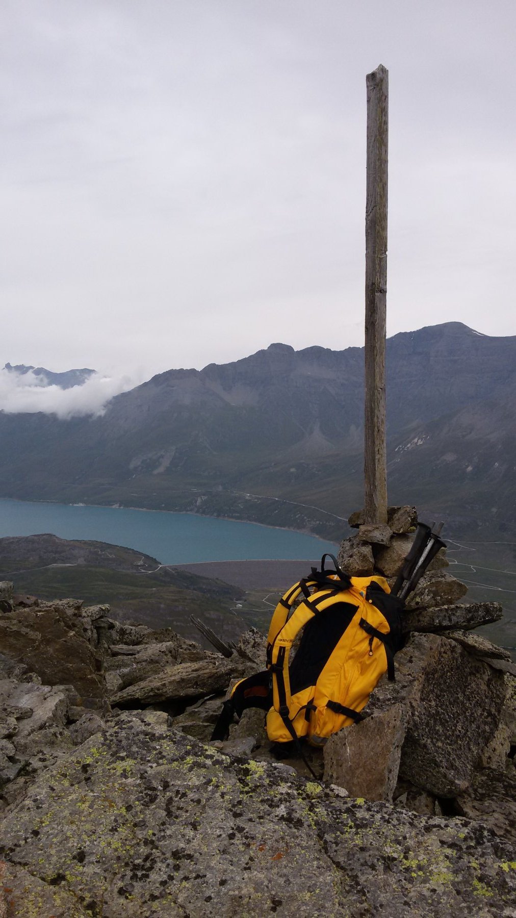 Difficile piazzare protezioni veloci per la conformazione/compazzezza della roccia. In vetta omettone con palo di legno e bel panorama zona Moncenisio.