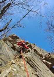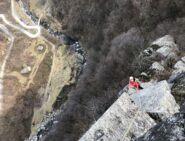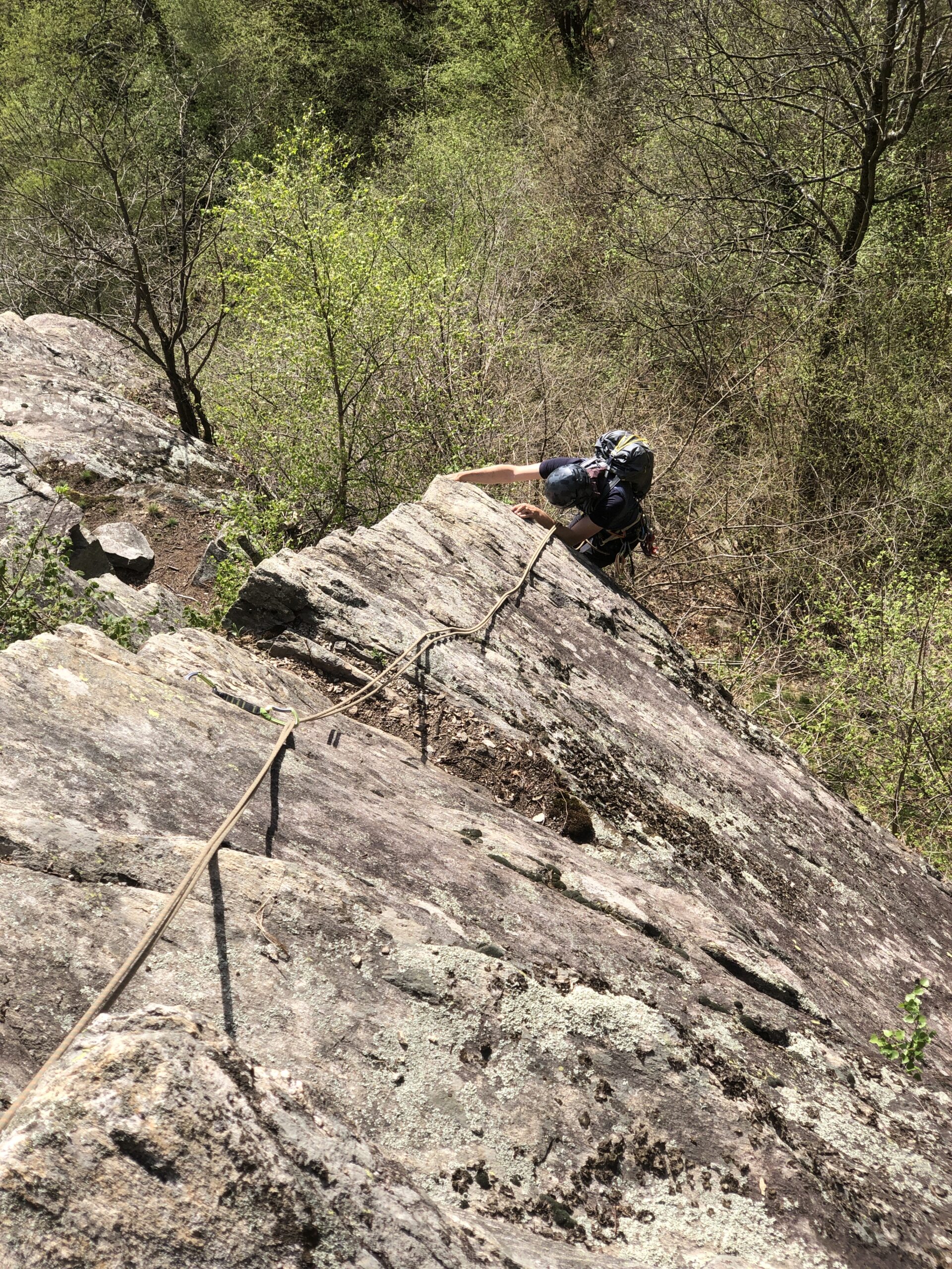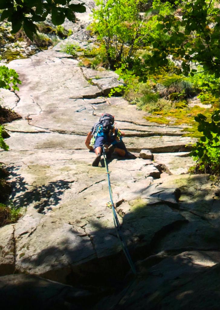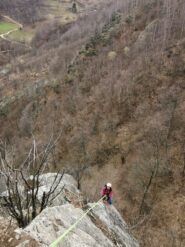 DISCESA: Due doppie sulla parete finale e poi a piedi nel canalone fino all’attacco della via. (la prima doppia sul percorso di salita e la seconda in parte fuori via con un tratto nel vuoto) .