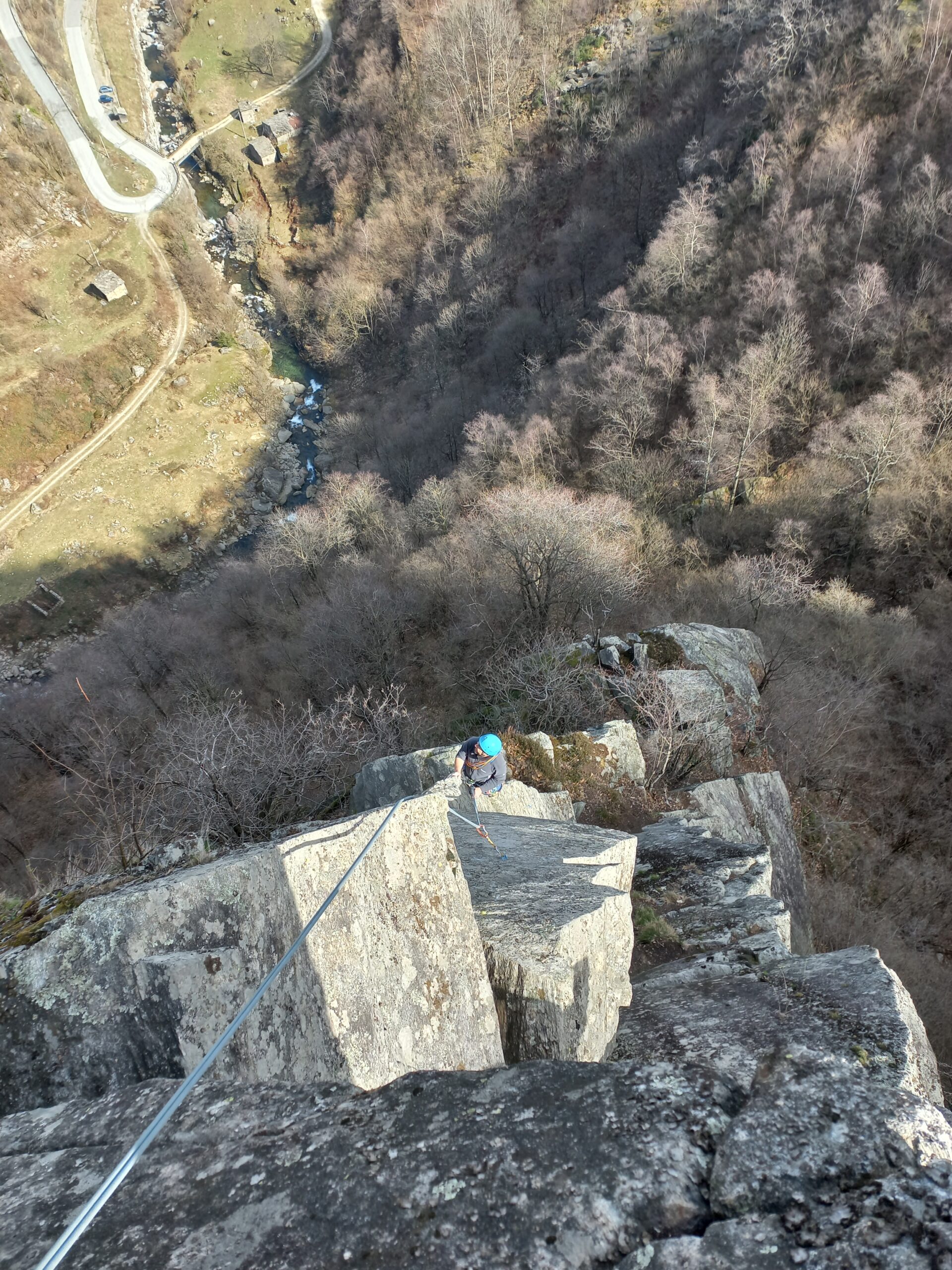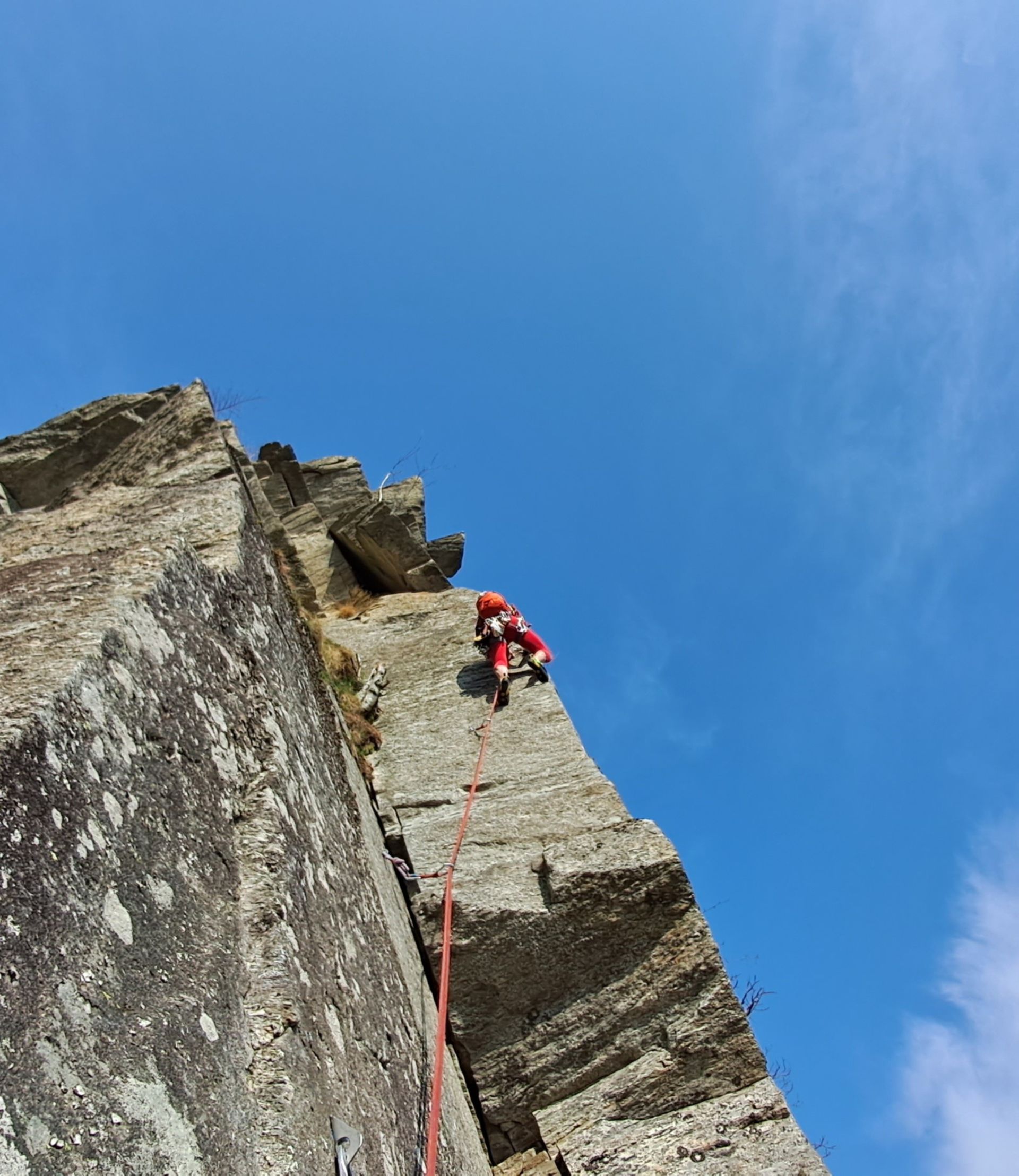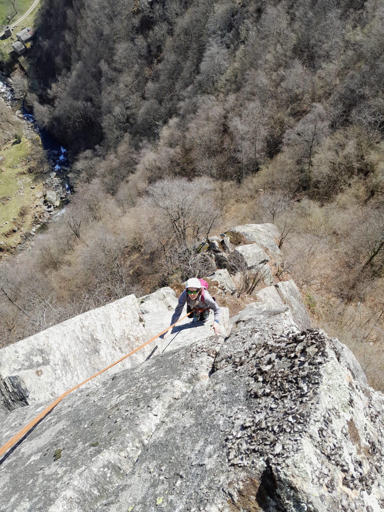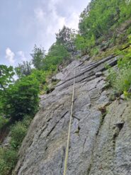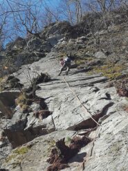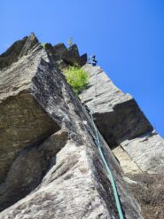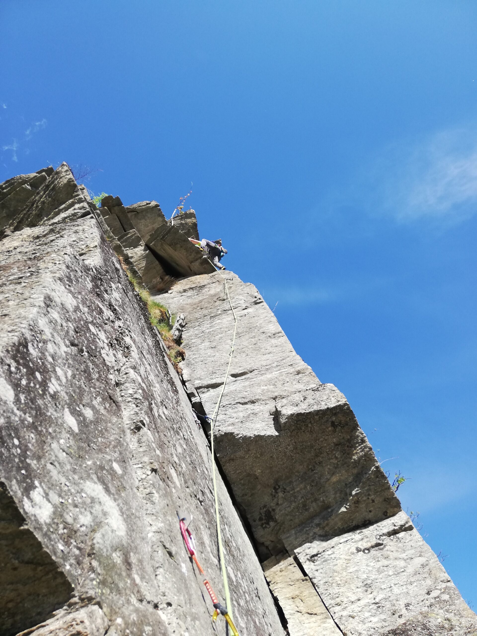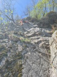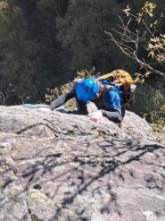 - L1) Superare un diedro con uscita leggermente strapiombante e continuare sullo spigolo a sinistra (5b)