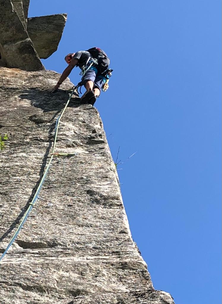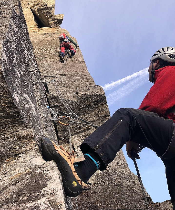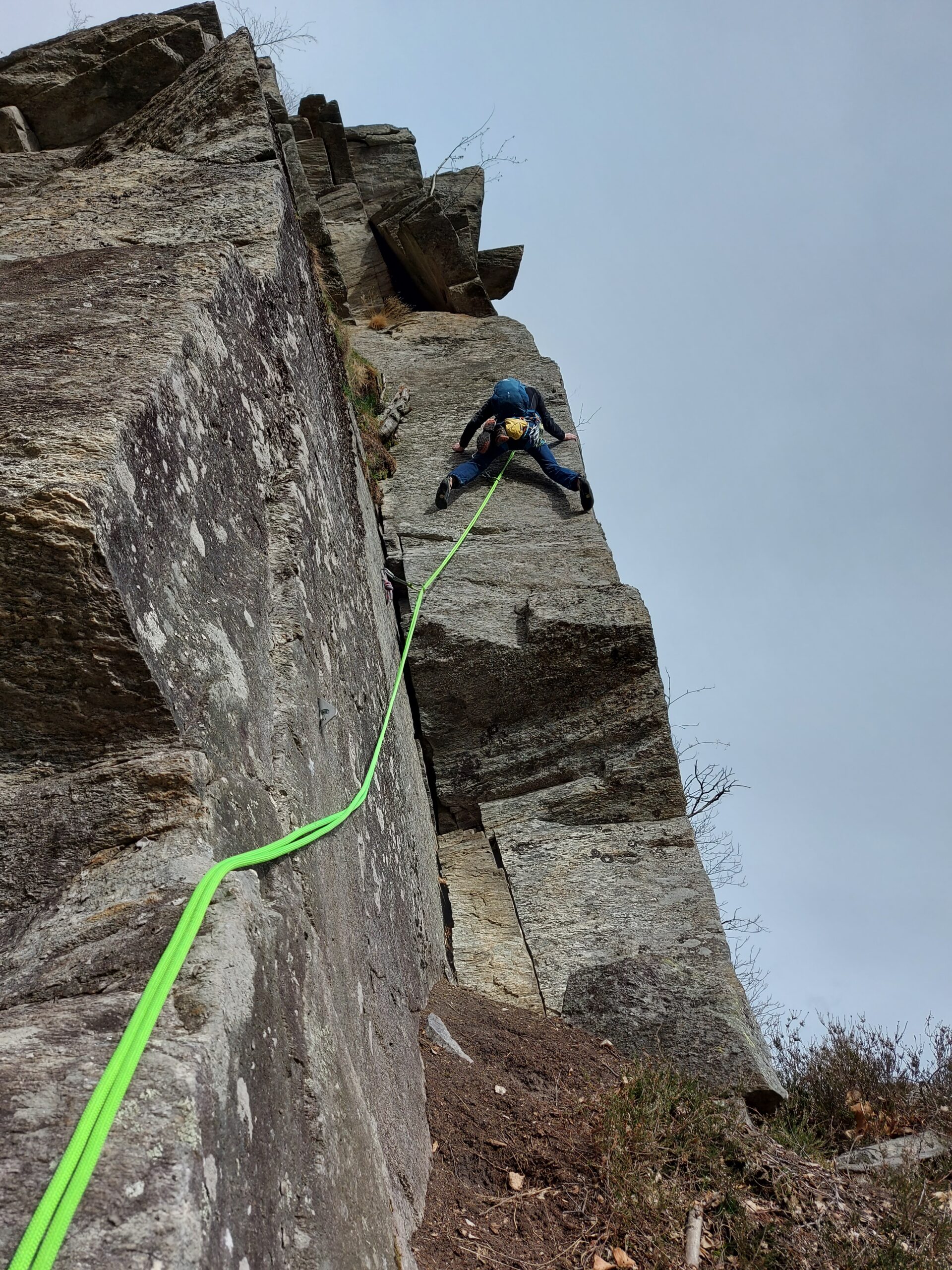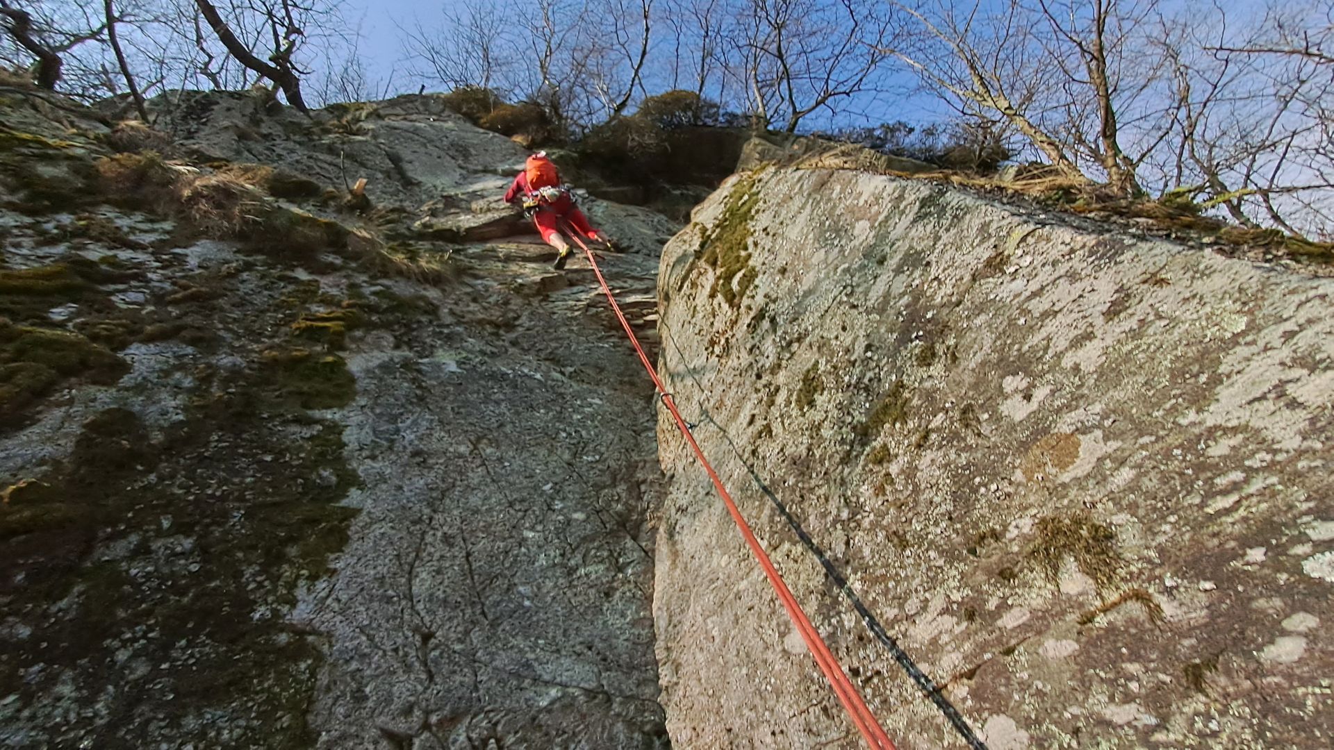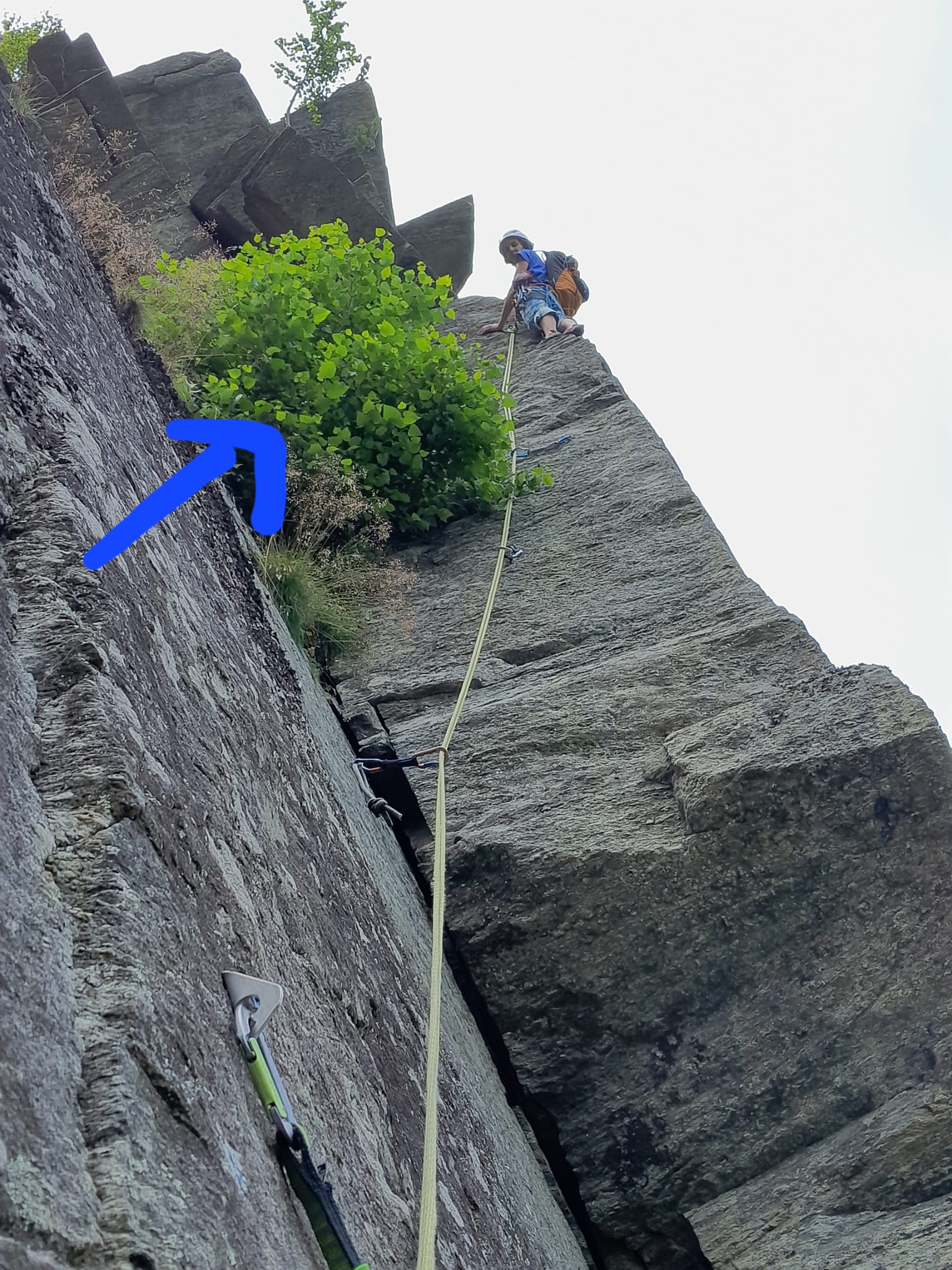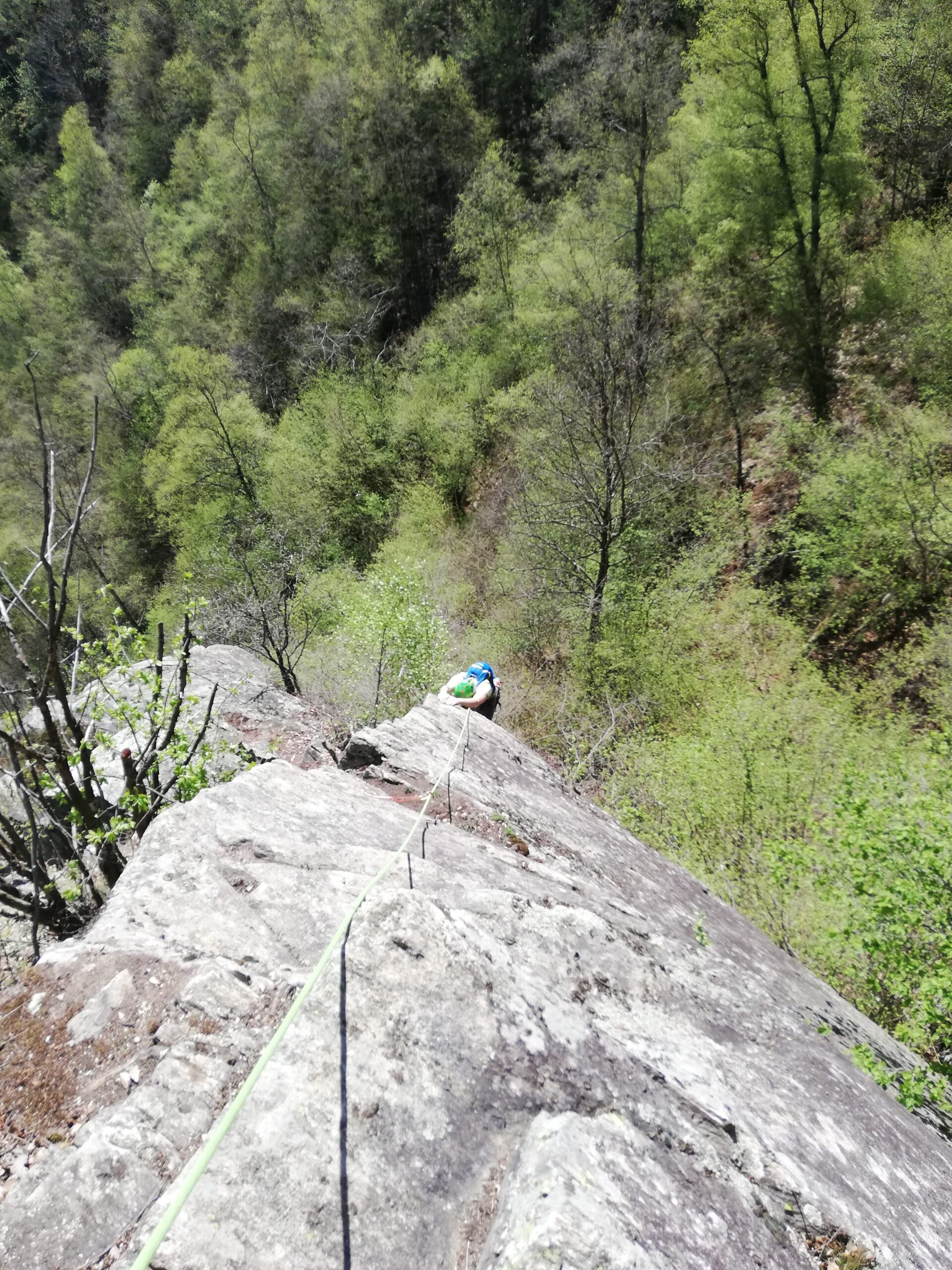 - L1) Superare un diedro con uscita leggermente strapiombante e continuare sullo spigolo a sinistra (5b)