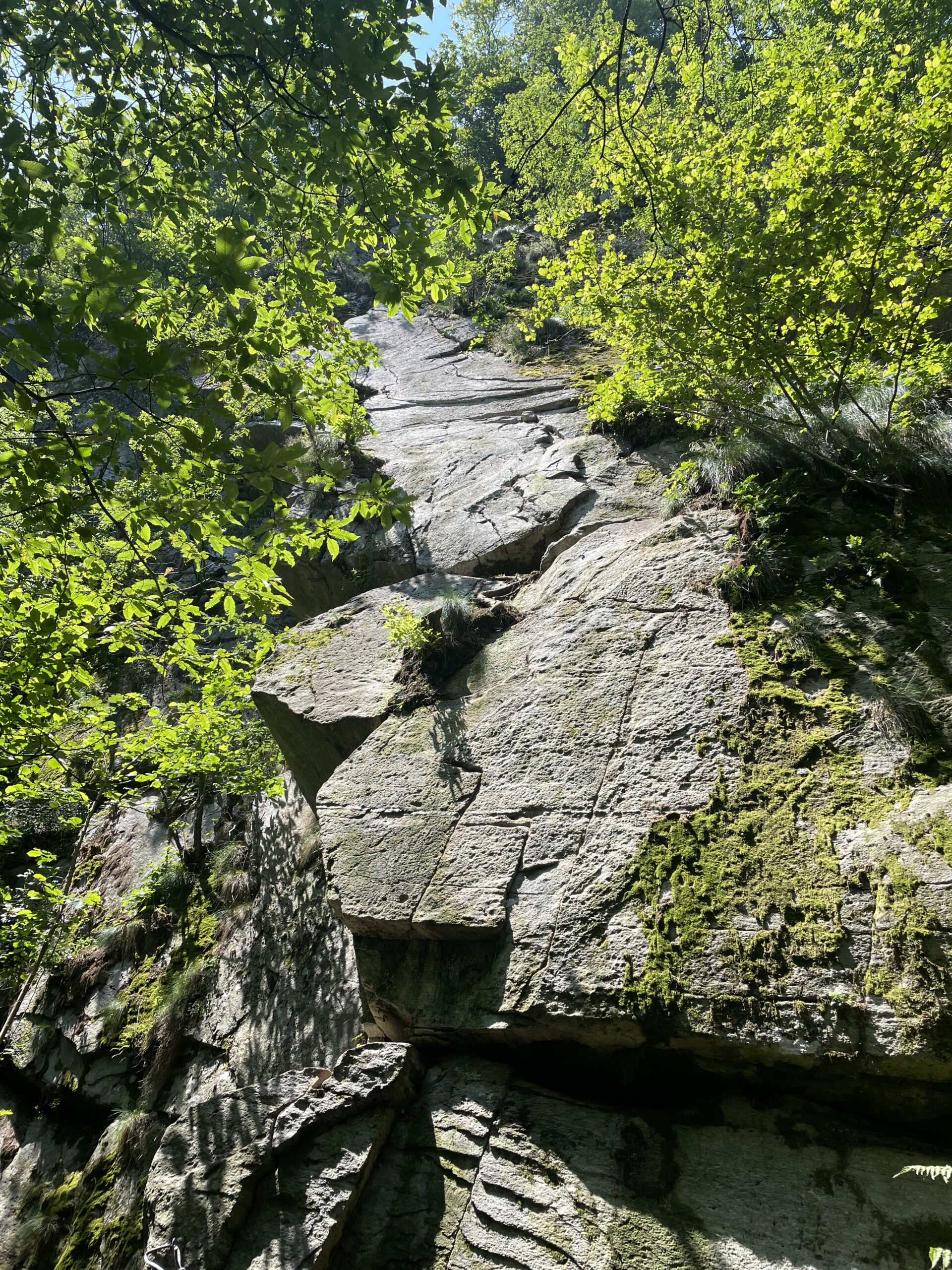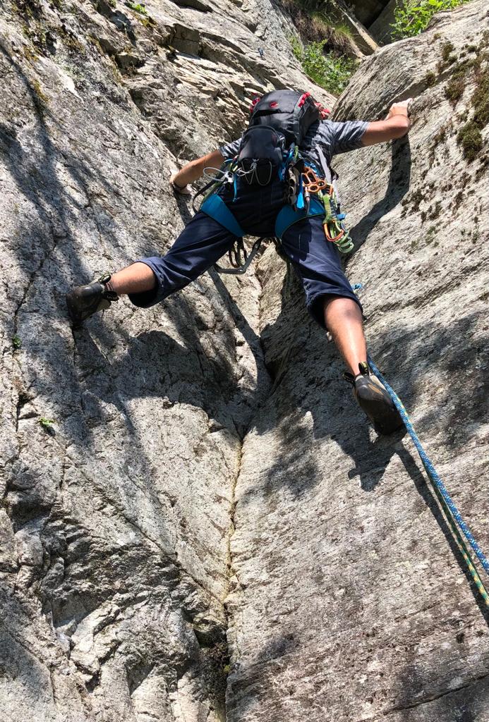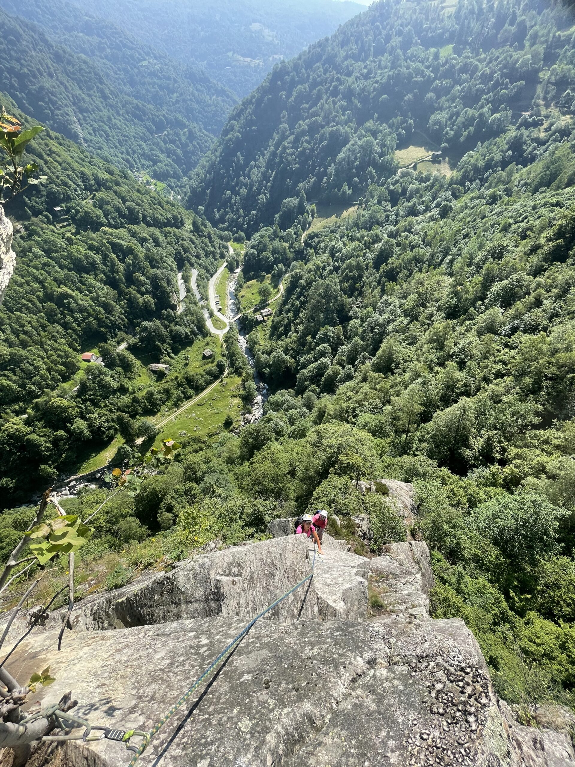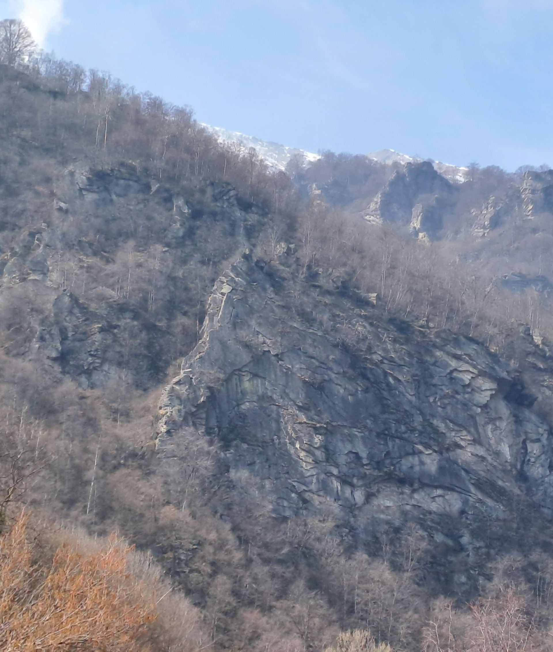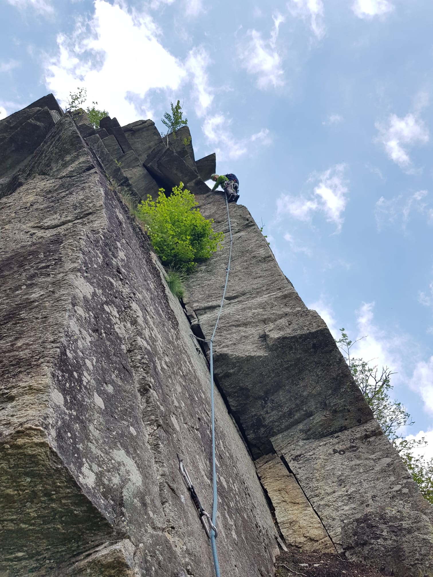 - L1) Superare un diedro con uscita leggermente strapiombante e continuare sullo spigolo a sinistra (5b)
