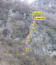 Difficoltà: TD- max 6a con breve tratto di 6b azzerabile (5b obblig.).