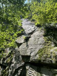 Portarsi sul colletto a monte di questo sperone e scendere sul versante opposto seguendo per un tratto un vecchio sentiero e poi direttamente nel bosco verso l’attacco delle via (segni di vernice e ometti).