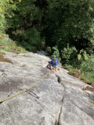 - L6) Superare un breve spigolo verticale poi una striscia di placche inclinate fino alla base di un evidente diedro ( 5c, breve tratto di 6b azzerabile)