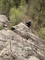 consente di scendere nel canalone e di portarsi alla base della parete superiore.