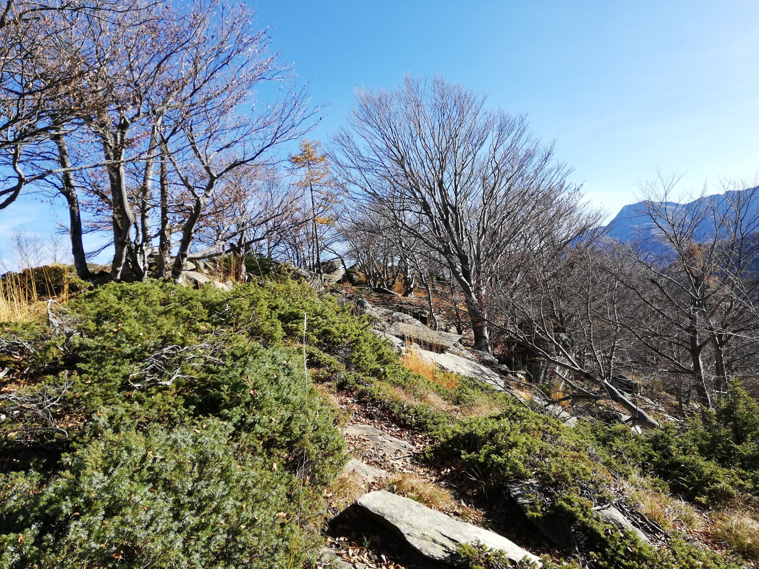 Nei pressi di una curva si trova il bivio con una mulattiera riportata sulle cartine solo come traccia ma in realtà larga e ben conservata che, al ritorno, riporterà al fondovalle in corrispondenza della diramazione sterrata per Podio dal quale infine si rientrerà a Bobbio lungo il sentiero di Sibaud.