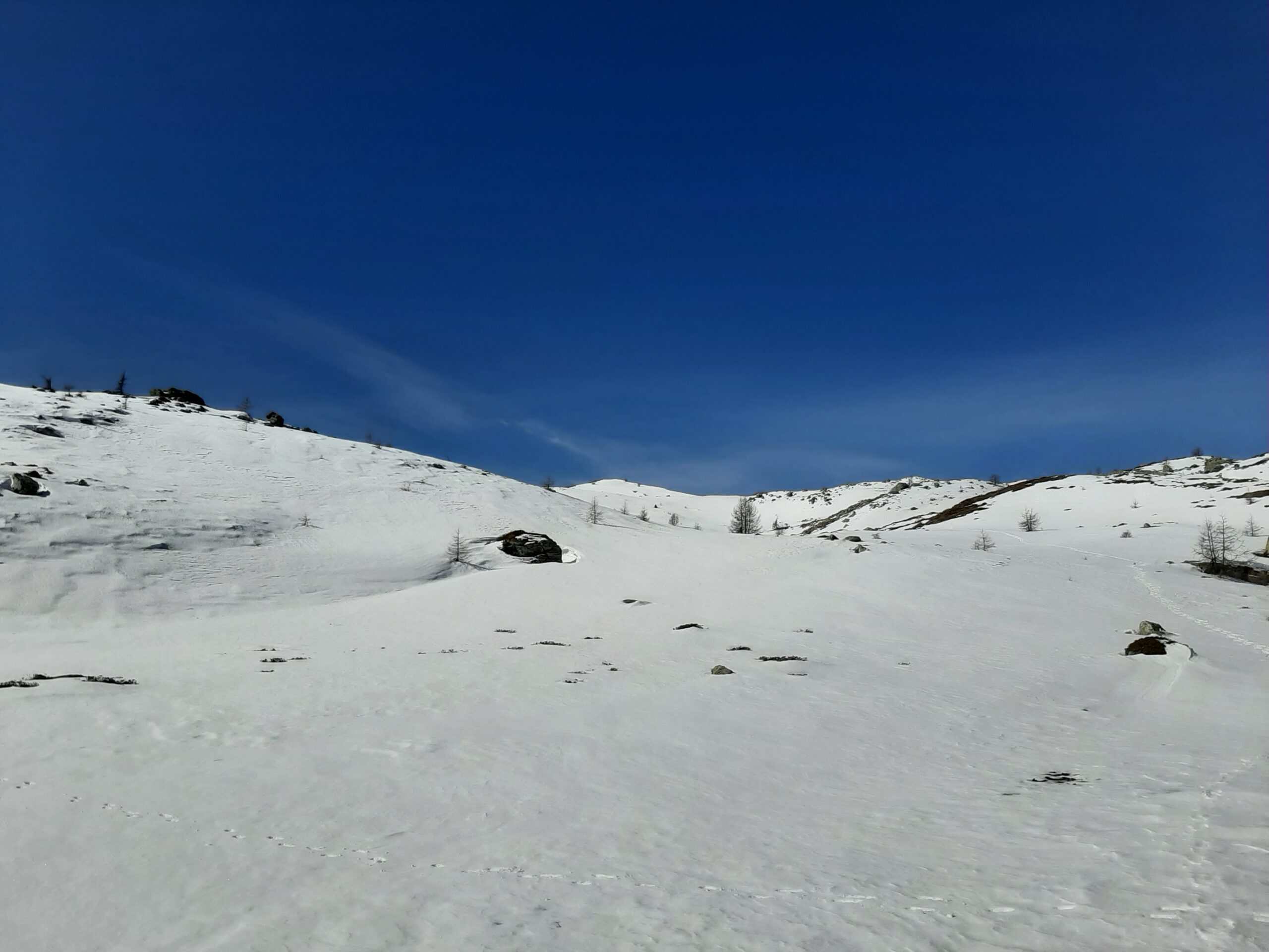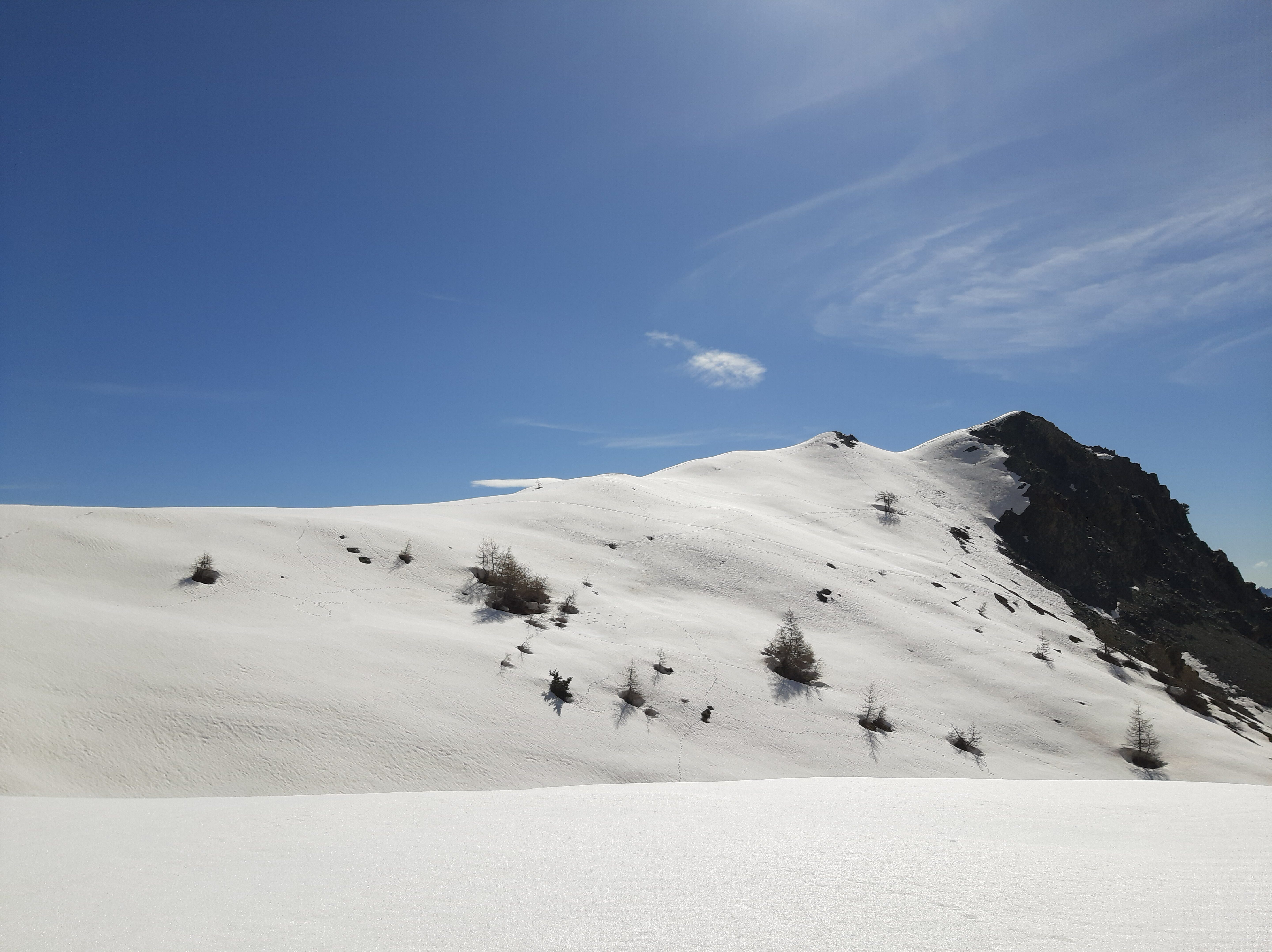 Da qui il percorso rimanente è molto evidente, con la vetta di fronte in direzione sud. Si raggiunge un rudere di alpeggio 2176 m. Oltre si apre il pendio finale, che si può risalire direttamente (moderata pendenza), oppure aggirare a destra raggiungendo un colletto. Da qui pochi metri lungo la comoda dorsale e si è in cima al Mont Ros 2289 m.