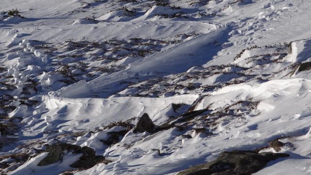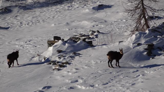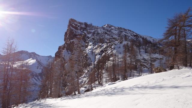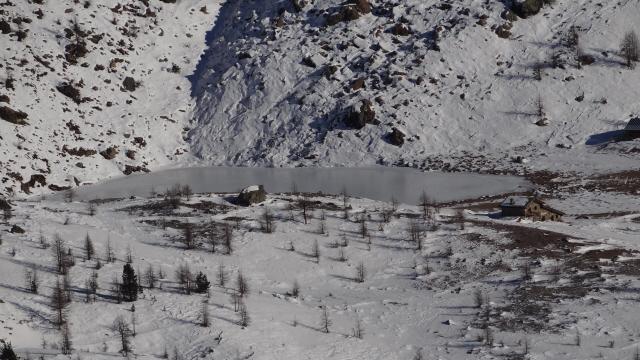 Nella zona di Dondena il vento ha spazzato parecchio, rimane pressoché possibile solo l’uso delle ciaspole. Saliti per il sentiero per il il lago Muffè (a tratti ghiacciato, possibile senza ciaspole) poi all’incrocio con il torrente svoltato a sx per il traverso che porta all’Alpe Vernoille e al lago.