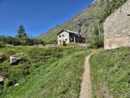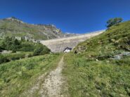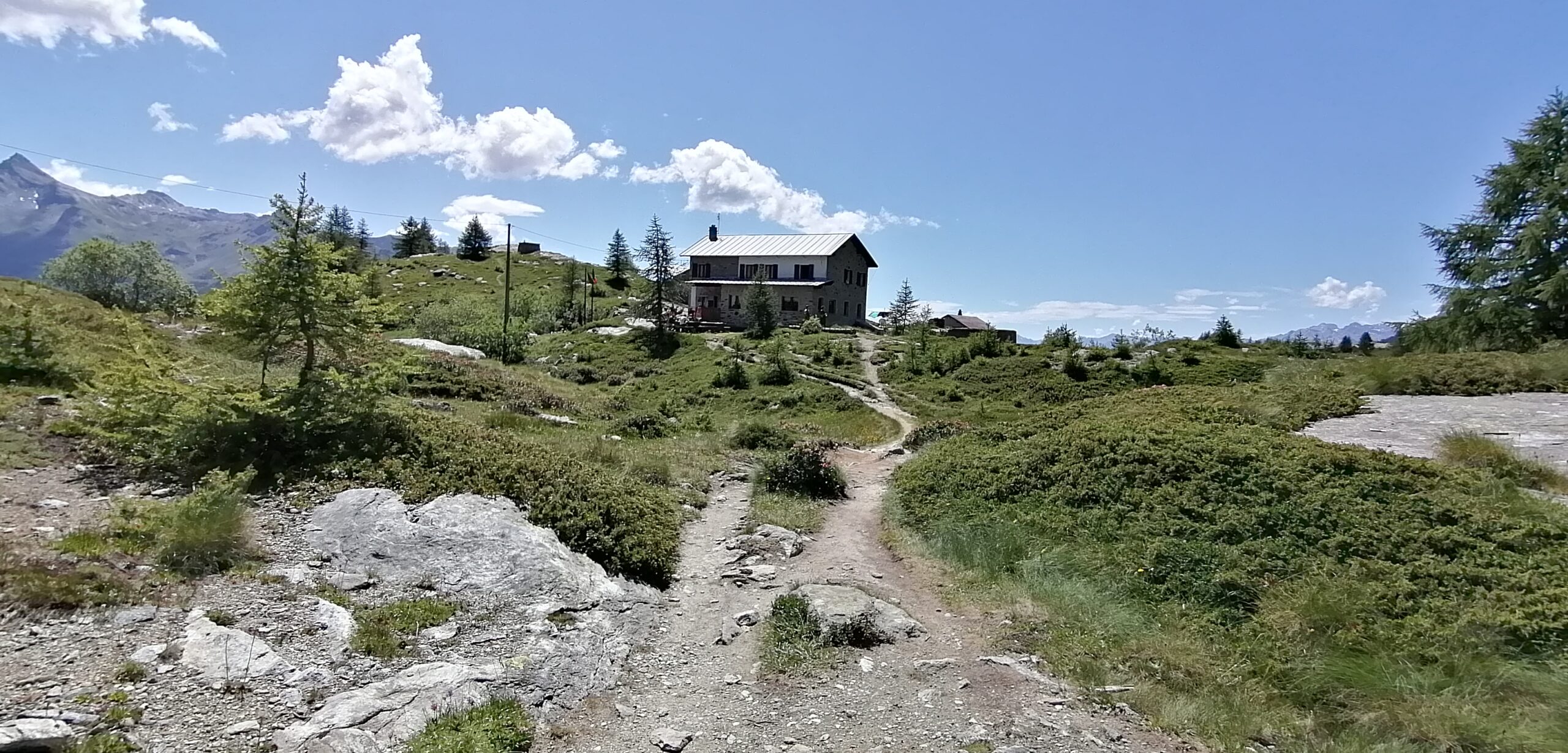 Dalla Chiesetta si trovano poco dopo le segnalazioni per il Lago di Cignana. Il sentiero sale tra le case (seguire frecce gialle) e poi nel bosco con tratti ripidi. Dopo una decina di minuti si incontra sulla sx il sentiero che sale da Moen. Si prosegue sulla mulattiera e si incontra l’Alta Via che arriva da Valtournenche. Ora si seguono le indicazioni dell’Alta Via 1. Si supera Promoron con i fabbricati della centrale. Si tralascia il sentiero 8 sulla destra e si prosegue in salita. Si oltrepassa una passerella e sulla destra appare la massicciata utilizzata un tempo per i binari della “ex linea ferroviaria” costruita al servizio della Diga. Si riprende a salire decisi nel bosco, superando una croce lignea, fino ad un falsopiano dove troviamo l’alpeggio di Falegnon. Superate le case si prosegue in direzione della diga seguendo sempre l’Alta via 1. Arrivati al Lago di Cignana a sx si trova il Rifugio Barmasse.