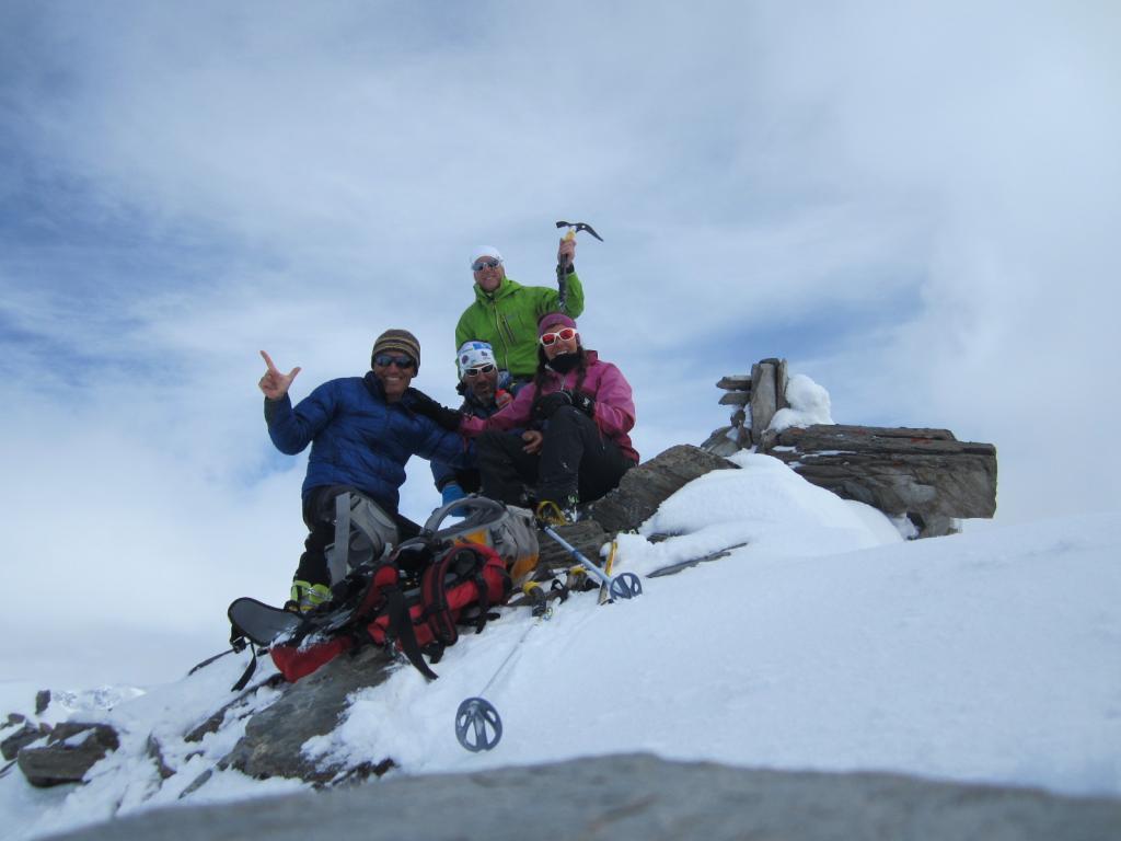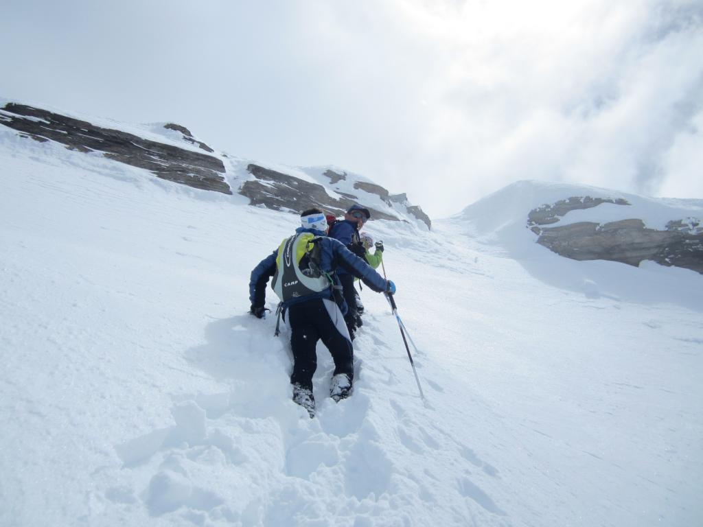 Saliti su provvidenziale traccia fino al colle di Giasson con tempo variabile; abbiamo quindi proseguito lungo la cresta molto innervata fino in vetta. La discesa si e’ rivelata meglio del previsto, in alto neve fresca umida comunque sciabile, in basso neve smollata pesante ma sempre sciabile, il bosco si scende e si sale ancora bene.