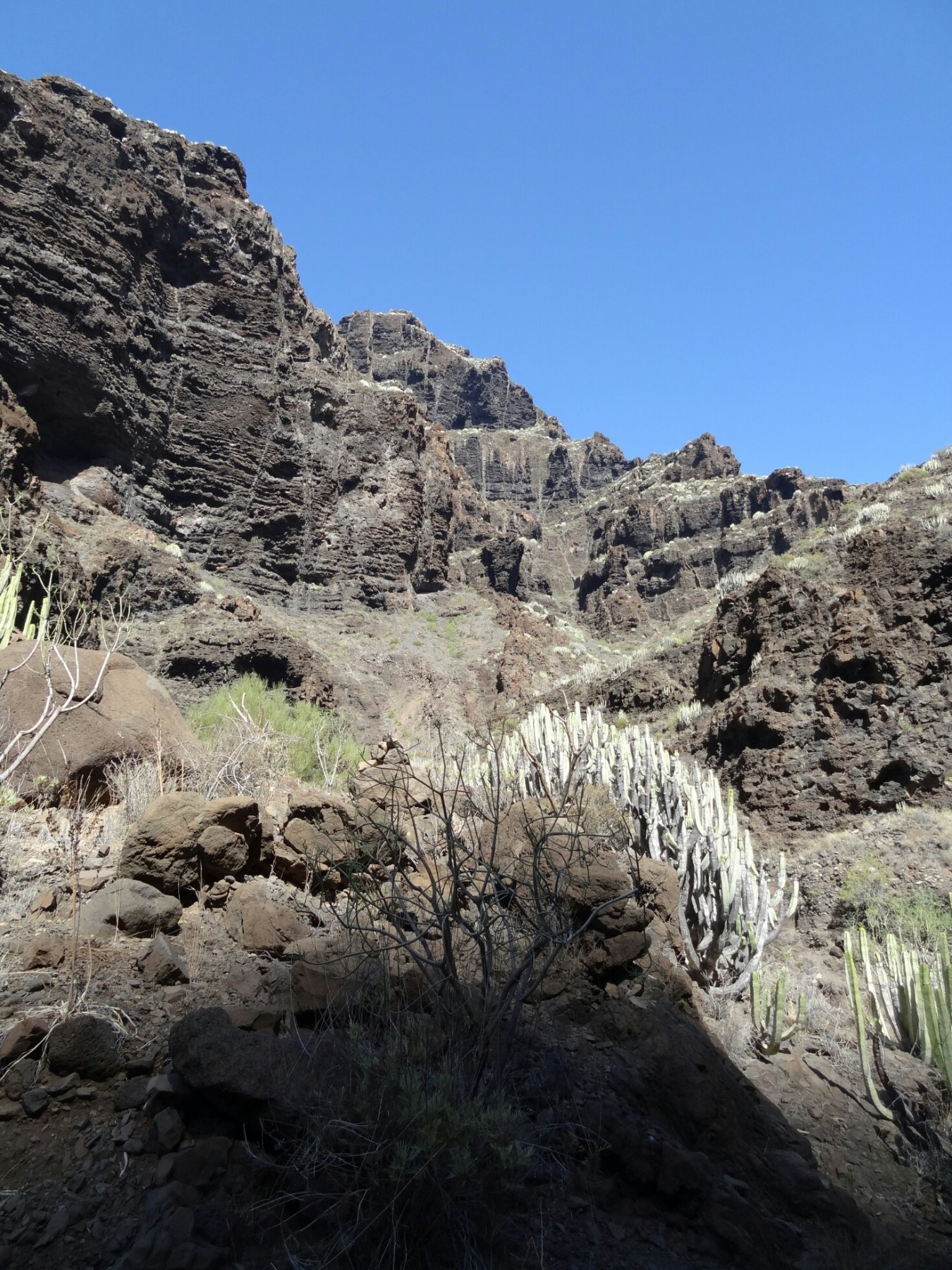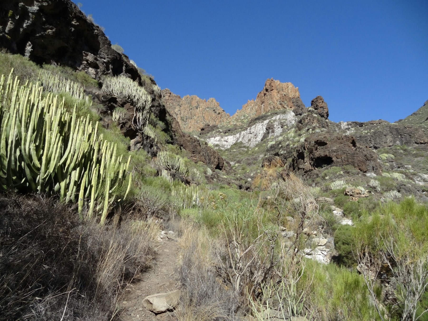 Dal termine in curva della Calle Tabaiba (possibilità di parcheggio), segure l’evidente traccia che con un paio di zigzag perde leggermente quota. Seguire il sentiero che ad un altezza di 150/200 metri slm attraversa la prima parte dell’impressionante scogliera che qui chiamano “Acantillado de Los Gigantes” e, già il nome rende l’idea delle dimensioni dei dirupi che si incontreranno. Vista la verticalità sembra impossibile continuare, invece il sentierino con dei sali e scendi sfugge alla gravità e superando alcuni speroni rocciosi porta ad una sorta di valle incassata chiamata appunto “barranco”. Il sentiero è continuamente segnalato da ometti e qualche bollo verde. Sul percorso si incontrano alcuni vaghi bivi, ma nell’incertezza bisogna seguire esclusivamente gli ometti.