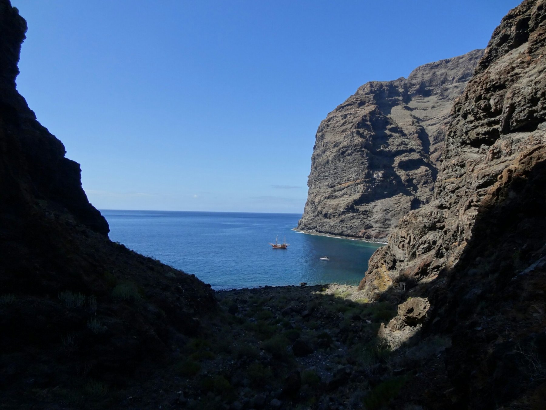 Usciti dalla galleria si buca sul Barranco Seco. Lunga valle che dalle alture di Santiago del Teide porta al mare. Qui si incontra il sentiero che lo attraversa. Scendere quindi verso sinistra e seguire anche qui i vari ometti che indicano il percorso più facile lungo entrambe le sponde del letto del torrente (secco). Dopo mezz’ora si è in vista della spiaggia. La spiaggia è composta da grossi sassi neri e non ha nulla di paradiso tropicale, ma comunque ha il fascino di piccolo paradiso isolato ed inesplorato. E’ possibile fare il bagno a patto di non rischiare di spaccarsi le gambe nella risacca. Consiglio di entrare in acqua con le scarpe