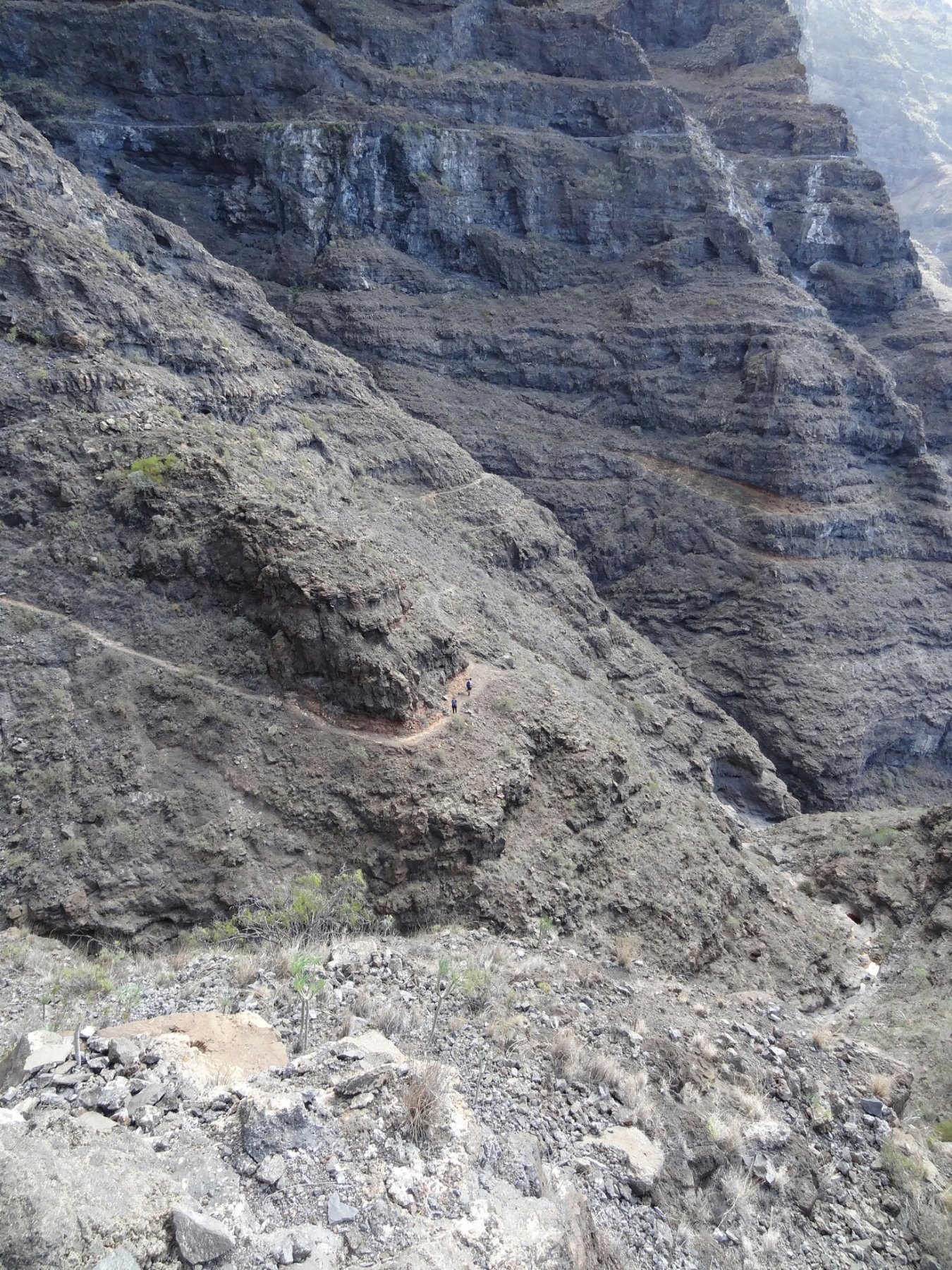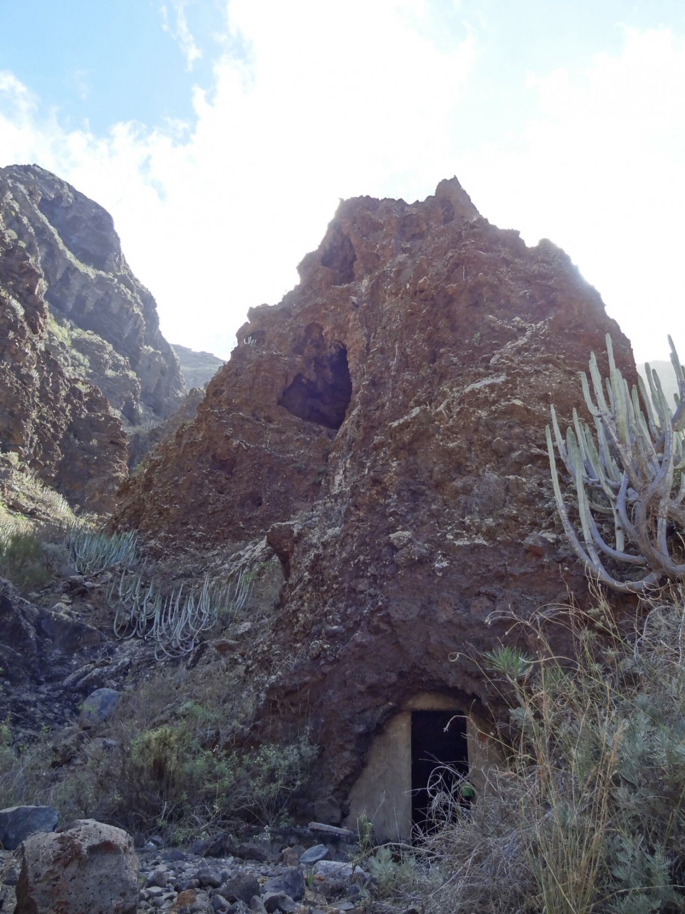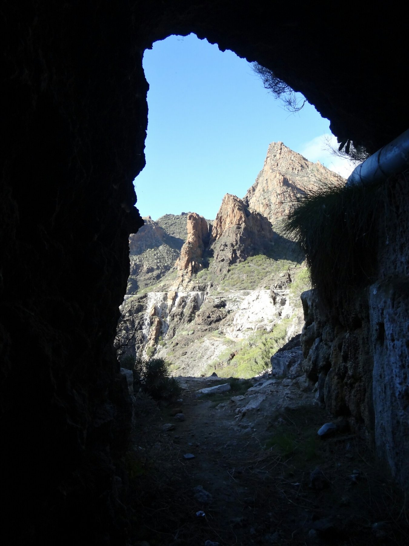 Dopo più o meno 300 metri di dislivello si incontra sulla sinistra una costruzione nella roccia. Continuare ancora per 20 minuti puntando ad una visibile canalina bianca che cinge tutto il barranco. Una volta raggiunta, seguirla verso destra (salendo) fino a trovare l’ingresso di una seconda galleria (più o meno 580m slm). Questa più angusta della prima e lunga all’incirca 1 chilometro. All’uscita del tunnel si torna nella civiltà. Infatti da qui è possibile vedere le case di Tamaimo ed estese piantagioni di banane. Qui la traccia si fa incerta. Continuare comunque in mezzo ai cactus fino a trovare un ben marcato sentiero in parte di porfido, chiamato Calle Reàl TF65 (bolli giallo e bianco). Ora senza problemi scendere per 500 metri di dislivello fino ad intercettare la strada che da Tamaimo porta a Los Gigantes e in un paio di km al punto di partenza.